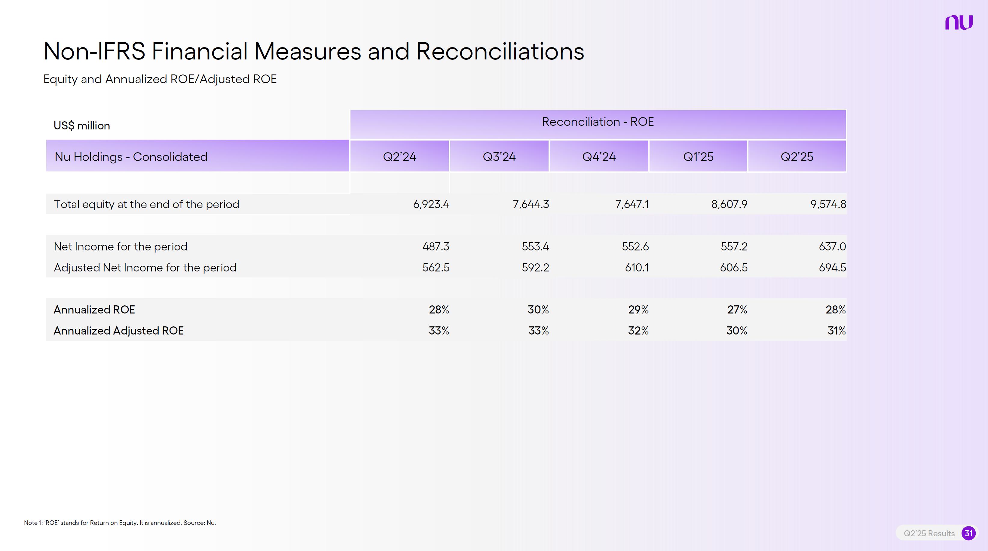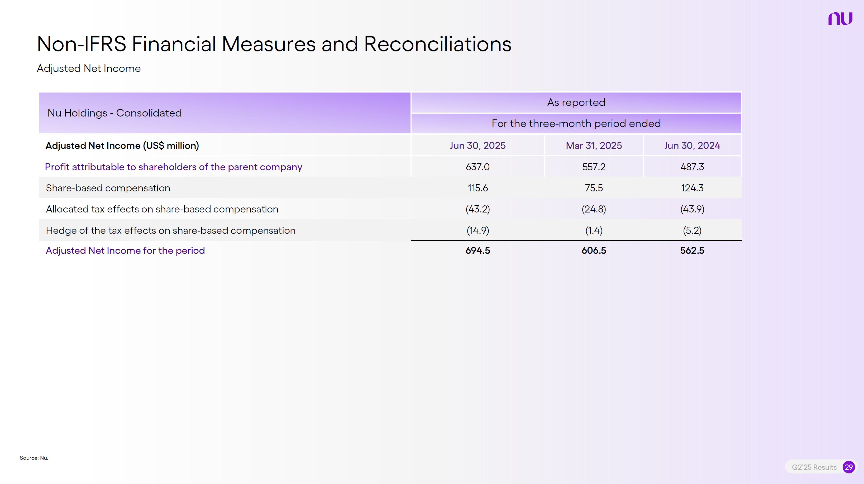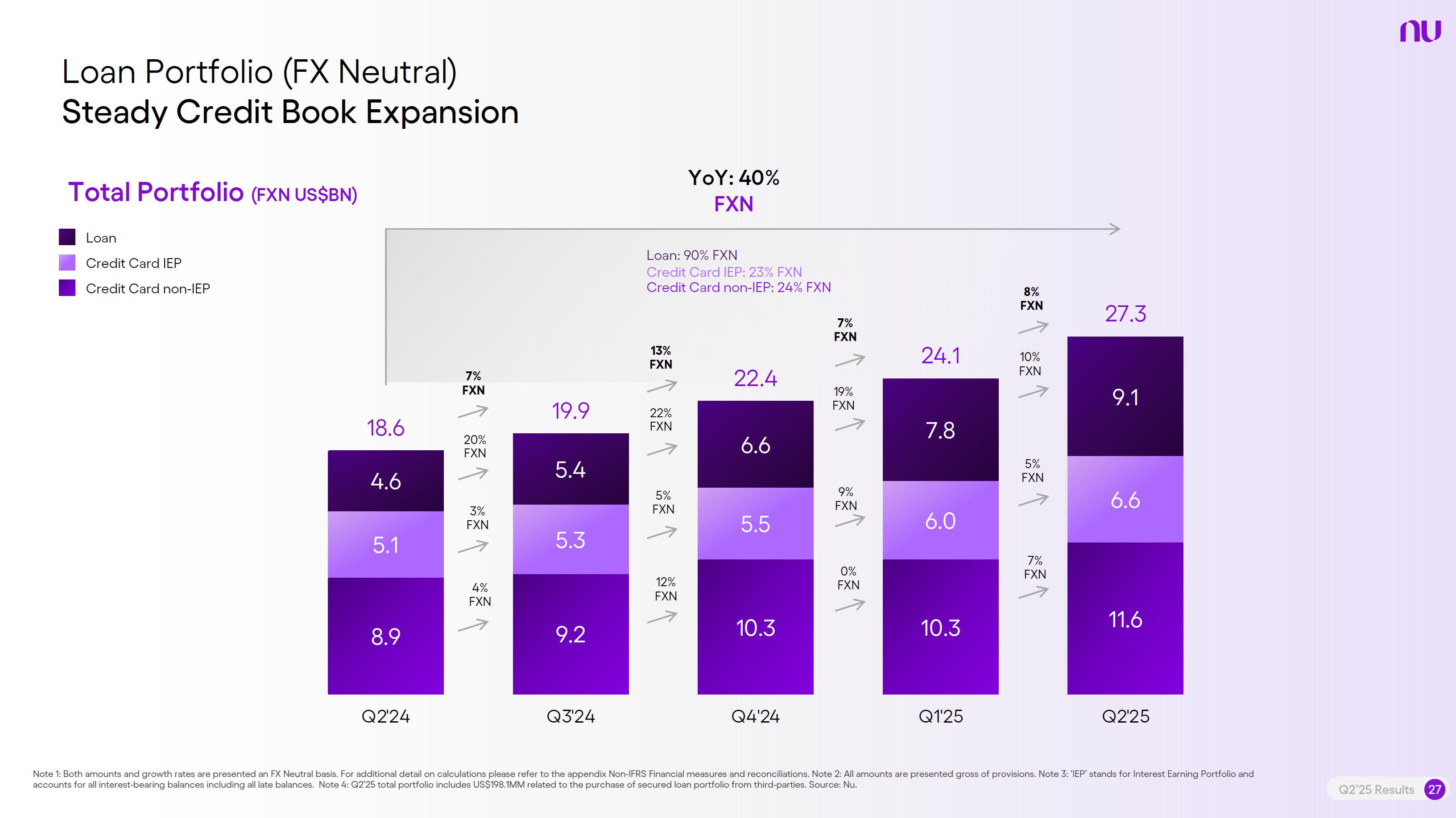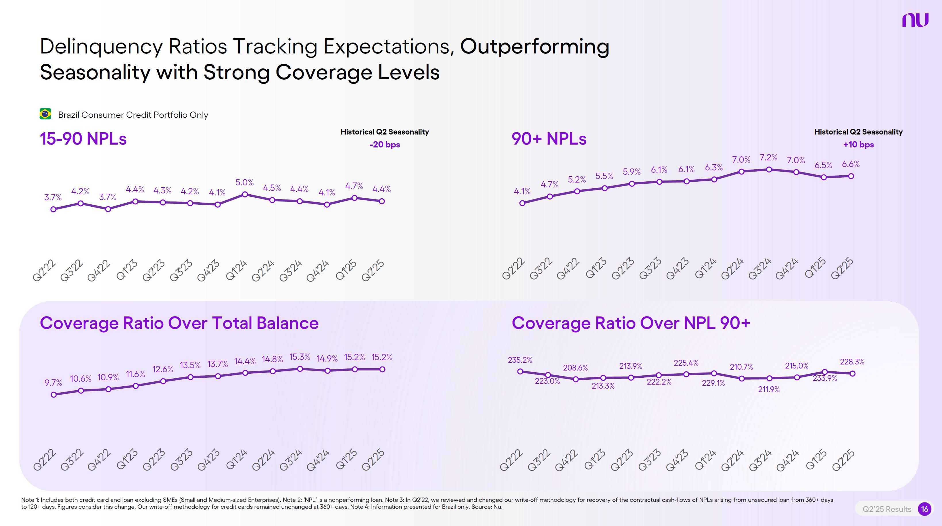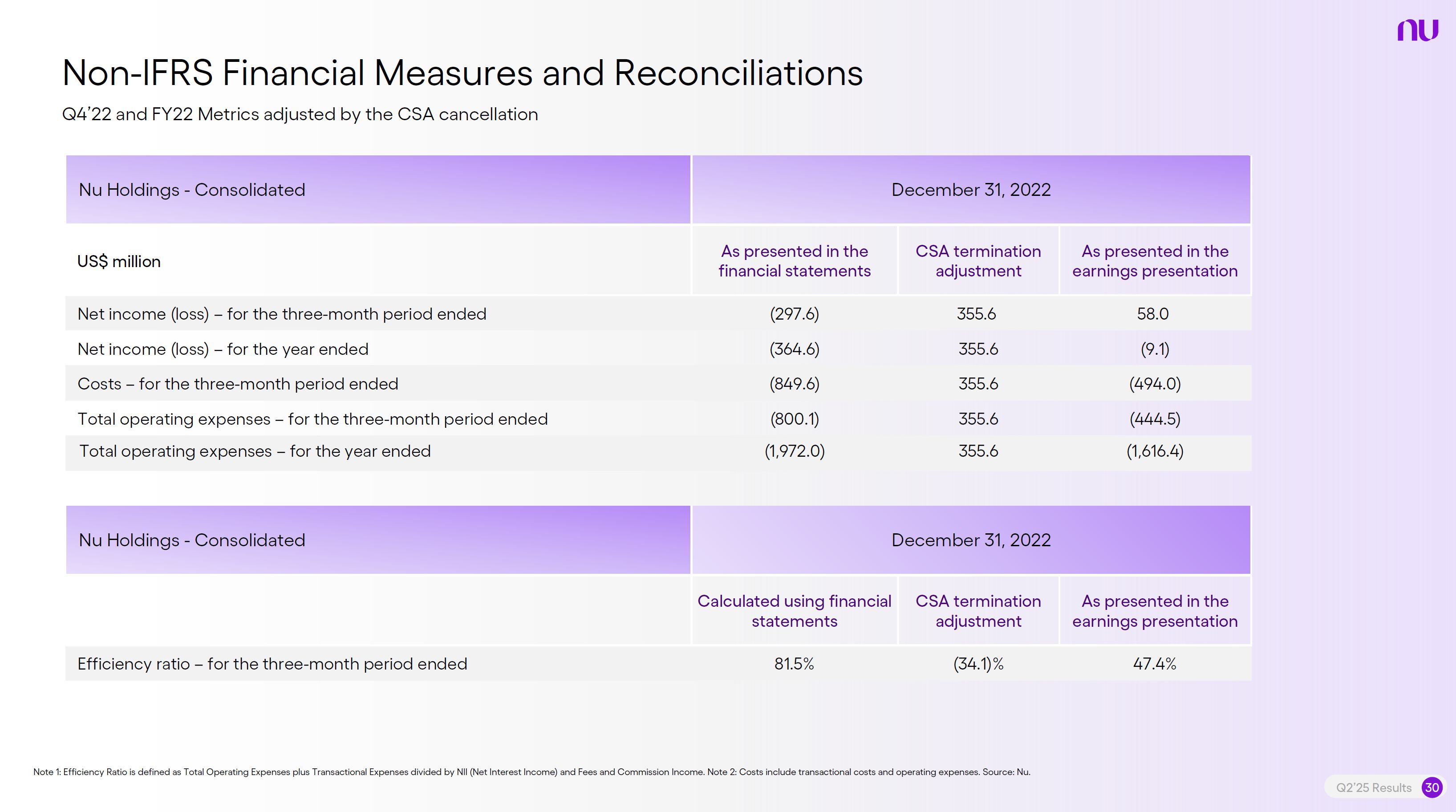 Earnings PresentationQ2 2025Aug 14, 2025  Q2’25 Results 2 Investor Relations Officer Guilherme Souto WelcomeQ2’25 Results 2 Investor Relations Officer Guilherme Souto Welcome   Guilherme LagoChief Financial OfficerDavid VélezFounder, Chief Executive Officer and ChairmanQ2’25 Results 3   DisclaimerThis presentation speaks at the date here of and the Company is under no obligation to update or keep current the information contained in this presentation. Any information expressed herein is subject to change without notice. Any market or other third-party data included in this presentation has been obtained by the Company from third-party sources. While the Company has compiled and extracted the market data, it can provide no assurances of the accuracy and completeness of such information and takes no responsibility for such data.This presentation contains forward-looking statements. All statements other than statements of historical fact contained in this presentation may be forward-looking statements and include, but are not limited to, statements regarding the Company’s intent, belief or current expectations. These forward-looking statements are subject to risks and uncertainties, and may include, among others, financial forecasts and estimates based on assumptions or statements regarding plans, objectives and expectations. Although the Company believes that these estimates and forward-looking statements are based upon reasonable assumptions, they are subject to several risks and uncertainties and are made in light of information currently available, and actual results may differ materially from those expressed or implied in the forward-looking statements due to various factors, including those risks and uncertainties included under the captions “Risk Factors” and “Management’s Discussion and Analysis of Financial Condition and Results of Operations” in the prospectus dated December 8, 2021 filed with the Securities and Exchange Commission pursuant to Rule 424(b) under the Securities Act of 1933, as amended, and in our Annual Report on Form 20-F for the year ended December 31, 2024, which was filed with the Securities and Exchange Commission on April 16, 2025.The Company, its advisers and each of their respective directors, officers and employees disclaim any obligation to update the Company’s view of such risks and uncertainties or to publicly announce the result of any revision to the forward-looking statements made herein, except where it would be required to do so under applicable law. The forward-looking statements can be identified, in certain cases, through the use of words such as “believe,” “may,” “might,” “can,” “could,” “is designed to,” “will,” “aim,” “estimate,” “continue,” “anticipate,” “intend,” “expect,” “forecast”, “plan”, “predict”, “potential”, “aspiration,” “should,” “purpose,” “belief,” and similar, or variations of, or the negative of such words and expressions. The financial information in this document includes forecasts, projections and other predictive statements that represent the Company’s assumptions and expectations in light of currently available information. These forecasts, projections and other predictive statements are based on the Company’s expectations and are subject to variables and uncertainties. The Company’s actual performance results may differ. Consequently, no guarantee is presented or implied as to the accuracy of specific forecasts, projections or predictive statements contained herein, and undue reliance should not be placed on the forward-looking statements in this presentation, which are inherently uncertain.In addition to IFRS financials, this presentation includes certain summarized, non-audited or non-IFRS financial information. These summarized, non-audited or non-IFRS financia addition to, and not a substi financial performance prepared in References in this presentati the official currency of Brazil.Q2’25 Results 4 l measures are in tute for or superior to, measures of accordance with IFRS. on to “R$” refer to the Brazilian Real,   Sustained Growth of One of theWorld's Largest Digital Banking Platforms%Adult PopulationCustomers (MM) ARPAC (US$) Revenues (US$BN)60% 13% 9%% Activity Ratio123 CAGR: 34% FXN 9 11 12 3,66884865 83%83% 1,869 42 4 1,158 33672% 105 CAGR: 31% CAGR: 85% FXN 2,849 80%82% Q2'21 Q2'22 Q2'23 Q2'24 Q2'25 Q2'21 Q2'22 Q2'23 Q2'24 Q2'25 Q2'21 Q2'22 Q2'23 Q2'24 Q2'25Gross Profit (US$MM) Efficiency Ratio (%) Net Income (US$MM)6371,54873%58%782 22535%32%28%364166(15) (30)1,359 CAGR: 78% FXN CAGR: 80% FXN 487 Q2'21 Q2'22 Q2'23 Q2'24 Q2'25 Q2'21 Q2'22 Q2'23 Q2'24 Q2'25 Q2'21 Q2'22 Q2'23 Q2'24 Q2'25Note 1: ‘Active Customers’ relates to all customers that have generated revenue over the last 30 calendar days, for a given measurement period. Note 2: ‘Activity Rate’ is defined as monthly active customers divided by the total number of customers as of a specific date. Note 3: Adult population is defined as 18+ years. Note 4: For Brazil, the % of adult population is calculated as Nu’s Brazilian adult customers divided by the adult population of the country. For Mexico and Colombia, the % is calculated as Nu’s customers divided by the adult population of each country. Note 4: ‘Average revenue per active customer’ or ‘ARPAC’ is defined as the average monthly revenue (total revenue divided by the number of months in the period) divided by the average number of individual active customers during the period (average number of individual active customers is defined as the average of the number of monthly active customers at the beginning of theperiod measured, and the number of monthly active customers at the end of the period). Note 5: Efficiency Ratio is defined as Total Operating Expenses plus Transactional Expenses divided by NII and Fees and Commission Income. Note 6: Amounts are presente