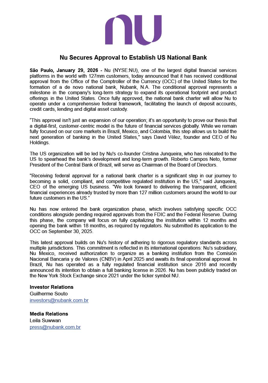 Nu Secures Approval to Establish US National Bank São Paulo, January 29, 2026 - Nu (NYSE:NU), one of the largest digital financial services platforms in the world with 127mm customers, today announced that it has received conditional approval from the Office of the Comptroller of the Currency (OCC) of the United States for the formation of a de novo national bank, Nubank, N.A. The conditional approval represents a milestone in the company's long-term strategy to expand its operational footprint and product offerings in the United States. Once fully approved, the national bank charter will allow Nu to operate under a comprehensive federal framework, facilitating the launch of deposit accounts, credit cards, lending and digital asset custody. “This approval isn't just an expansion of our operation; it’s an opportunity to prove our thesis that a digital-first, customer-centric model is the future of financial services globally. While we remain fully focused on our core markets in Brazil, Mexico, and Colombia, this step allows us to build the next generation of banking in the United States," says David Vélez, founder and CEO of Nu Holdings. The US organization will be led by Nu's co-founder Cristina Junqueira, who has relocated to the US to spearhead the bank’s development and long-term growth. Roberto Campos Neto, former President of the Central Bank of Brazil, will serve as Chairman of the Board of Directors. "Receiving federal approval for a national bank charter is a significant step in our journey to becoming a solid, compliant, and competitive regulated institution in the US," said Junqueira, CEO of the emerging US business. "We look forward to delivering the transparent, efficient financial experiences already trusted by more than 127 million customers around the world to our future customers in the US.” Nu has now entered the bank organization phase, which involves satisfying specific OCC conditions alongside pending required approvals from the FDIC and the Federal Reserve. During this phase, the company will focus on fully capitalizing the institution within 12 months and opening the bank within 18 months, as required by regulators. Nu submitted its application to the OCC on September 30, 2025. This latest approval builds on Nu's history of adhering to rigorous regulatory standards across multiple jurisdictions. This commitment is reflected in its international operations: Nu’s subsidiary, Nu Mexico, received authorization to organize as a banking institution from the Comisión Nacional Bancaria y de Valores (CNBV) in April 2025 and awaits its final operational approval. In Brazil, Nu has operated as a fully regulated financial institution since 2016 and recently announced its intention to obtain a full banking license in 2026. Nu has been publicly traded on the New York Stock Exchange since 2021 under the ticker symbol NU. Investor Relations Guilherme Souto investors@nubank.com.br Media Relations Leila Suwwan press@nubank.com.br