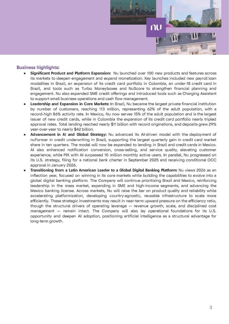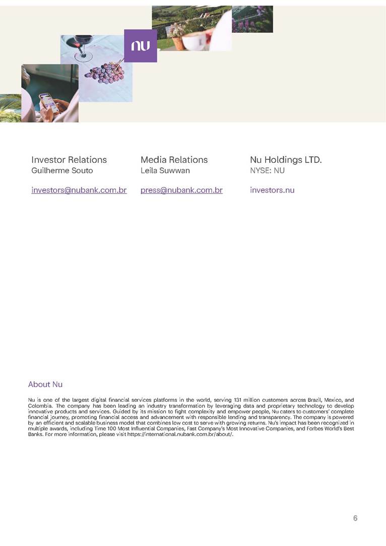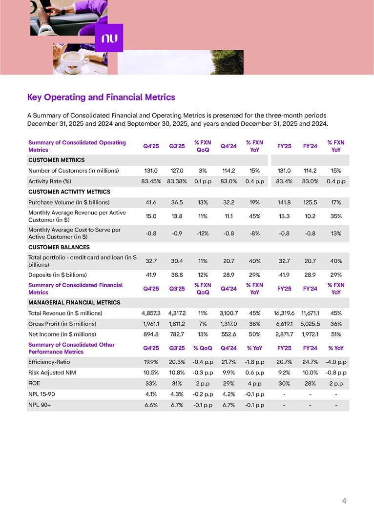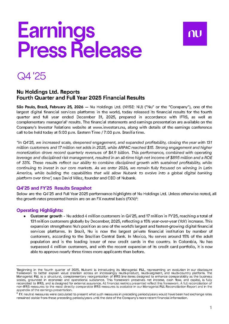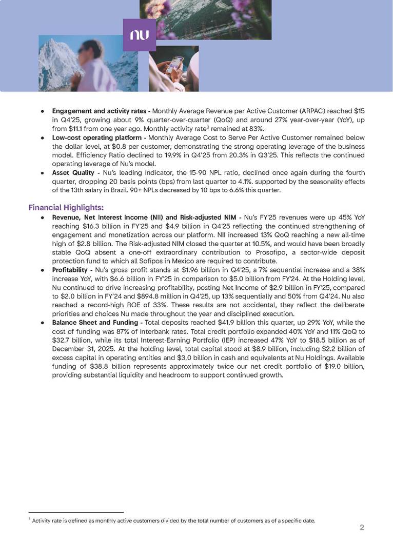 Nu Holdings Ltd. Reports Fourth Quarter and Full Year 2025 Financial Results São Paulo, Brazil, February 25, 2026 — Nu Holdings Ltd. (NYSE: NU) (“Nu” or the “Company”), one of the largest digital financial services platforms in the world, today released its financial results for the fourth quarter and full year ended December 31, 2025, prepared in accordance with IFRS, as well as complementary managerial 1 results. The financial statements and earnings presentation are available on the Company’s Investor Relations website at www.investors.nu, along with details of the earnings conference call to be held today at 5:00 p.m. Eastern Time / 7:00 p.m. Brasília time. “In Q4'25, we increased scale, deepened engagement, and expanded profitability, closing the year with 131 million customers and 17 million net adds in 2025, while ARPAC reached $15. Strong engagement and higher monetization drove record quarterly revenues of $4.9 billion. This performance, combined with operating leverage and disciplined risk management, resulted in an all-time high net income of $895 million and a ROE of 33%. These results reflect our ability to combine disciplined growth with sustained profitability, while continuing to invest in our core markets. As we enter 2026, we remain fully focused on winning in Latin America, while building the capabilities that will allow Nubank to evolve into a global digital banking platform over time”, says David Vélez, founder and CEO of Nubank. Q4’25 and FY’25 Results Snapshot Below are the Q4’25 and Full Year 2025 performance highlights of Nu Holdings Ltd. Unless otherwise noted, all the growth rates presented herein are on an FX neutral basis (FXN) 2 : Operating Highlights: ● Customer growth - Nu added 4 million customers in Q4’25, and 17 million in FY'25, reaching a total of 131 million customers globally by December, 2025, reflecting a 15% year-over-year (YoY) increase. This expansion strengthens Nu’s position as one of the world’s largest and fastest-growing digital financial services platforms. In Brazil, Nu is now the largest private financial institution by number of customers, according to the Brazilian Central Bank. In Mexico, Nu serves around 15% of the adult population and is the leading issuer of new credit cards in the country. In Colombia, Nu has surpassed 4 million customers, and with the recent expansion of its credit card portfolio, it is now able to approve nearly three times more applicants than before. 2 FX neutral measures were calculated to present what such measures in preceding periods/years would have been had exchange rates remained stable from these preceding periods/years until the date of the Company’s more recent financial information. 1 Beginning in the fourth quarter of 2025, Nubank is introducing its Managerial P&L, representing an evolution in our disclosure framework to better explain value creation across an increasingly multi-product, multi-segment, and multi-country platform. The Managerial P&L is a structural, complementary reorganization of IFRS line items designed to enhance comparability as the business scales, grounded in economic and operational substance. This framework preserves net income, cash flow, and capital, is fully reconciled to IFRS, and is designed for external assurance. All financial metrics presented reflect this framework. A full reconciliation of non-IFRS measures to the most directly comparable IFRS measures is available in our Managerial P&L Reconciliation Report and in the appendix of the earnings presentation . 1 ● Engagement and activity rates - Monthly Average Revenue per Active Customer (ARPAC) reached $15 in Q4’25, growing about 9% quarter-over-quarter (QoQ) and around 27% year-over-year (YoY), up from $11.1 from one year ago. Monthly activity rate 3 remained at 83%. ● Low-cost operating platform - Monthly Average Cost to Serve Per Active Customer remained below the dollar level, at $0.8 per customer, demonstrating the strong operating leverage of the business model. Efficiency Ratio declined to 19.9% in Q4’25 from 20.3% in Q3’25. This reflects the continued operating leverage of Nu’s model. ● Asset Quality - Nu’s leading indicator, the 15-90 NPL ratio, declined once again during the fourth quarter, dropping 20 basis points (bps) from last quarter to 4.1%. supported by the se asonality effects of the 13th salary in Brazil. 90+ NPLs decreased by 10 bps to 6.6% this quarter. Financial Highlights: ● Revenue, Net Interest Income (NII) and Risk-adjusted NIM - Nu’s FY'25 revenues were up 45% YoY reaching $16.3 billion in FY'25 and $4.9 billion in Q4'25 reflecting the continued strengthening of engagement and monetization across our platform. NII increased 13% QoQ reaching a new all-time high of $2.8 billion. The Risk-adjusted NIM closed the quarter at 10.5%, and would have been broadly stable QoQ absent a one-off extraordinary contribution to Prosofipo, a sector-wide deposit protection fund to which all Sofipos in Mexico are required to contribute. ● Profitability - Nu’s gross profit stands at $1.96 billion in Q4'25, a 7% sequential increase and a 38% increase YoY, with $6.6 billion in FY'25 in comparison to $5.0 billion from FY'24. At the Holding level, Nu continued to drive increasing profitability, posting Net Income of $2.9 billion in FY'25, compared to $2.0 billion in FY’24 and $894.8 million in Q4'25, up 13% sequentially and 50% from Q4’24. Nu also reached a record-high ROE of 33%. These results are not accidental, they reflect the deliberate priorities and choices Nu made throughout the year and disciplined execution. ● Balance Sheet and Funding - Total deposits reached $41.9 billion this quarter, up 29% YoY, while the cost of funding was 87% of interbank rates. Total credit portfolio expanded 40% YoY and 11% QoQ to $32.7 billion, while its total Interest-Earning Portfolio (IEP) increased 47% YoY to $18.5 billion as of December 31, 2025. At the hol