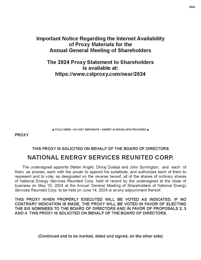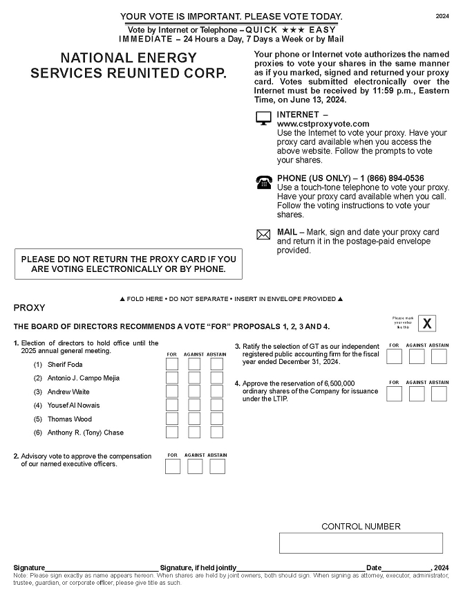 The Notice of Annual General Meeting and Proxy Statement describes the business to be transacted at the annual general meeting and provides other information concerning National Energy Services Reunited Corp. The principal business to be transacted at the annual general meeting will be (a) the re-election of each of our five current directors and the election of one additional director, each for a term of one year, (b) to approve an advisory resolution on executive compensation, (c) to ratify the appointment of Grant Thornton Audit and Accounting Limited (Dubai Branch) (“GT”) as the Company’s independent registered public accounting firm for the fiscal year ending December 31, 2024 and (d) to approve the reservation of 6,500,000 ordinary shares of the Company for issuance under the 2018 Long Term Incentive Plan (the “LTIP”). The Board of Directors unanimously recommends that shareholders vote for the election of the nominated directors, for the advisory resolution on executive compensation, for the ratification of the appointment of GT, and for the reservation of shares for issuance under the LTIP.