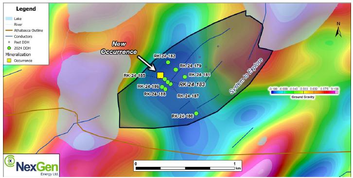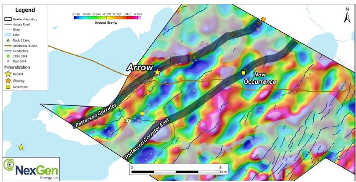 Vancouver, BC, March 11, 2024 - NexGen Energy Ltd. ("NexGen" or the "Company") (TSX: NXE) (NYSE: NXE) (ASX: NXG) is pleased to announce the discovery of new intense uranium mineralization on its 100% owned SW2 Property, 3.5 kilometers (km) east of NexGen’s world-class Arrow Deposit (Figure 1). The new mineralized occurrence in RK-24-183 is located on a previously untested conductor segment of Patterson Corridor East (“PCE”). Localized uranium mineralization was intersected for 19.8 meters (m) between 347.7 and 367.5 m, with peaks up to >61,000 counts per second (cps)*. Exploration is predominantly open in all directions including over 1.5 km along strike (Figures 2 and 3).