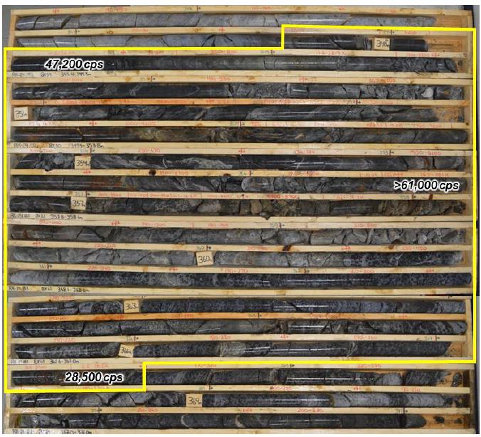 Figure 5: Semi-massive, primary uranium mineralization at 348.5 m, maximum peak of 47,200 cps as shown