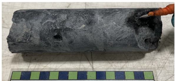 Figure 7: Secondary mineralization along microfractures and foliation at 367.3 m, maximum peak of 28,500 cps