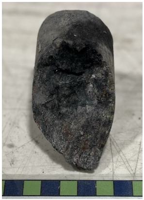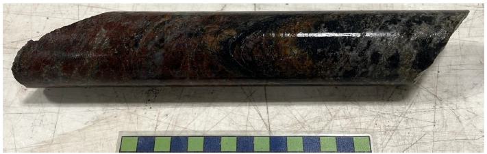 Figure 6: Semi-massive, primary uranium mineralization hosted in competent garnetiferous orthogneiss at 356.9 m, maximum peak of >61,000 cps
