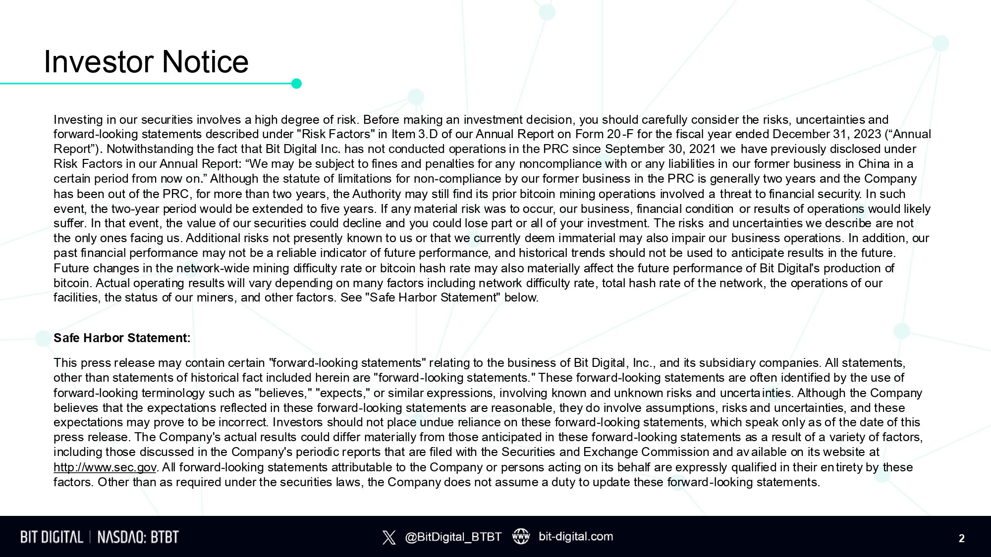 Investing in our securities involves a high degree of risk. Before making an investment decision, you should carefully consider the risks, uncertainties and forward - looking statements described under "Risk Factors" in Item 3.D of our Annual Report on Form 20 - F for the fiscal year ended December 31, 2023 (“Annual Report”). Notwithstanding the fact that Bit Digital Inc. has not conducted operations in the PRC since September 30, 2021 we have previously disclosed under Risk Factors in our Annual Report: “We may be subject to fines and penalties for any noncompliance with or any liabilities in our former business in China in a certain period from now on.” Although the statute of limitations for non - compliance by our former business in the PRC is generally two years and the Company has been out of the PRC, for more than two years, the Authority may still find its prior bitcoin mining operations involved a threat to financial security. In such event, the two - year period would be extended to five years. If any material risk was to occur, our business, financial condition or results of operations would likely suffer. In that event, the value of our securities could decline and you could lose part or all of your investment. The risks and uncertainties we describe are not the only ones facing us. Additional risks not presently known to us or that we currently deem immaterial may also impair our business operations. In addition, our past financial performance may not be a reliable indicator of future performance, and historical trends should not be used to anticipate results in the future. Future changes in the network - wide mining difficulty rate or bitcoin hash rate may also materially affect the future performance of Bit Digital's production of bitcoin. Actual operating results will vary depending on many factors including network difficulty rate, total hash rate of the network, the operations of our facilities, the status of our miners, and other factors. See "Safe Harbor Statement" below. Safe Harbor Statement: This press release may contain certain "forward - looking statements" relating to the business of Bit Digital, Inc., and its subsidiary companies. All statements, other than statements of historical fact included herein are "forward - looking statements." These forward - looking statements are often identified by the use of forward - looking terminology such as "believes," "expects," or similar expressions, involving known and unknown risks and uncerta inties. Although the Company believes that the expectations reflected in these forward - looking statements are reasonable, they do involve assumptions, risks and uncertainties, and these expectations may prove to be incorrect. Investors should not place undue reliance on these forward - looking statements, which speak only as of the date of this press release. The Company's actual results could differ materially from those anticipated in these forward - looking statements as a result of a variety of factors, including those discussed in the Company's periodic reports that are filed with the Securities and Exchange Commission and av ailable on its website at http://www.sec.gov . All forward - looking statements attributable to the Company or persons acting on its behalf are expressly qualified in their entirety by these factors. Other than as required under the securities laws, the Company does not assume a duty to update these forward - looking statements. Investor Notice 2