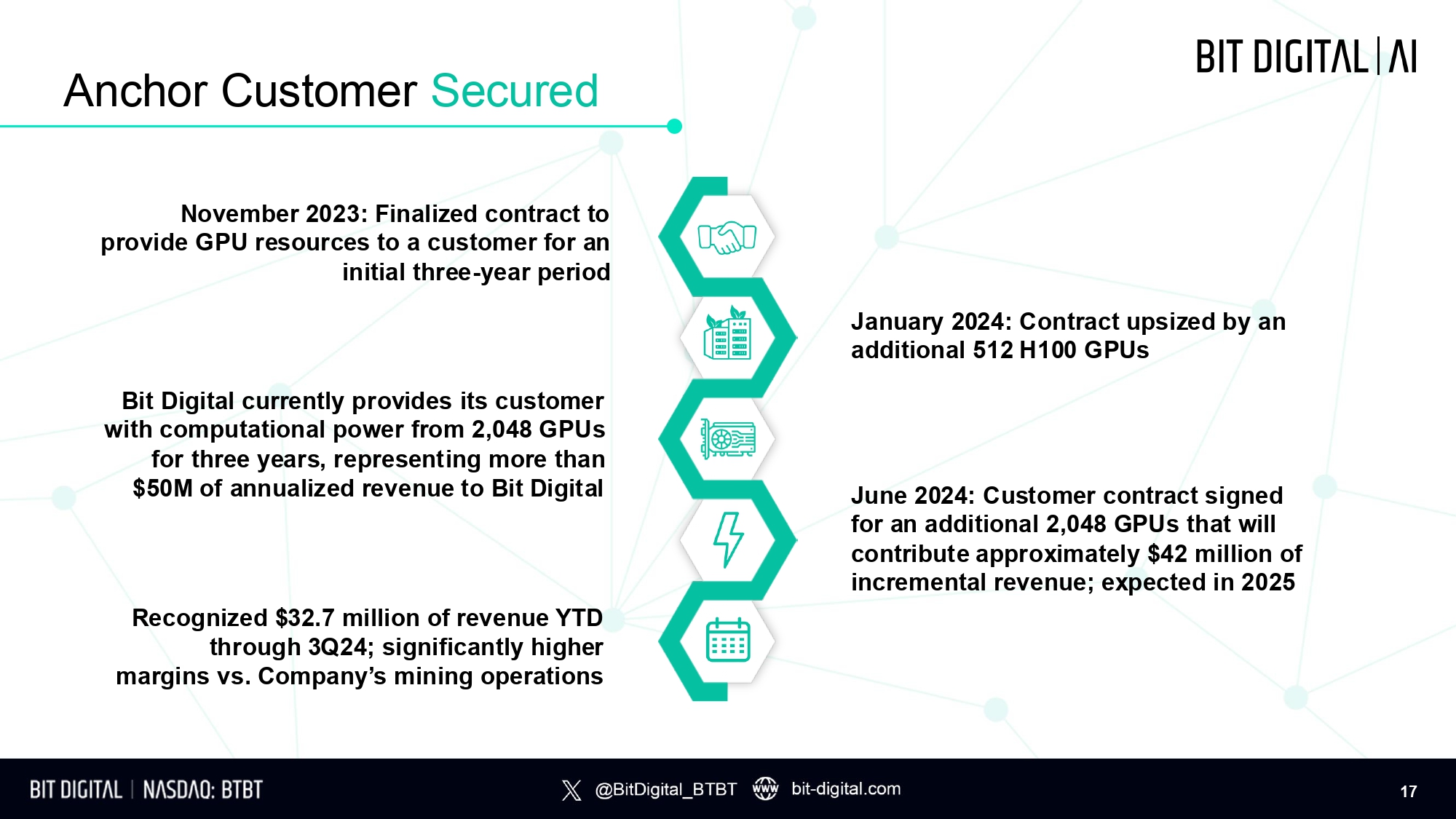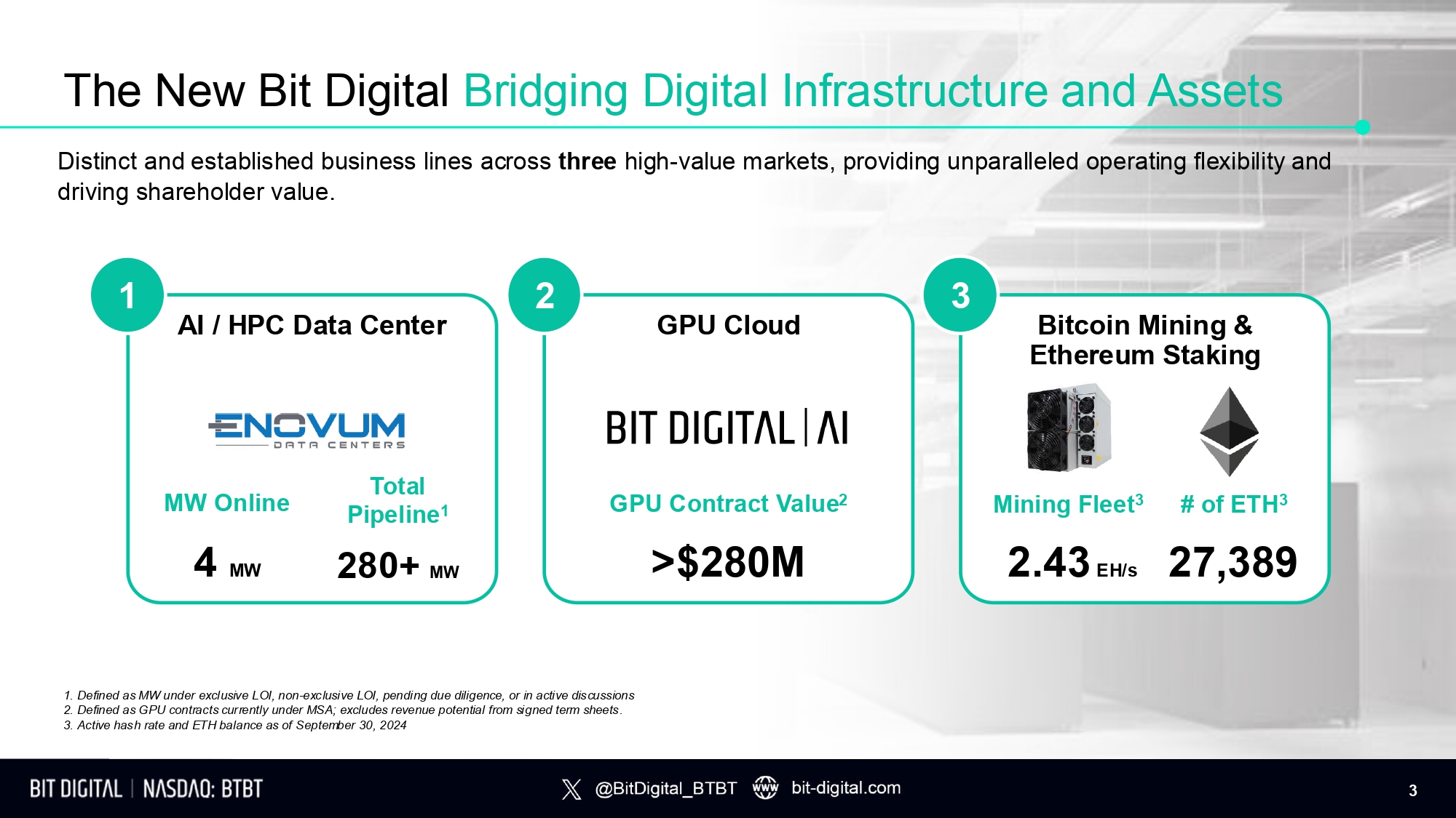 AI / HPC Data Center MW Online 4 MW Total P i p e li n e 1 280+ MW The New Bit Digital Bridging Digital Infrastructure and Assets GPU Cloud GPU Contract Value 2 >$280M Bitcoin Mining & Ethereum Staking # of ETH 3 27,389 Mining Fleet 3 2 . 4 3 E H / s Distinct and established business lines across three high - value markets, providing unparalleled operating flexibility and driving shareholder value. 1. Defined as MW under exclusive LOI, non - exclusive LOI, pending due diligence, or in active discussions 2. Defined as GPU contracts currently under MSA; excludes revenue potential from signed term sheets. 3. Active hash rate and ETH balance as of September 30, 2024 1 2 3 3