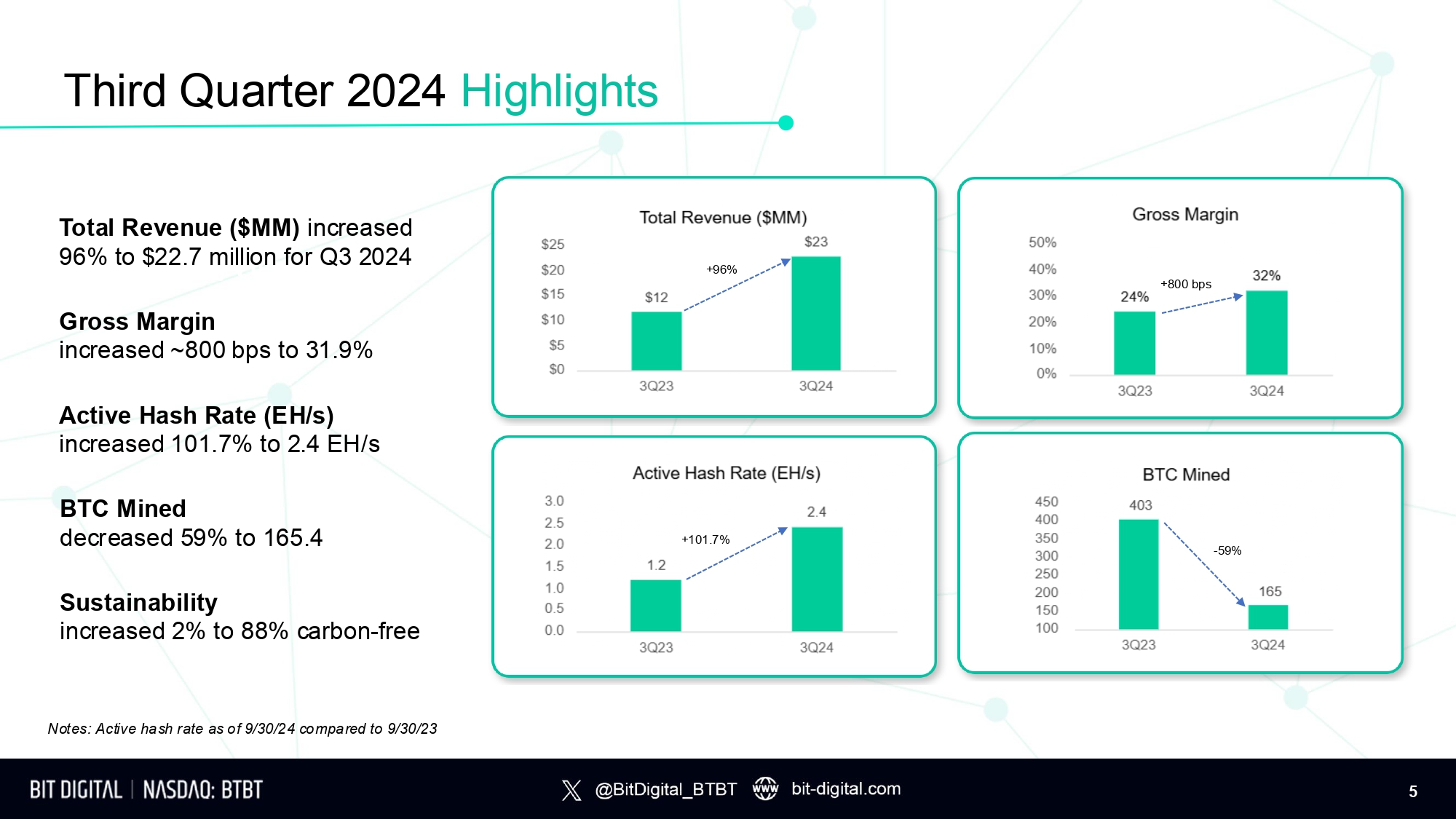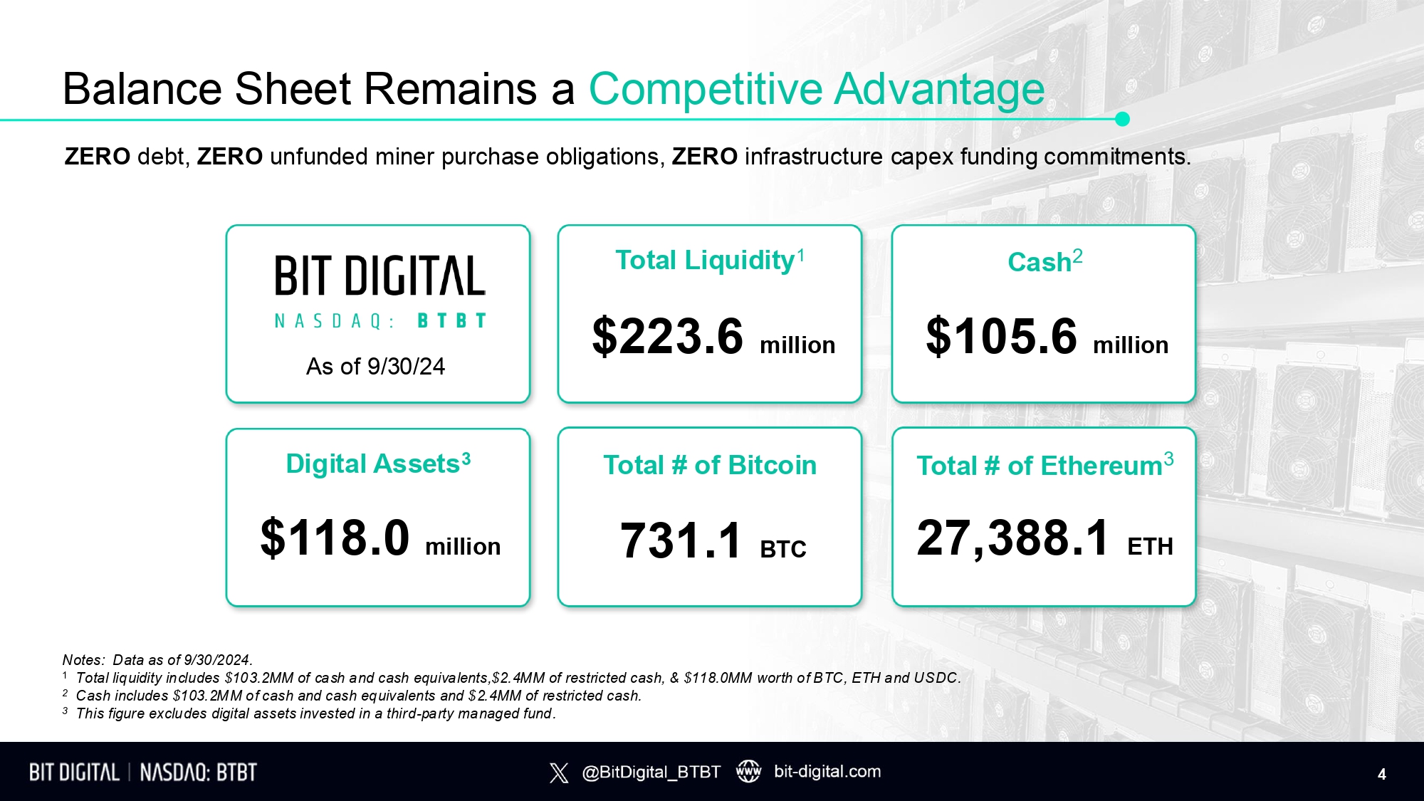 Balance Sheet Remains a Competitive Advantage Notes: Data as of 9/30/2024. 1 Total liquidity includes $103.2MM of cash and cash equivalents,$2.4MM of restricted cash, & $118.0MM worth of BTC, ETH and USDC. 2 Cash includes $103.2MM of cash and cash equivalents and $2.4MM of restricted cash. 3 This figure excludes digital assets invested in a third - party managed fund. ZERO debt, ZERO unfunded miner purchase obligations, ZERO infrastructure capex funding commitments. Total # of Bitcoin 731.1 BTC Cash 2 $105.6 million Total # of Ethereum 3 D ig i t a l A s se t s 3 $118.0 million 27,388.1 ETH As of 9/30/24 Total Liquidity 1 4 $223.6 million