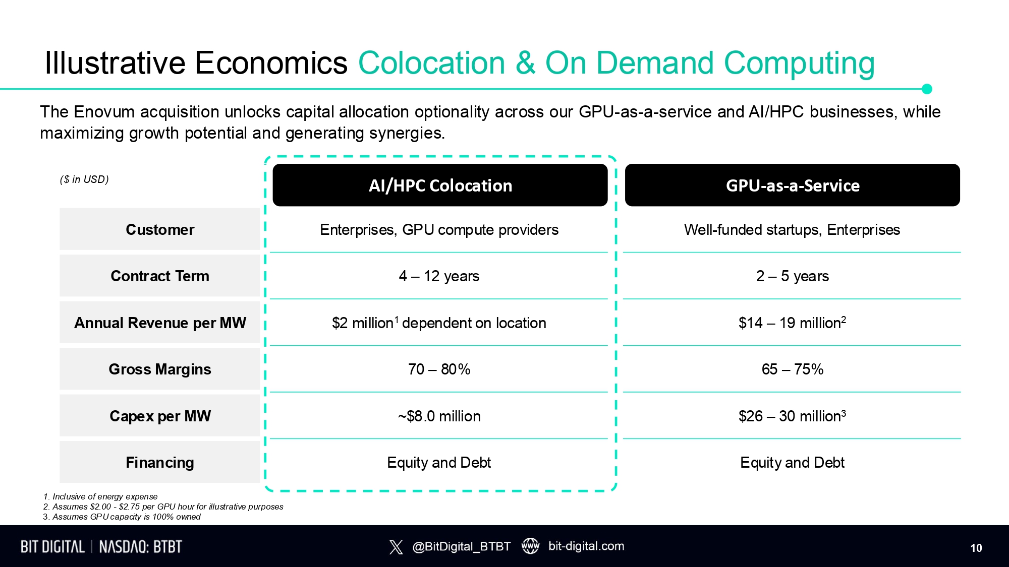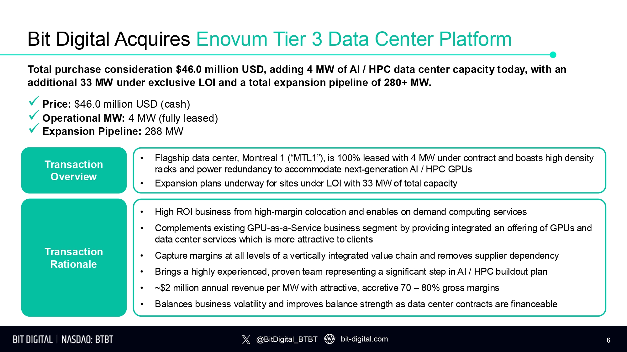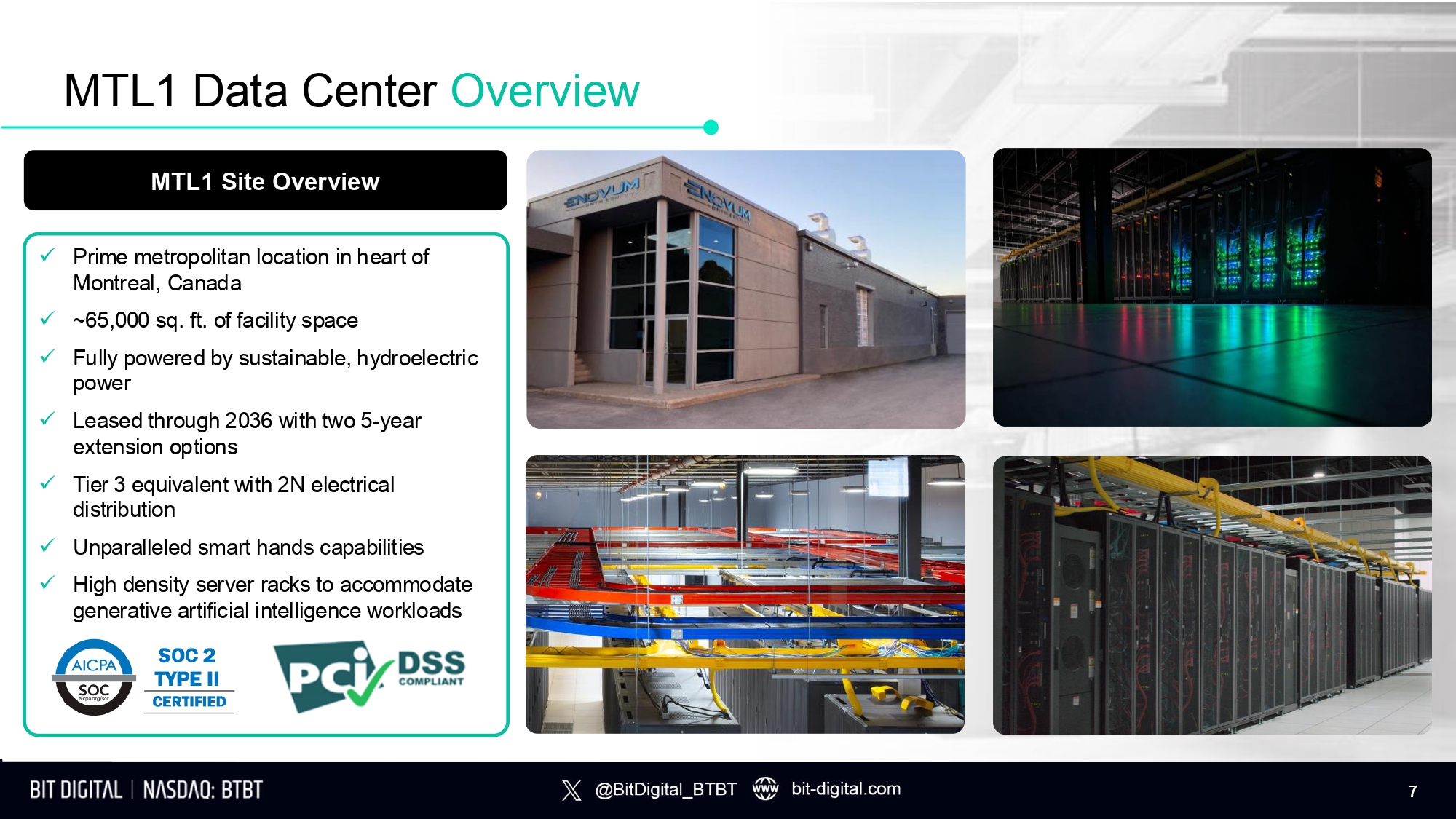 Bit Digital Acquires Enovum Tier 3 Data Center Platform Total purchase consideration $46.0 million USD, adding 4 MW of AI / HPC data center capacity today, with an additional 33 MW under exclusive LOI and a total expansion pipeline of 280+ MW. x Price: $46.0 million USD (cash) x Operational MW: 4 MW (fully leased) x Expansion Pipeline: 288 MW T r a n sa c t i o n Overview T r a n sa c t i o n Rationale • High ROI business from high - margin colocation and enables on demand computing services • Complements existing GPU - as - a - Service business segment by providing integrated an offering of GPUs and data center services which is more attractive to clients • Capture margins at all levels of a vertically integrated value chain and removes supplier dependency • Brings a highly experienced, proven team representing a significant step in AI / HPC buildout plan • ~$2 million annual revenue per MW with attractive, accretive 70 – 80% gross margins • Balances business volatility and improves balance strength as data center contracts are financeable • Flagship data center, Montreal 1 (“MTL1”), is 100% leased with 4 MW under contract and boasts high density racks and power redundancy to accommodate next - generation AI / HPC GPUs • Expansion plans underway for sites under LOI with 33 MW of total capacity 6
