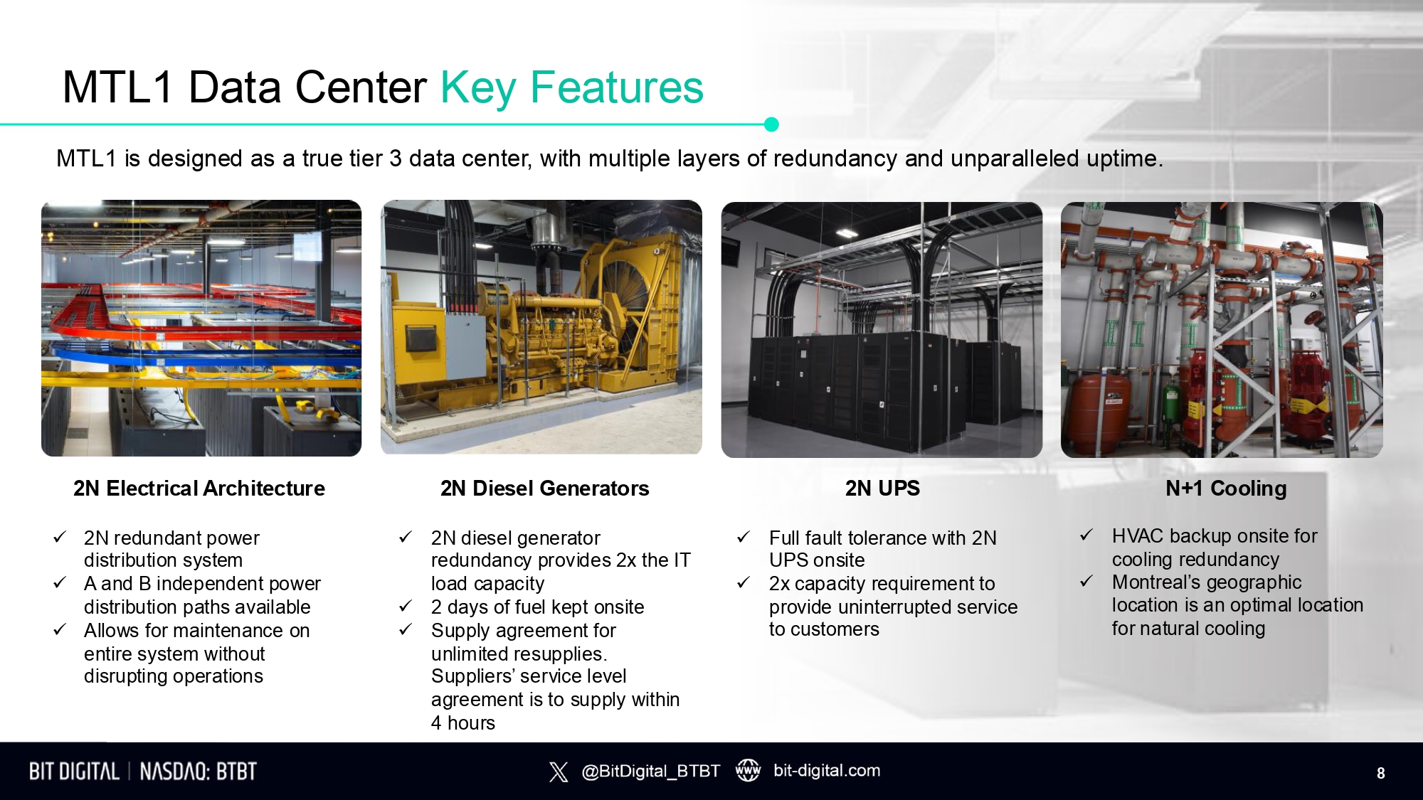 MTL1 Data Center Overview MTL1 Site Overview x Prime metropolitan location in heart of Montreal, Canada x ~65,000 sq. ft. of facility space x Fully powered by sustainable, hydroelectric power x Leased through 2036 with two 5 - year extension options x Tier 3 equivalent with 2N electrical distribution x Unparalleled smart hands capabilities x High density server racks to accommodate generative artificial intelligence workloads 7