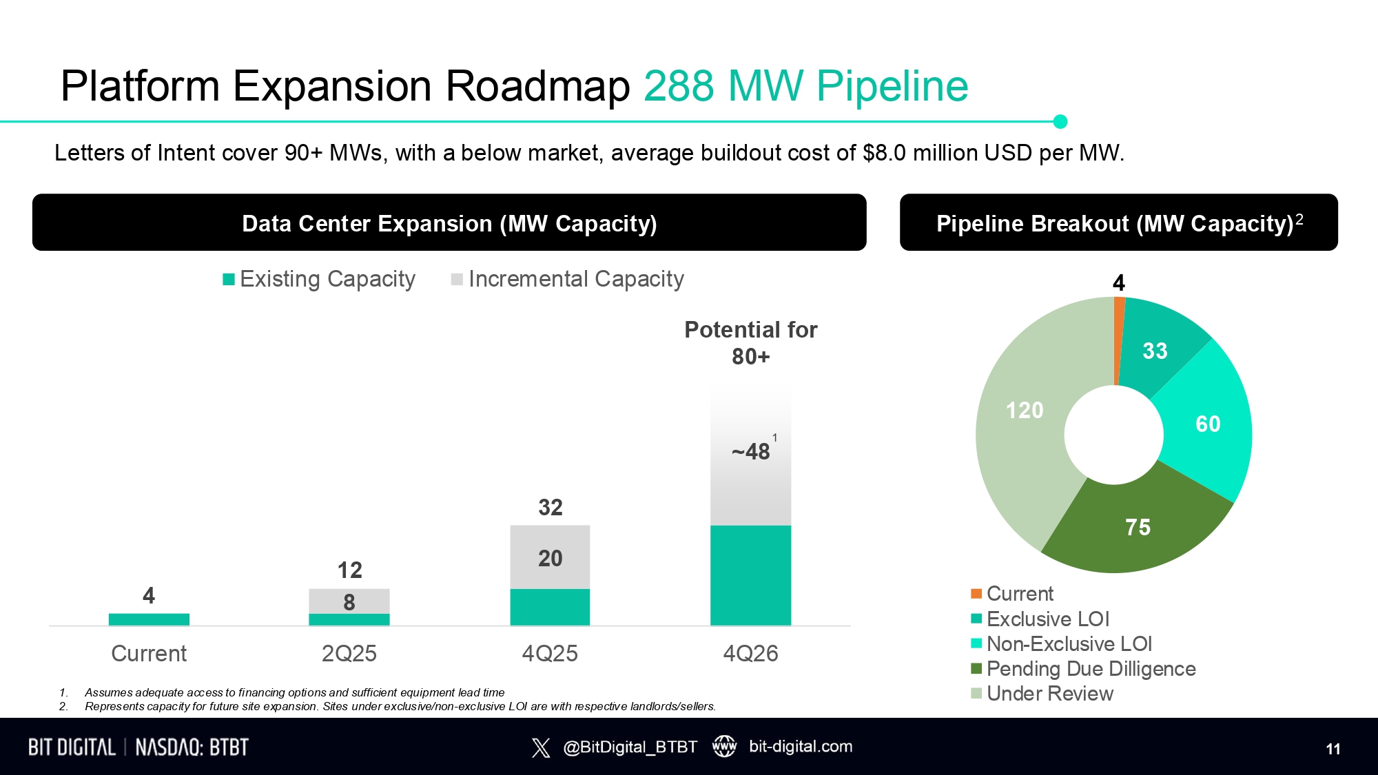4 33 60 75 120 Current Exclusive LOI Non - Exclusive LOI Pending Due Dilligence Under Review 8 20 ~ 48 4 12 32 Potential for 80+ Current 2Q25 4Q25 1. Assumes adequate access to financing options and sufficient equipment lead time 2. Represents capacity for future site expansion. Sites under exclusive/non - exclusive LOI are with respective landlords/sellers. 4 Q 2 6 Platform Expansion Roadmap 288 MW Pipeline Letters of Intent cover 90+ MWs, with a below market, average buildout cost of $8.0 million USD per MW. Data Center Expansion (MW Capacity) Existing Capacity Incremental Capacity Pipeline Breakout (MW Capacity) 2 1 11