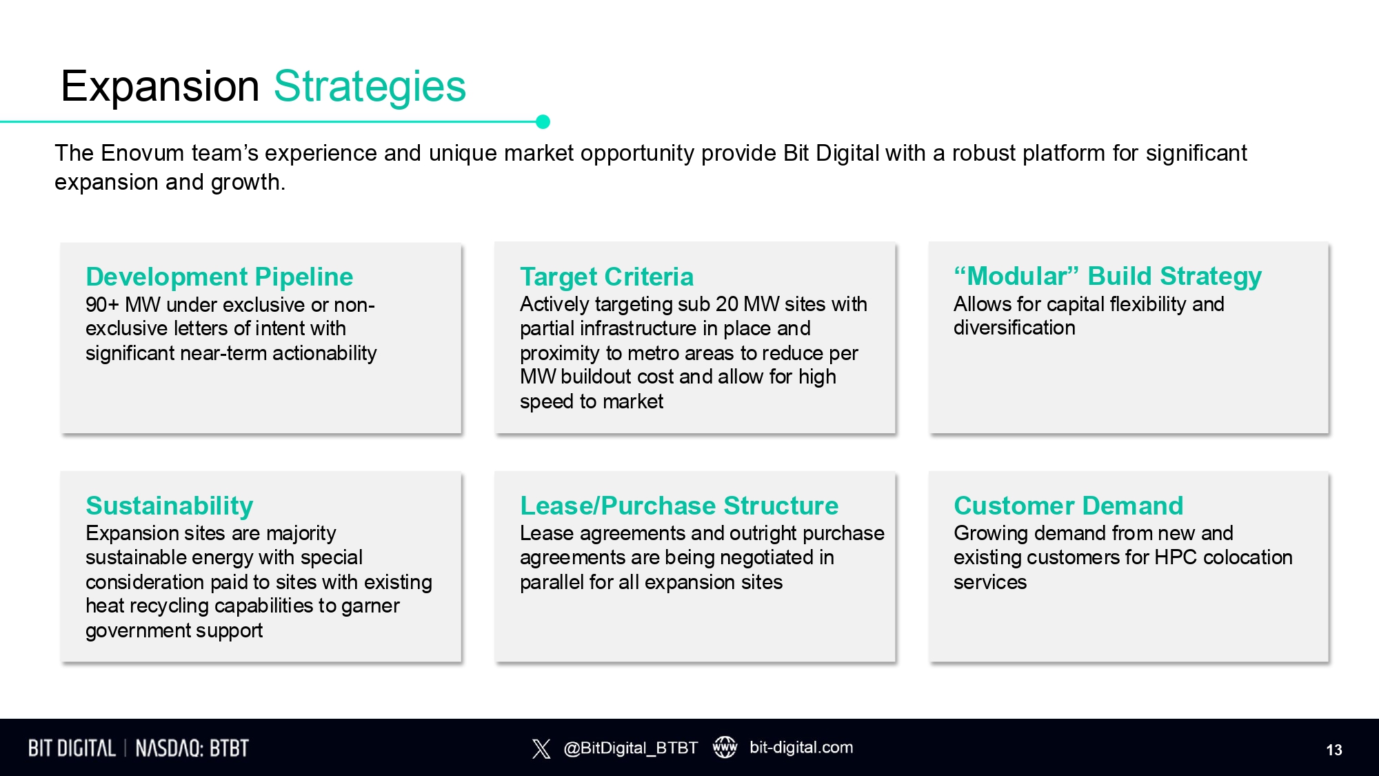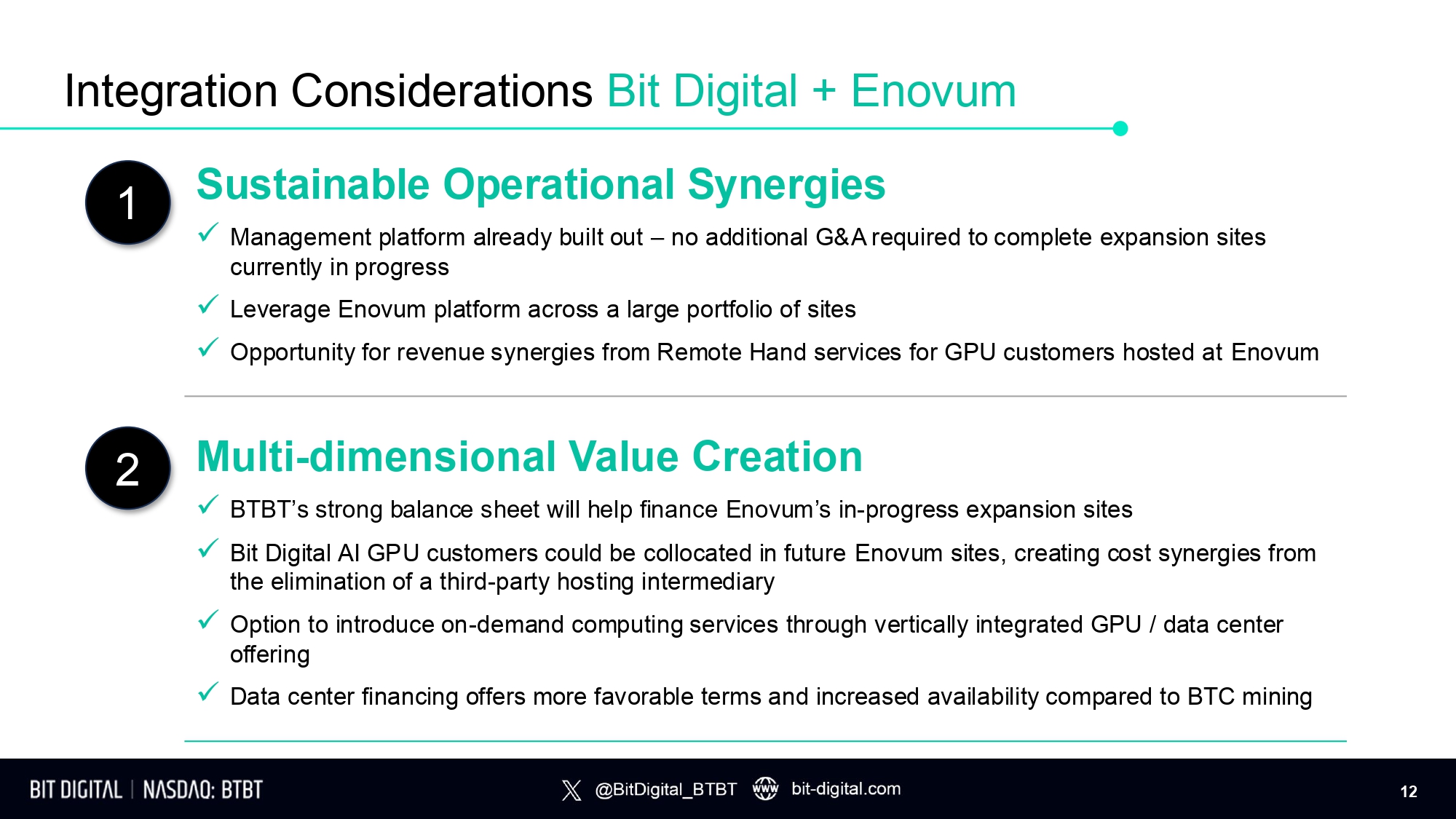 Sustainable Operational Synergies x Management platform already built out – no additional G&A required to complete expansion sites currently in progress x Leverage Enovum platform across a large portfolio of sites x Opportunity for revenue synergies from Remote Hand services for GPU customers hosted at Enovum Multi - dimensional Value Creation x BTBT’s strong balance sheet will help finance Enovum’s in - progress expansion sites x Bit Digital AI GPU customers could be collocated in future Enovum sites, creating cost synergies from the elimination of a third - party hosting intermediary x Option to introduce on - demand computing services through vertically integrated GPU / data center offering x Data center financing offers more favorable terms and increased availability compared to BTC mining 2 Integration Considerations Bit Digital + Enovum 1 12