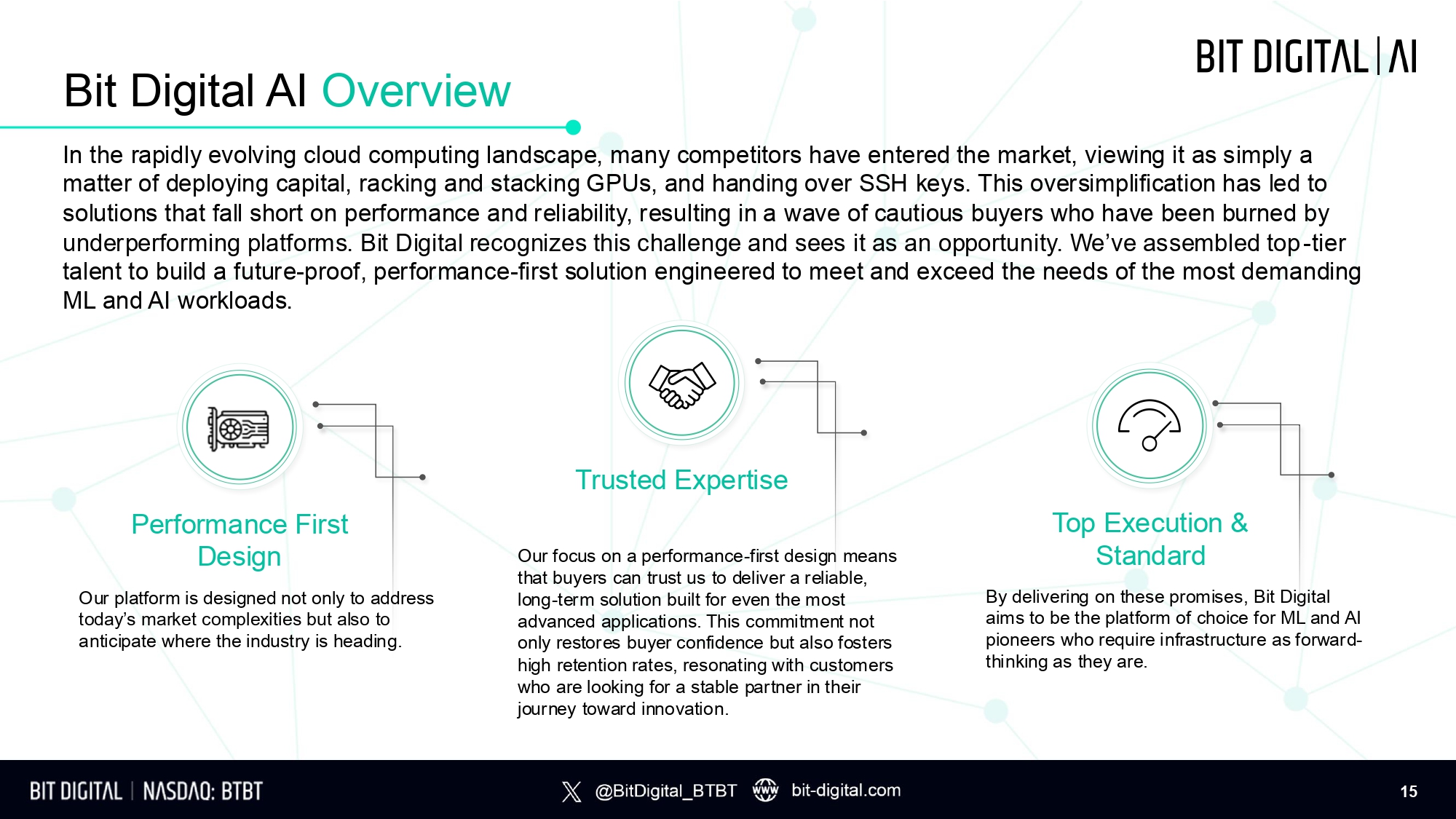 Bit Digital AI Overview In the rapidly evolving cloud computing landscape, many competitors have entered the market, viewing it as simply a matter of deploying capital, racking and stacking GPUs, and handing over SSH keys. This oversimplification has led to solutions that fall short on performance and reliability, resulting in a wave of cautious buyers who have been burned by underperforming platforms. Bit Digital recognizes this challenge and sees it as an opportunity. We’ve assembled top - tier talent to build a future - proof, performance - first solution engineered to meet and exceed the needs of the most demanding ML and AI workloads. Our focus on a performance - first design means that buyers can trust us to deliver a reliable, long - term solution built for even the most advanced applications. This commitment not only restores buyer confidence but also fosters high retention rates, resonating with customers who are looking for a stable partner in their journey toward innovation. Trusted Expertise Top Execution & Standard By delivering on these promises, Bit Digital aims to be the platform of choice for ML and AI pioneers who require infrastructure as forward - thinking as they are. Performance First Design Our platform is designed not only to address today’s market complexities but also to anticipate where the industry is heading. 15