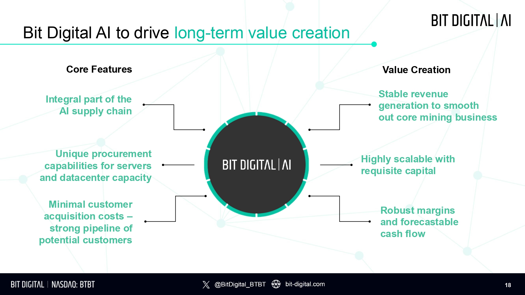 Bit Digital AI to drive long - term value creation Core Features Integral part of the AI supply chain Unique procurement capabilities for servers and datacenter capacity Minimal customer acquisition costs – strong pipeline of potential customers Value Creation Stable revenue generation to smooth out core mining business Highly scalable with requisite capital Robust margins and forecastable cash flow 18