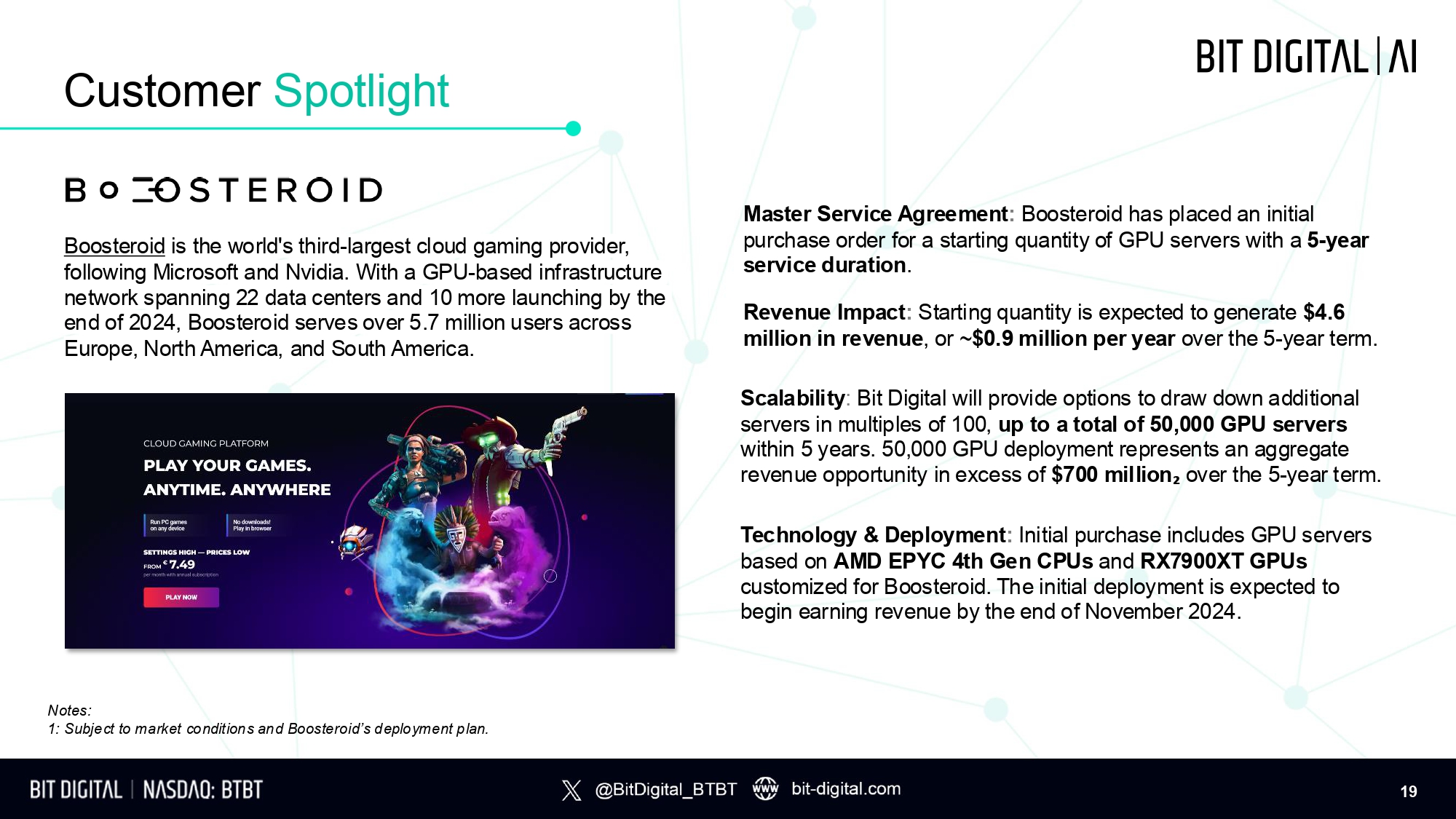 Customer Spotlight Boosteroid is the world's third - largest cloud gaming provider, following Microsoft and Nvidia. With a GPU - based infrastructure network spanning 22 data centers and 10 more launching by the end of 2024, Boosteroid serves over 5.7 million users across E u r o p e , N o r t h A m e r i ca , an d S o u t h A m e r i c a . Master Service Agreement : Boosteroid has placed an initial purchase order for a starting quantity of GPU servers with a 5 - year service duration . Revenue Impact : Starting quantity is expected to generate $4.6 million in revenue , or ~ $0.9 million per year over the 5 - year term. Scalability : Bit Digital will provide options to draw down additional servers in multiples of 100, up to a total of 50,000 GPU servers within 5 years. 50,000 GPU deployment represents an aggregate revenue opportunity in excess of $700 million ₂ over the 5 - year term. Technology & Deployment : Initial purchase includes GPU servers based on AMD EPYC 4th Gen CPUs and RX7900XT GPUs customized for Boosteroid. The initial deployment is expected to begin earning revenue by the end of November 2024. Notes: 1: Subject to market conditions and Boosteroid’s deployment plan. 19