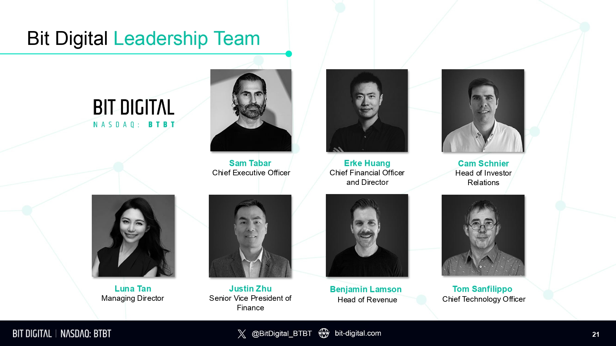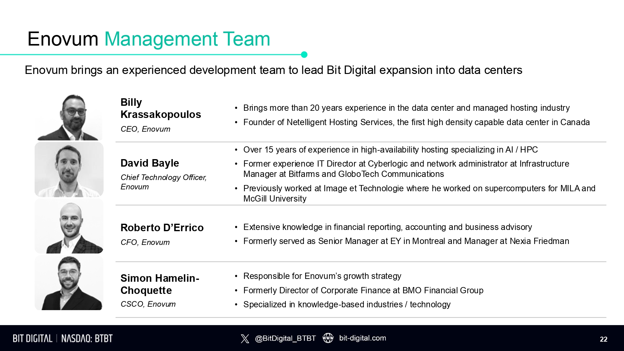 Bit Digital Leadership Team Sam Tabar Chief Executive Officer Erke Huang Chief Financial Officer and Director Luna Tan Managing Director Justin Zhu Senior Vice President of Finance Cam Schnier Head of Investor Relations Benjamin Lamson Head of Revenue Tom Sanfilippo C h i ef T echno l ogy O f f i cer 21