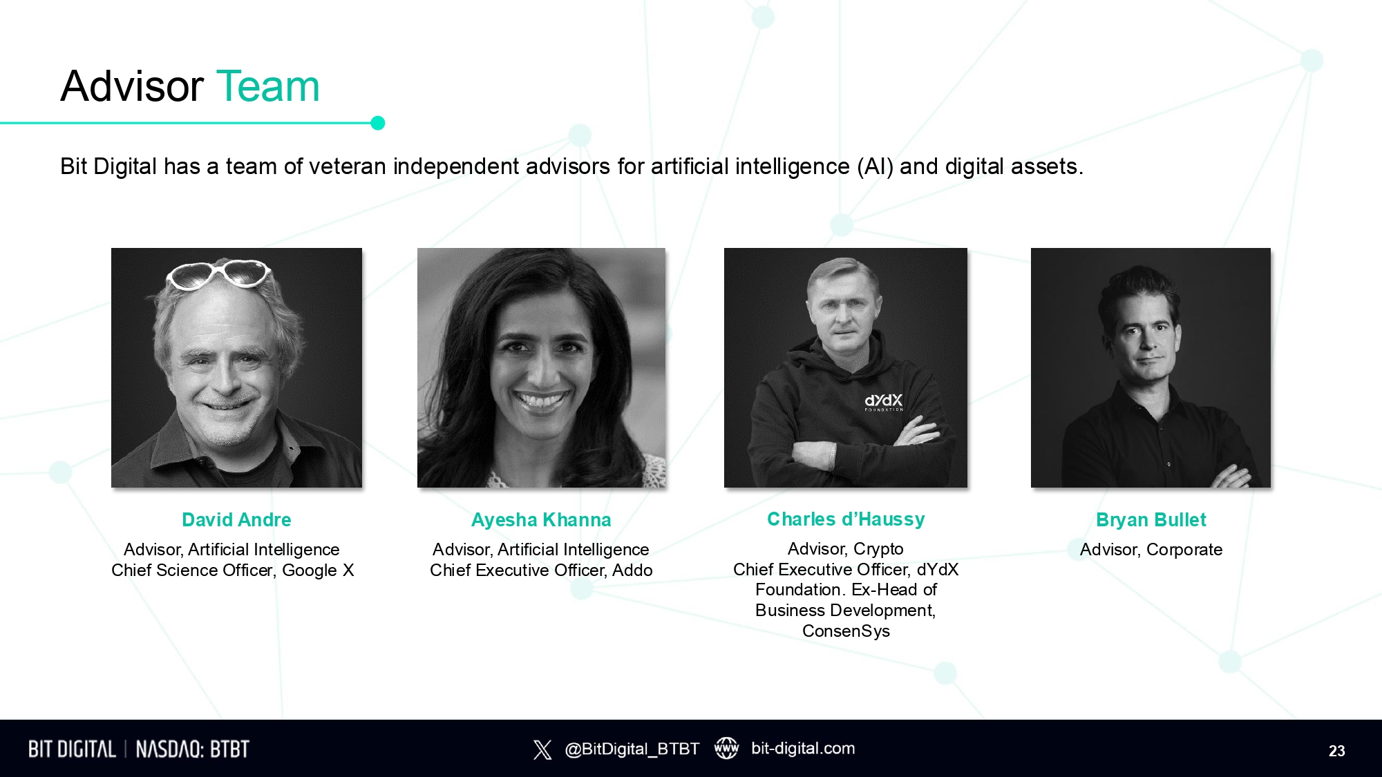 Advisor Team Bit Digital has a team of veteran independent advisors for artificial intelligence (AI) and digital assets. David Andre A d v i s o r , A r t i f i c i a l I n t e l l i ge n ce Chief Science Officer, Google X Ayesha Khanna A d v i s o r , A r t i f i c i a l I n t e l l i ge n ce C h i ef E xecu t i ve O f f i ce r , A ddo Charles d’Haussy Advisor, Crypto Chief Executive Officer, dYdX Foundation. Ex - Head of Business Development, ConsenSys Bryan Bullet Advisor, Corporate 23