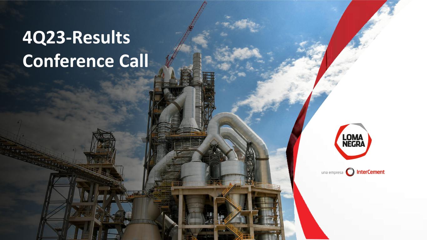 Cement business despite the volume decrease in the fourth quarter, the year closes with a dispatch level among the best in history, which allowed us to achieve solid results As reported results Net revenues reached Ps. 99.4 billion, down 13.2% (US$ 182 million; -15.1%) Adjusted EBITDA stood at Ps. 22.7 billion, down 44.7% (US$ 61 million; -33.0%). Without the sale of non-core asset in 4Q22 was down 25.8% Net Loss of Ps. 20.2 billion Consolidated Adjusted EBITDA margin reached 22.8%, with a contraction of 1,302 bps YoY; without the asset sale in 4Q22 the contraction was 389 bps. FY23 EBITDA of Ps. 100.3 billion (US$ 252 million) and margin of 23.8% Net Profit for FY23 of Ps. 9,7 billion Balance sheet remains solid despite recent devaluation; with Net Debt of US$ 174 million Note: Figures in US dollars result from the calculation of figures expressed in Argentine pesos, as previously reported (without the application of IAS29) and the average exchange rate for each reporting period. 2 RESILIENT PERFORMANCE SOLID RESULTS FOR 2023 DESPITE VOLUME DECREASE