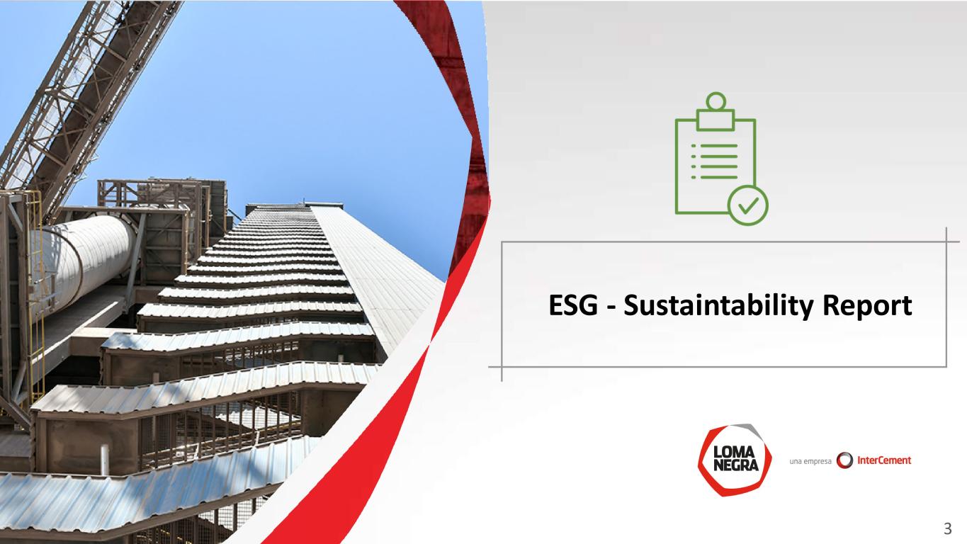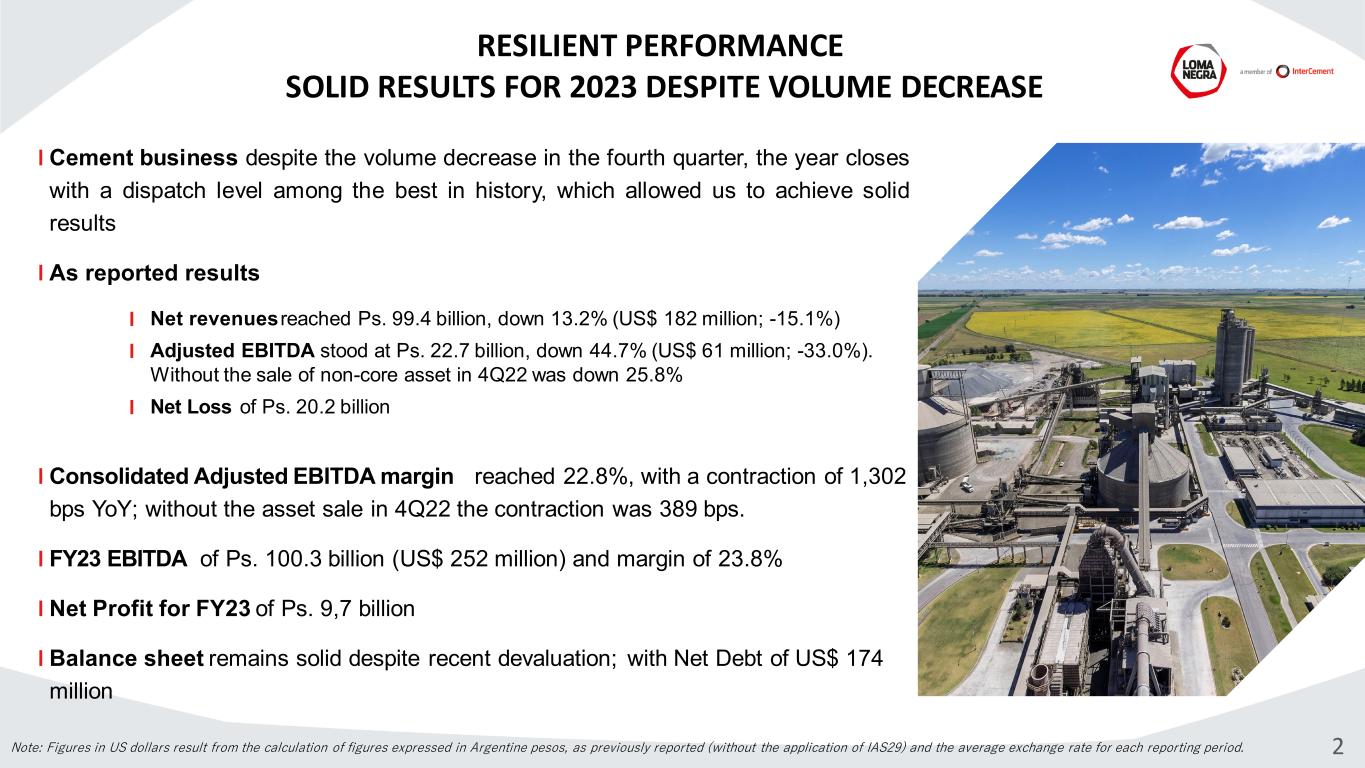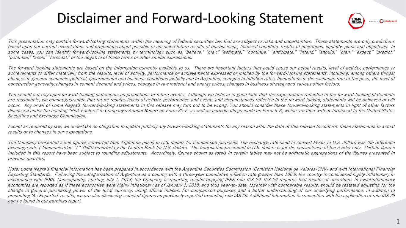 Disclaimer and Forward-Looking Statement This presentation may contain forward-looking statements within the meaning of federal securities law that are subject to risks and uncertainties. These statements are only predictions based upon our current expectations and projections about possible or assumed future results of our business, financial condition, results of operations, liquidity, plans and objectives. In some cases, you can identify forward-looking statements by terminology such as “believe,” “may,” “estimate,” “continue,” “anticipate,” “intend,” “should,” “plan,” “expect,” “predict,” “potential,” “seek,” “forecast,” or the negative of these terms or other similar expressions. The forward-looking statements are based on the information currently available to us. There are important factors that could cause our actual results, level of activity, performance or achievements to differ materially from the results, level of activity, performance or achievements expressed or implied by the forward-looking statements, including, among others things: changes in general economic, political, governmental and business conditions globally and in Argentina, changes in inflation rates, fluctuations in the exchange rate of the peso, the level of construction generally, changes in cement demand and prices, changes in raw material and energy prices, changes in business strategy and various other factors. You should not rely upon forward-looking statements as predictions of future events. Although we believe in good faith that the expectations reflected in the forward-looking statements are reasonable, we cannot guarantee that future results, levels of activity, performance and events and circumstances reflected in the forward-looking statements will be achieved or will occur. Any or all of Loma Negra’s forward-looking statements in this release may turn out to be wrong. You should consider these forward-looking statements in light of other factors discussed under the heading “Risk Factors” in Company’s Annual Report on Form 20-F, as well as periodic filings made on Form 6-K, which are filed with or furnished to the United States Securities and Exchange Commission. Except as required by law, we undertake no obligation to update publicly any forward-looking statements for any reason after the date of this release to conform these statements to actual results or to changes in our expectations. The Company presented some figures converted from Argentine pesos to U.S. dollars for comparison purposes. The exchange rate used to convert Pesos to U.S. dollars was the reference exchange rate (Communication “A” 3500) reported by the Central Bank for U.S. dollars. The information presented in U.S. dollars is for the convenience of the reader only. Certain figures included in this report have been subject to rounding adjustments. Accordingly, figures shown as totals in certain tables may not be arithmetic aggregations of the figures presented in previous quarters. Note: Loma Negra’s financial information has been prepared in accordance with the Argentine Securities Commission (Comisión Nacional de Valores-CNV) and with International Financial Reporting Standards. Following the categorization of Argentina as a country with a three-year cumulative inflation rate greater than 100%, the country is considered highly inflationary in accordance with IFRS. Consequently, starting July 1, 2018, the Company is reporting results applying IFRS rule IAS 29. IAS 29 requires that results of operations in hyperinflationary economies are reported as if these economies were highly inflationary as of January 1, 2018, and thus year-to-date, together with comparable results, should be restated adjusting for the change in general purchasing power of the local currency, using official indices. For comparison purposes and a better understanding of our underlying performance, in addition to presenting ‘As Reported’ results, we are also disclosing selected figures as previously reported excluding rule IAS 29. Additional information in connection with the application of rule IAS 29 can be found in our earnings report. 1