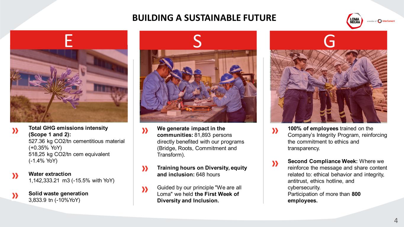 Total GHG emissions intensity (Scope 1 and 2): 527.36 kg CO2/tn cementitious material (+0.35% YoY) 518,25 kg CO2/tn cem equivalent (-1.4% YoY) Water extraction 1,142,333.21 m3 (-15.5% with YoY) Solid waste generation 3,833.9 tn (-10%YoY) 100% of employees trained on the Company’s Integrity Program, reinforcing the commitment to ethics and transparency. Second Compliance Week: Where we reinforce the message and share content related to: ethical behavior and integrity, antitrust, ethics hotline, and cybersecurity. Participation of more than 800 employees. We generate impact in the communities: 81,893 persons directly benefited with our programs (Bridge, Roots, Commitment and Transform). Training hours on Diversity, equity and inclusion: 648 hours Guided by our principle "We are all Loma" we held the First Week of Diversity and Inclusion. BUILDING A SUSTAINABLE FUTURE S G 4 E