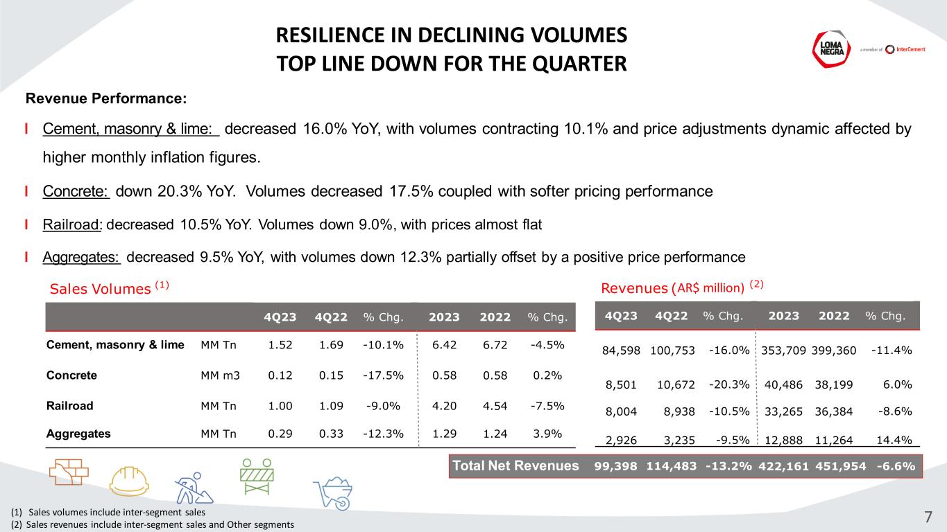 30% 39% 42% 44% 44% 42% 70% 61% 58% 56% 57% 59% 2020 2021 2022 2023 4Q22 4Q23 Bulk Bags (1) Source INDEC and BCRA (Argentina Central Bank) Market Expectations (REM) (2) Source INDEC: Construction activity indicator, ISAC (Indicador Sintético de la Actividad) . (3) Based on AFCP which reports standalone cement sales, while Loma Negra reports Cement, Masonry and lime sales (4) Jan’ 24 : As of the date of this presentation, ISAC figures were not released 6 Ap r Fe b Ja n M ar M ay Ju l N ovJu n Au g De c Se p O ct 202320222020 2021 2024 CONSTRUCTION INDUSTRY EASES ITS ACTIVITY AS IT AWAITS THE GOVERNMENT’S FIRST MOVES GDP Growth1 (YoY Growth, %) Construction Activity2 & Monthly Industry Cement Sales3 (YoY Growth, %) Monthly Industry Cement Sales3 (‘000 tons) Industry Cement Sales by Type3 (%) -9.9 10.4 5.0 -1.6 -3.0 2.8 2.5 1.5 1.4 -5.0 -0.8 20 20 20 21 20 22 20 23 e 20 24 e 20 25 e 20 26 e 4Q 22 1Q 23 2Q 23 3Q 23 4 3 -7 1 -4 -3 -3 -6 -3 -5 3 -2 -12 -5 6 -1 -2 -2 -7 -2 -8 0 -11 -13 Ja n’ 23 Fe b’ 23 M ar ’2 3 Ap r’ 23 M ay ’2 3 Ju n’ 23 Ju l’2 3 Ag o’ 23 Se p’ 23 O ct ’2 3 N ov ’2 3 Di c’ 23 Ja n’ 24 -20 ISAC Cement Industry