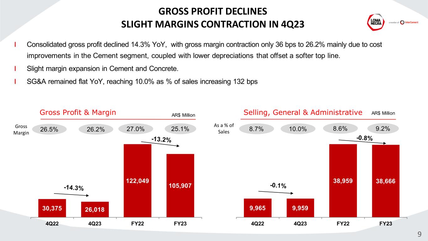 Revenue Performance: Cement, masonry & lime: decreased 16.0% YoY, with volumes contracting 10.1% and price adjustments dynamic affected by higher monthly inflation figures. Concrete: down 20.3% YoY. Volumes decreased 17.5% coupled with softer pricing performance Railroad: decreased 10.5% YoY. Volumes down 9.0%, with prices almost flat Aggregates: decreased 9.5% YoY, with volumes down 12.3% partially offset by a positive price performance (1) Sales volumes include inter-segment sales (2) Sales revenues include inter-segment sales and Other segments 7 RESILIENCE IN DECLINING VOLUMES TOP LINE DOWN FOR THE QUARTER Sales Volumes (1) Revenues (AR$ million) (2) Total Net Revenues 99,398 114,483 -13.2% 4Q23 4Q22 % Chg. Cement, masonry & lime MM Tn 1.52 1.69 -10.1% Concrete MM m3 0.12 0.15 -17.5% Railroad MM Tn 1.00 1.09 -9.0% Aggregates MM Tn 0.29 0.33 -12.3% 4Q23 4Q22 % Chg. 84,598 100,753 -16.0% 8,501 10,672 -20.3% 8,004 8,938 -10.5% 2,926 3,235 -9.5% 2023 2022 % Chg. 353,709 399,360 -11.4% 40,486 38,199 6.0% 33,265 36,384 -8.6% 12,888 11,264 14.4% 422,161 451,954 -6.6% 2023 2022 % Chg. 6.42 6.72 -4.5% 0.58 0.58 0.2% 4.20 4.54 -7.5% 1.29 1.24 3.9%