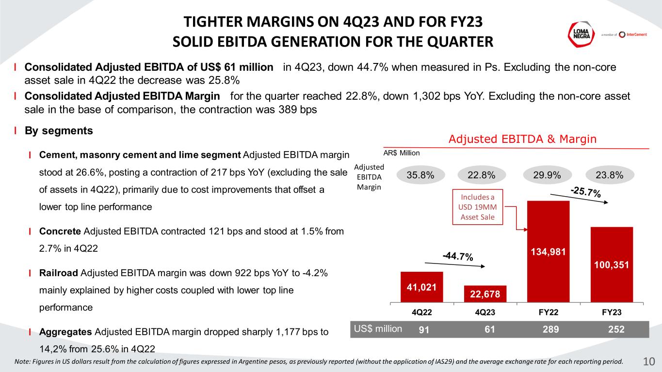Consolidated gross profit declined 14.3% YoY, with gross margin contraction only 36 bps to 26.2% mainly due to cost improvements in the Cement segment, coupled with lower depreciations that offset a softer top line. Slight margin expansion in Cement and Concrete. SG&A remained flat YoY, reaching 10.0% as % of sales increasing 132 bps 9 30,375 26,018 122,049 105,907 4Q22 4Q23 FY22 FY23 Gross Profit & Margin 9,965 9,959 38,959 38,666 4Q22 4Q23 FY22 FY23 Selling, General & Administrative As a % of Sales AR$ Million AR$ Million Gross Margin 25.1%26.5% 8.7% 9.2% GROSS PROFIT DECLINES SLIGHT MARGINS CONTRACTION IN 4Q23 26.2% 27.0% 10.0% 8.6%