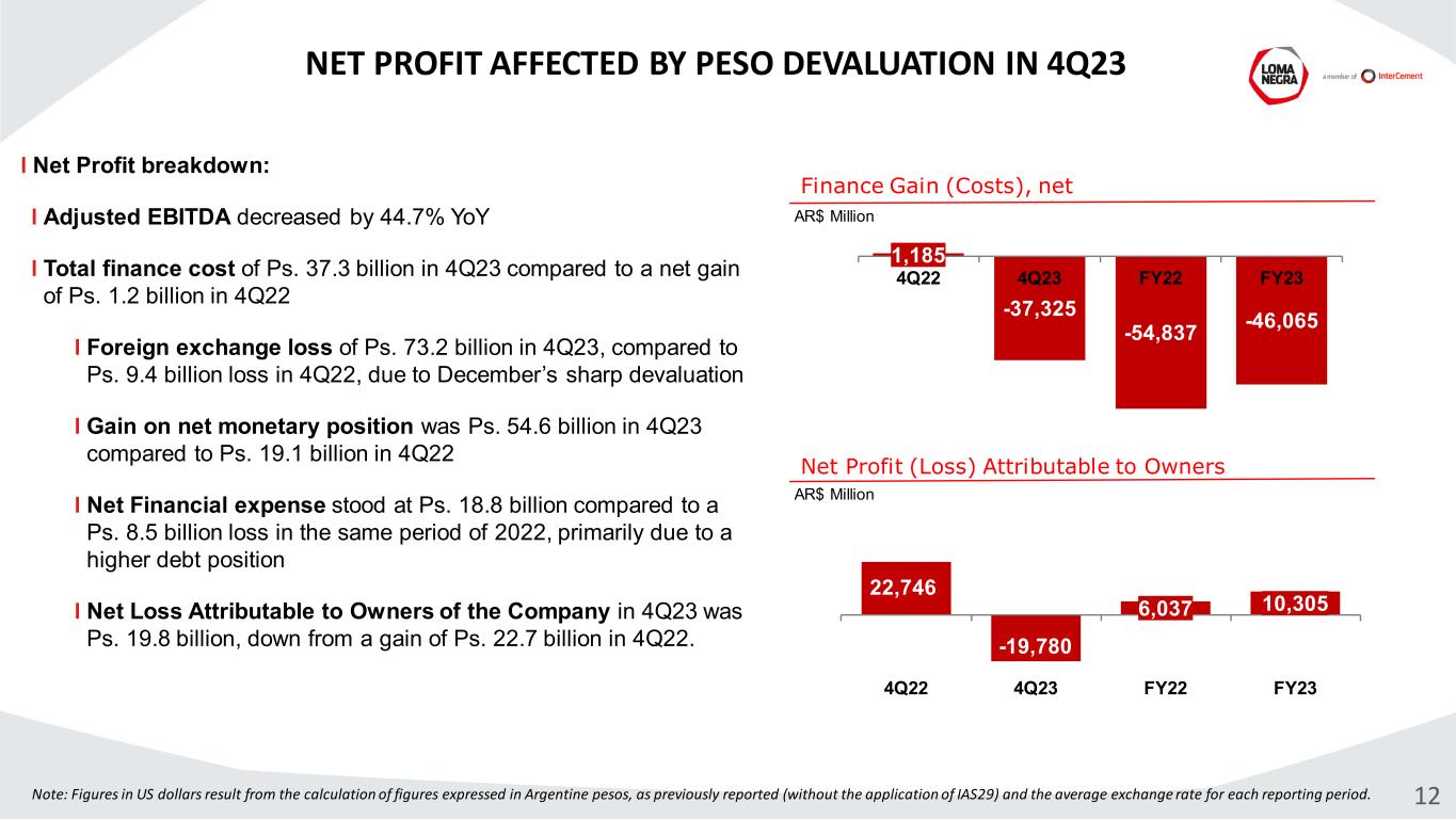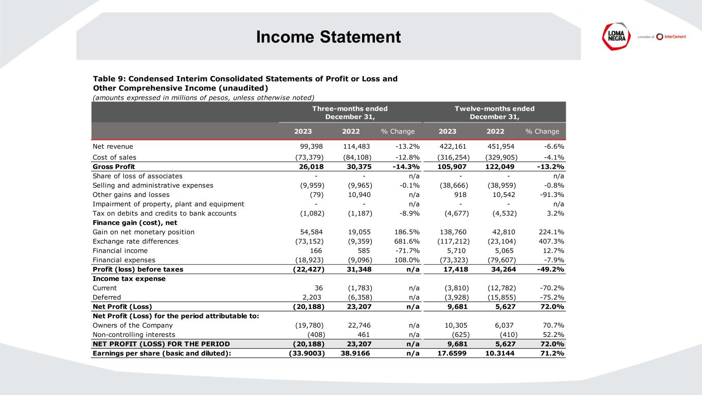 Income Statement (amounts expressed in millions of pesos, unless otherwise noted) 2023 2022 % Change 2023 2022 % Change Net revenue 99,398 114,483 -13.2% 422,161 451,954 -6.6% Cost of sales (73,379) (84,108) -12.8% (316,254) (329,905) -4.1% Gross Profit 26,018 30,375 -14.3% 105,907 122,049 -13.2% Share of loss of associates - - n/a - - n/a Selling and administrative expenses (9,959) (9,965) -0.1% (38,666) (38,959) -0.8% Other gains and losses (79) 10,940 n/a 918 10,542 -91.3% Impairment of property, plant and equipment - - n/a - - n/a Tax on debits and credits to bank accounts (1,082) (1,187) -8.9% (4,677) (4,532) 3.2% Finance gain (cost), net Gain on net monetary position 54,584 19,055 186.5% 138,760 42,810 224.1% Exchange rate differences (73,152) (9,359) 681.6% (117,212) (23,104) 407.3% Financial income 166 585 -71.7% 5,710 5,065 12.7% Financial expenses (18,923) (9,096) 108.0% (73,323) (79,607) -7.9% Profit (loss) before taxes (22,427) 31,348 n/a 17,418 34,264 -49.2% Income tax expense Current 36 (1,783) n/a (3,810) (12,782) -70.2% Deferred 2,203 (6,358) n/a (3,928) (15,855) -75.2% Net Profit (Loss) (20,188) 23,207 n/a 9,681 5,627 72.0% Net Profit (Loss) for the period attributable to: Owners of the Company (19,780) 22,746 n/a 10,305 6,037 70.7% Non-controlling interests (408) 461 n/a (625) (410) 52.2% NET PROFIT (LOSS) FOR THE PERIOD (20,188) 23,207 n/a 9,681 5,627 72.0% Earnings per share (basic and diluted): (33.9003) 38.9166 n/a 17.6599 10.3144 71.2% Table 9: Condensed Interim Consolidated Statements of Profit or Loss and Other Comprehensive Income (unaudited) Three-months ended December 31, Twelve-months ended December 31,