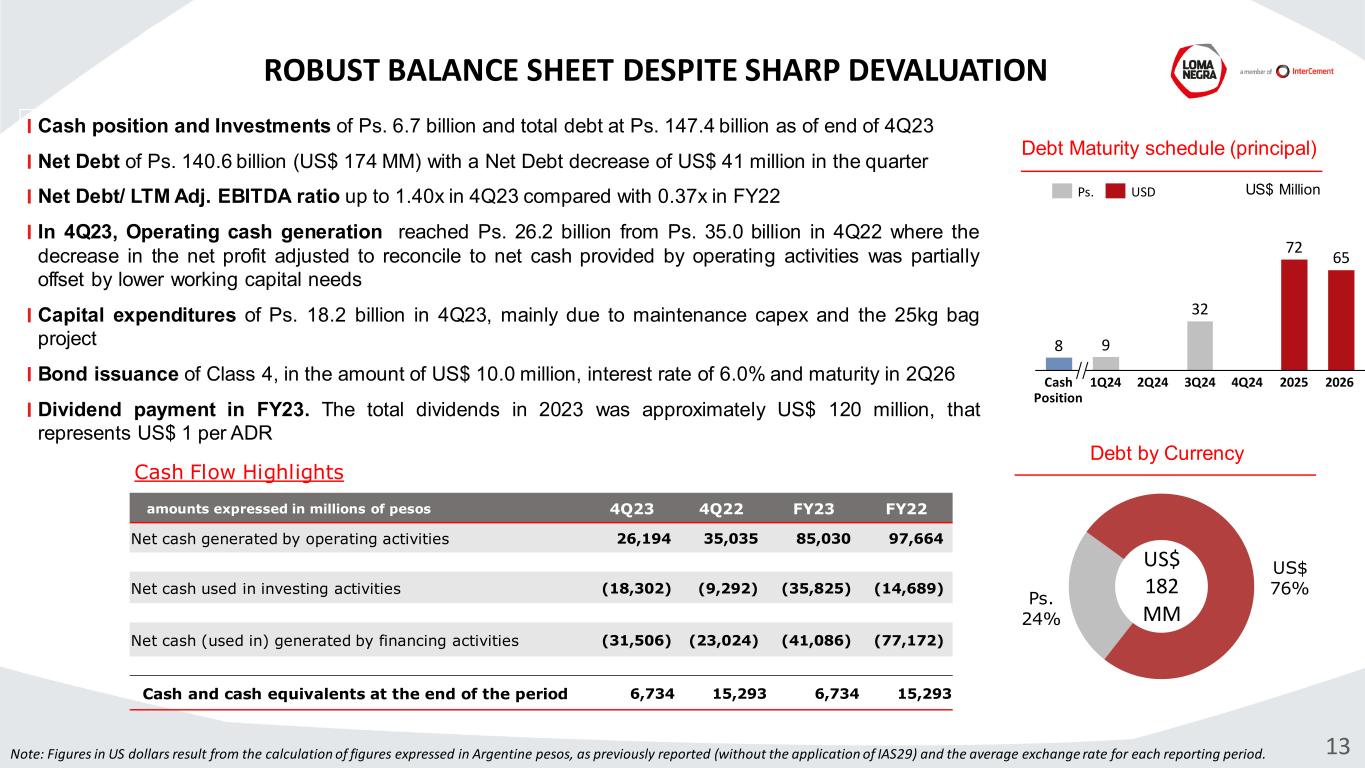 22,746 -19,780 6,037 10,305 4Q22 4Q23 FY22 FY23 Net Profit (Loss) Attributable to Owners AR$ Million Net Profit breakdown: Adjusted EBITDA decreased by 44.7% YoY Total finance cost of Ps. 37.3 billion in 4Q23 compared to a net gain of Ps. 1.2 billion in 4Q22 Foreign exchange loss of Ps. 73.2 billion in 4Q23, compared to Ps. 9.4 billion loss in 4Q22, due to December’s sharp devaluation Gain on net monetary position was Ps. 54.6 billion in 4Q23 compared to Ps. 19.1 billion in 4Q22 Net Financial expense stood at Ps. 18.8 billion compared to a Ps. 8.5 billion loss in the same period of 2022, primarily due to a higher debt position Net Loss Attributable to Owners of the Company in 4Q23 was Ps. 19.8 billion, down from a gain of Ps. 22.7 billion in 4Q22. 1,185 -37,325 -54,837 -46,065 4Q22 4Q23 FY22 FY23 Finance Gain (Costs), net AR$ Million 492 Note: Figures in US dollars result from the calculation of figures expressed in Argentine pesos, as previously reported (without the application of IAS29) and the average exchange rate for each reporting period. 12 NET PROFIT AFFECTED BY PESO DEVALUATION IN 4Q23