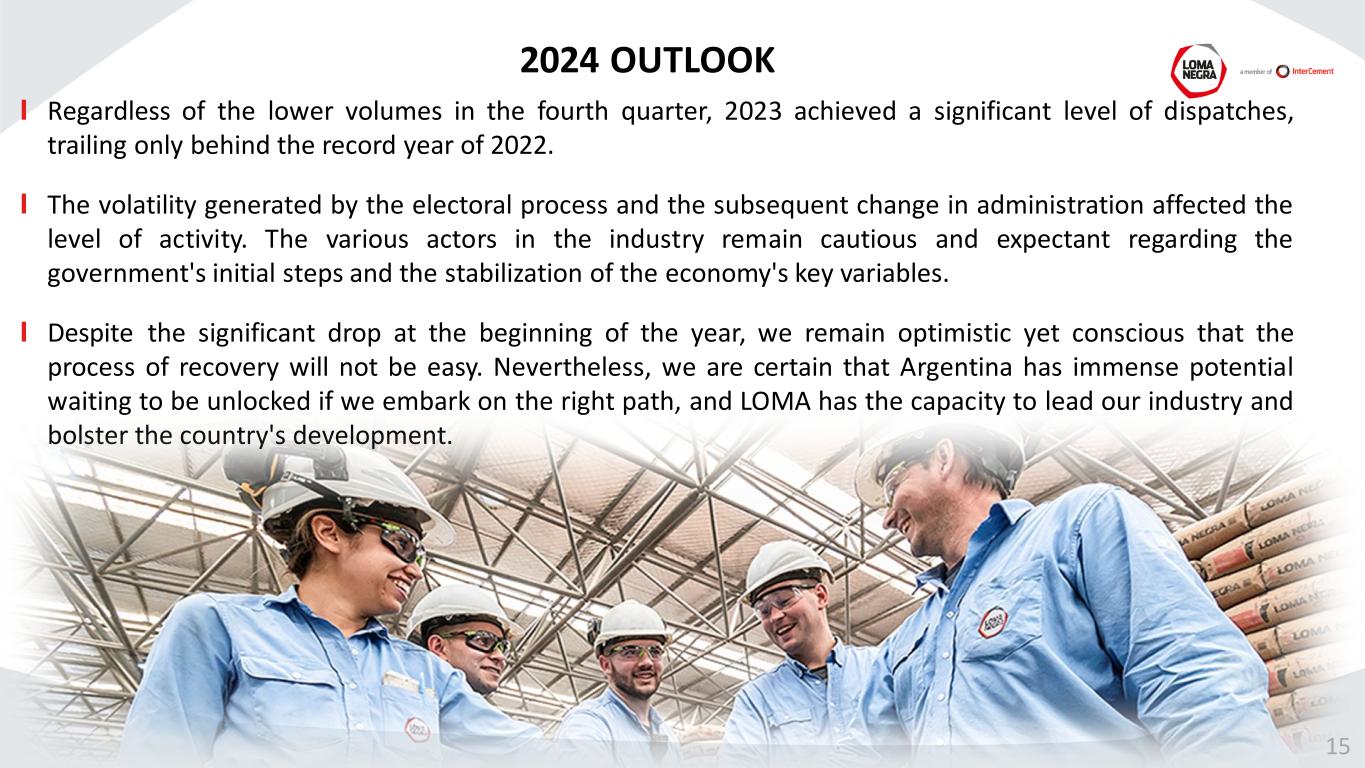 Regardless of the lower volumes in the fourth quarter, 2023 achieved a significant level of dispatches, trailing only behind the record year of 2022. The volatility generated by the electoral process and the subsequent change in administration affected the level of activity. The various actors in the industry remain cautious and expectant regarding the government's initial steps and the stabilization of the economy's key variables. Despite the significant drop at the beginning of the year, we remain optimistic yet conscious that the process of recovery will not be easy. Nevertheless, we are certain that Argentina has immense potential waiting to be unlocked if we embark on the right path, and LOMA has the capacity to lead our industry and bolster the country's development. 2024 OUTLOOK 15