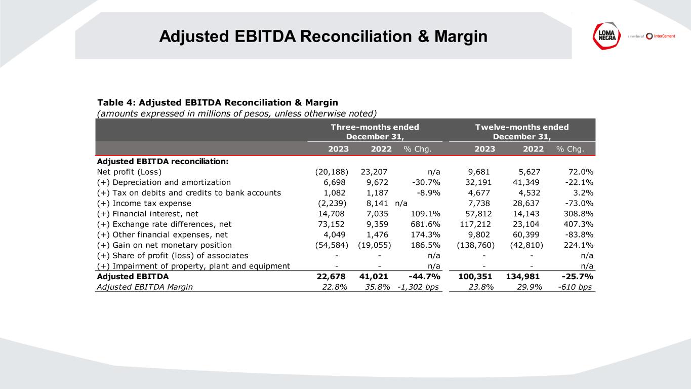 Adjusted EBITDA Reconciliation & Margin Table 4: Adjusted EBITDA Reconciliation & Margin (amounts expressed in millions of pesos, unless otherwise noted) 2023 2022 % Chg. 2023 2022 % Chg. Adjusted EBITDA reconciliation: Net profit (Loss) (20,188) 23,207 n/a 9,681 5,627 72.0% (+) Depreciation and amortization 6,698 9,672 -30.7% 32,191 41,349 -22.1% (+) Tax on debits and credits to bank accounts 1,082 1,187 -8.9% 4,677 4,532 3.2% (+) Income tax expense (2,239) 8,141 n/a 7,738 28,637 -73.0% (+) Financial interest, net 14,708 7,035 109.1% 57,812 14,143 308.8% (+) Exchange rate differences, net 73,152 9,359 681.6% 117,212 23,104 407.3% (+) Other financial expenses, net 4,049 1,476 174.3% 9,802 60,399 -83.8% (+) Gain on net monetary position (54,584) (19,055) 186.5% (138,760) (42,810) 224.1% (+) Share of profit (loss) of associates - - n/a - - n/a (+) Impairment of property, plant and equipment - - n/a - - n/a Adjusted EBITDA 22,678 41,021 -44.7% 100,351 134,981 -25.7% Adjusted EBITDA Margin 22.8% 35.8% -1,302 bps 23.8% 29.9% -610 bps Three-months ended December 31, Twelve-months ended December 31,