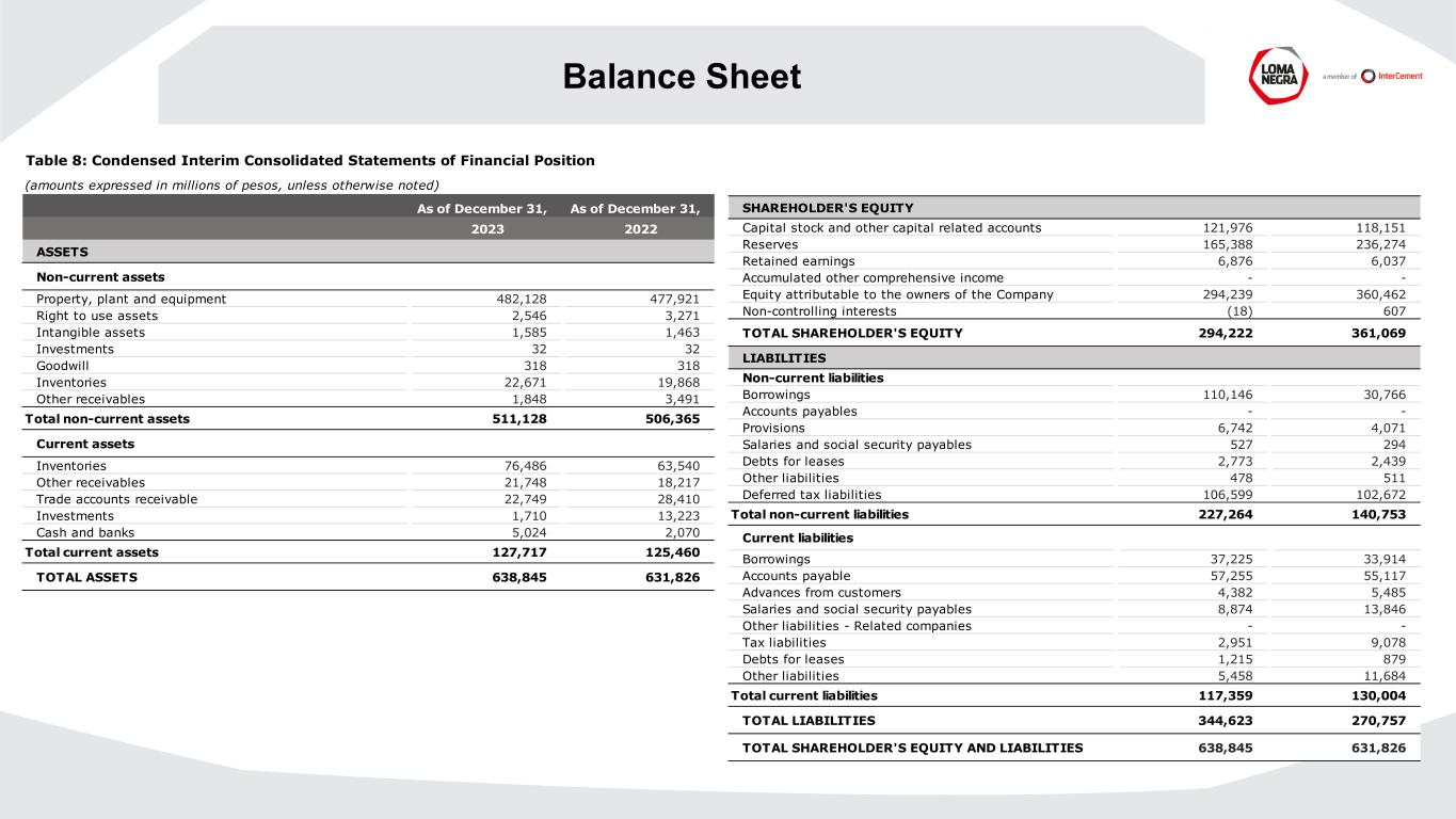 Balance Sheet As of December 31, As of December 31, 2023 2022 ASSETS Non-current assets Property, plant and equipment 482,128 477,921 Right to use assets 2,546 3,271 Intangible assets 1,585 1,463 Investments 32 32 Goodwill 318 318 Inventories 22,671 19,868 Other receivables 1,848 3,491 Total non-current assets 511,128 506,365 Current assets Inventories 76,486 63,540 Other receivables 21,748 18,217 Trade accounts receivable 22,749 28,410 Investments 1,710 13,223 Cash and banks 5,024 2,070 Total current assets 127,717 125,460 TOTAL ASSETS 638,845 631,826 Table 8: Condensed Interim Consolidated Statements of Financial Position (amounts expressed in millions of pesos, unless otherwise noted) SHAREHOLDER'S EQUITY Capital stock and other capital related accounts 121,976 118,151 Reserves 165,388 236,274 Retained earnings 6,876 6,037 Accumulated other comprehensive income - - Equity attributable to the owners of the Company 294,239 360,462 Non-controlling interests (18) 607 TOTAL SHAREHOLDER'S EQUITY 294,222 361,069 LIABILITIES Non-current liabilities Borrowings 110,146 30,766 Accounts payables - - Provisions 6,742 4,071 Salaries and social security payables 527 294 Debts for leases 2,773 2,439 Other liabilities 478 511 Deferred tax liabilities 106,599 102,672 Total non-current liabilities 227,264 140,753 Current liabilities Borrowings 37,225 33,914 Accounts payable 57,255 55,117 Advances from customers 4,382 5,485 Salaries and social security payables 8,874 13,846 Other liabilities - Related companies - - Tax liabilities 2,951 9,078 Debts for leases 1,215 879 Other liabilities 5,458 11,684 Total current liabilities 117,359 130,004 TOTAL LIABILITIES 344,623 270,757 TOTAL SHAREHOLDER'S EQUITY AND LIABILITIES 638,845 631,826