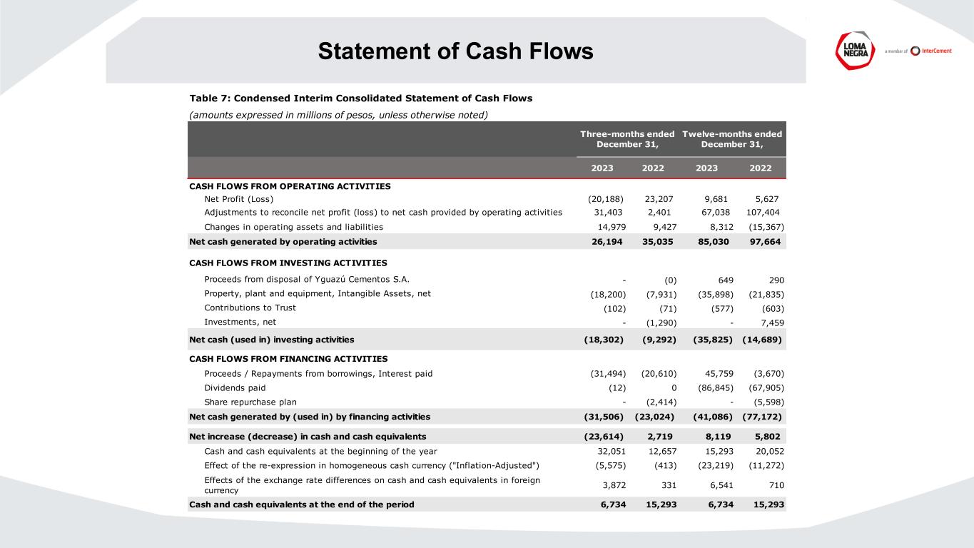 Statement of Cash Flows Table 7: Condensed Interim Consolidated Statement of Cash Flows (amounts expressed in millions of pesos, unless otherwise noted) 2023 2022 2023 2022 CASH FLOWS FROM OPERATING ACTIVITIES Net Profit (Loss) (20,188) 23,207 9,681 5,627 Adjustments to reconcile net profit (loss) to net cash provided by operating activities 31,403 2,401 67,038 107,404 Changes in operating assets and liabilities 14,979 9,427 8,312 (15,367) Net cash generated by operating activities 26,194 35,035 85,030 97,664 CASH FLOWS FROM INVESTING ACTIVITIES Proceeds from disposal of Yguazú Cementos S.A. - (0) 649 290 Property, plant and equipment, Intangible Assets, net (18,200) (7,931) (35,898) (21,835) Contributions to Trust (102) (71) (577) (603) Investments, net - (1,290) - 7,459 Net cash (used in) investing activities (18,302) (9,292) (35,825) (14,689) CASH FLOWS FROM FINANCING ACTIVITIES Proceeds / Repayments from borrowings, Interest paid (31,494) (20,610) 45,759 (3,670) Dividends paid (12) 0 (86,845) (67,905) Share repurchase plan - (2,414) - (5,598) Net cash generated by (used in) by financing activities (31,506) (23,024) (41,086) (77,172) Net increase (decrease) in cash and cash equivalents (23,614) 2,719 8,119 5,802 Cash and cash equivalents at the beginning of the year 32,051 12,657 15,293 20,052 Effect of the re-expression in homogeneous cash currency ("Inflation-Adjusted") (5,575) (413) (23,219) (11,272) Effects of the exchange rate differences on cash and cash equivalents in foreign currency 3,872 331 6,541 710 Cash and cash equivalents at the end of the period 6,734 15,293 6,734 15,293 Twelve-months ended December 31, Three-months ended December 31,