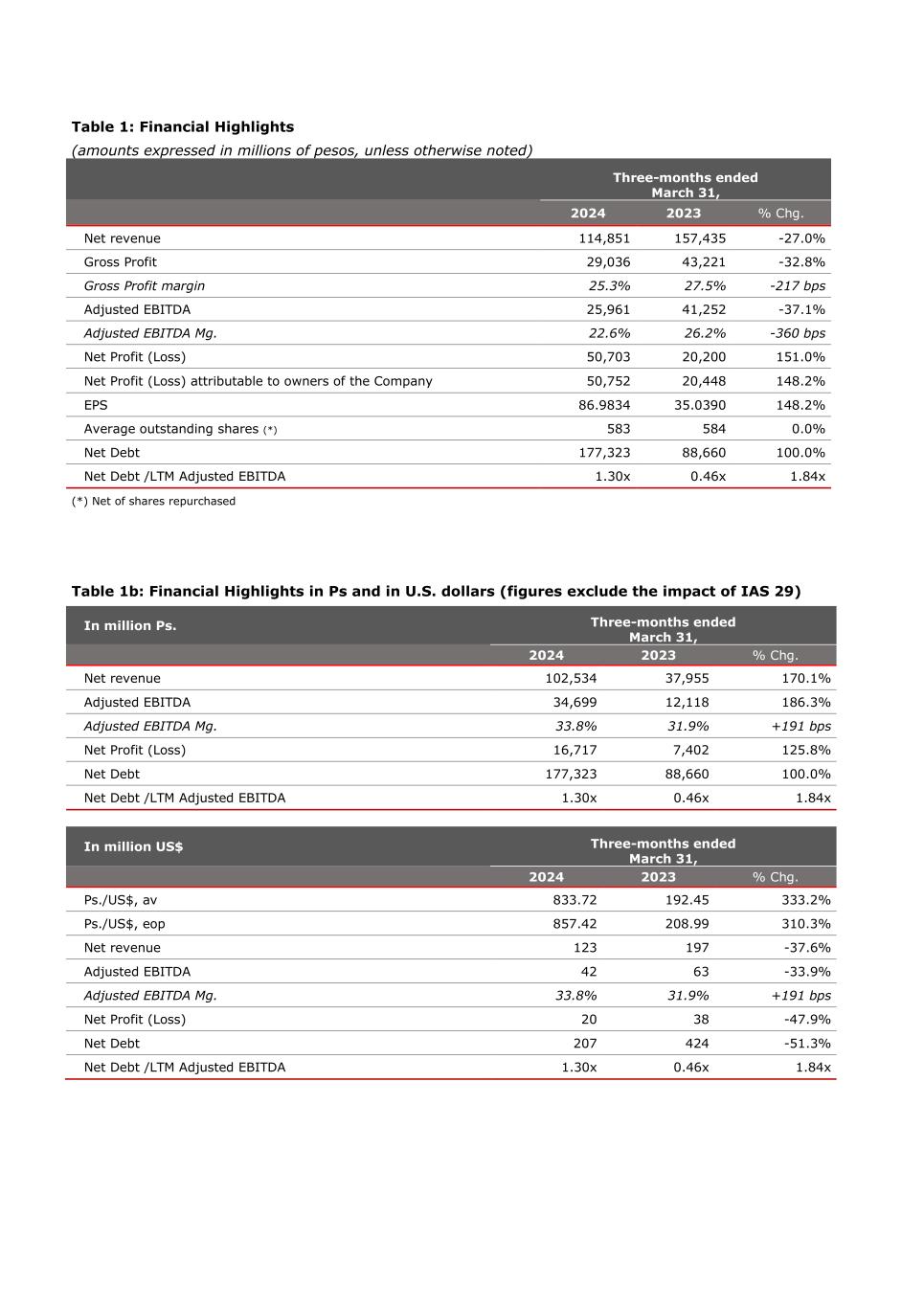Table 1: Financial Highlights (amounts expressed in millions of pesos, unless otherwise noted) Three-months ended March 31, 2024 2023 % Chg. Net revenue 114,851 157,435 -27.0% Gross Profit 29,036 43,221 -32.8% Gross Profit margin 25.3% 27.5% -217 bps Adjusted EBITDA 25,961 41,252 -37.1% Adjusted EBITDA Mg. 22.6% 26.2% -360 bps Net Profit (Loss) 50,703 20,200 151.0% Net Profit (Loss) attributable to owners of the Company 50,752 20,448 148.2% EPS 86.9834 35.0390 148.2% Average outstanding shares (*) 583 584 0.0% Net Debt 177,323 88,660 100.0% Net Debt /LTM Adjusted EBITDA 1.30x 0.46x 1.84x (*) Net of shares repurchased Table 1b: Financial Highlights in Ps and in U.S. dollars (figures exclude the impact of IAS 29) In million Ps. Three-months ended March 31, 2024 2023 % Chg. Net revenue 102,534 37,955 170.1% Adjusted EBITDA 34,699 12,118 186.3% Adjusted EBITDA Mg. 33.8% 31.9% +191 bps Net Profit (Loss) 16,717 7,402 125.8% Net Debt 177,323 88,660 100.0% Net Debt /LTM Adjusted EBITDA 1.30x 0.46x 1.84x In million US$ Three-months ended March 31, 2024 2023 % Chg. Ps./US$, av 833.72 192.45 333.2% Ps./US$, eop 857.42 208.99 310.3% Net revenue 123 197 -37.6% Adjusted EBITDA 42 63 -33.9% Adjusted EBITDA Mg. 33.8% 31.9% +191 bps Net Profit (Loss) 20 38 -47.9% Net Debt 207 424 -51.3% Net Debt /LTM Adjusted EBITDA 1.30x 0.46x 1.84x