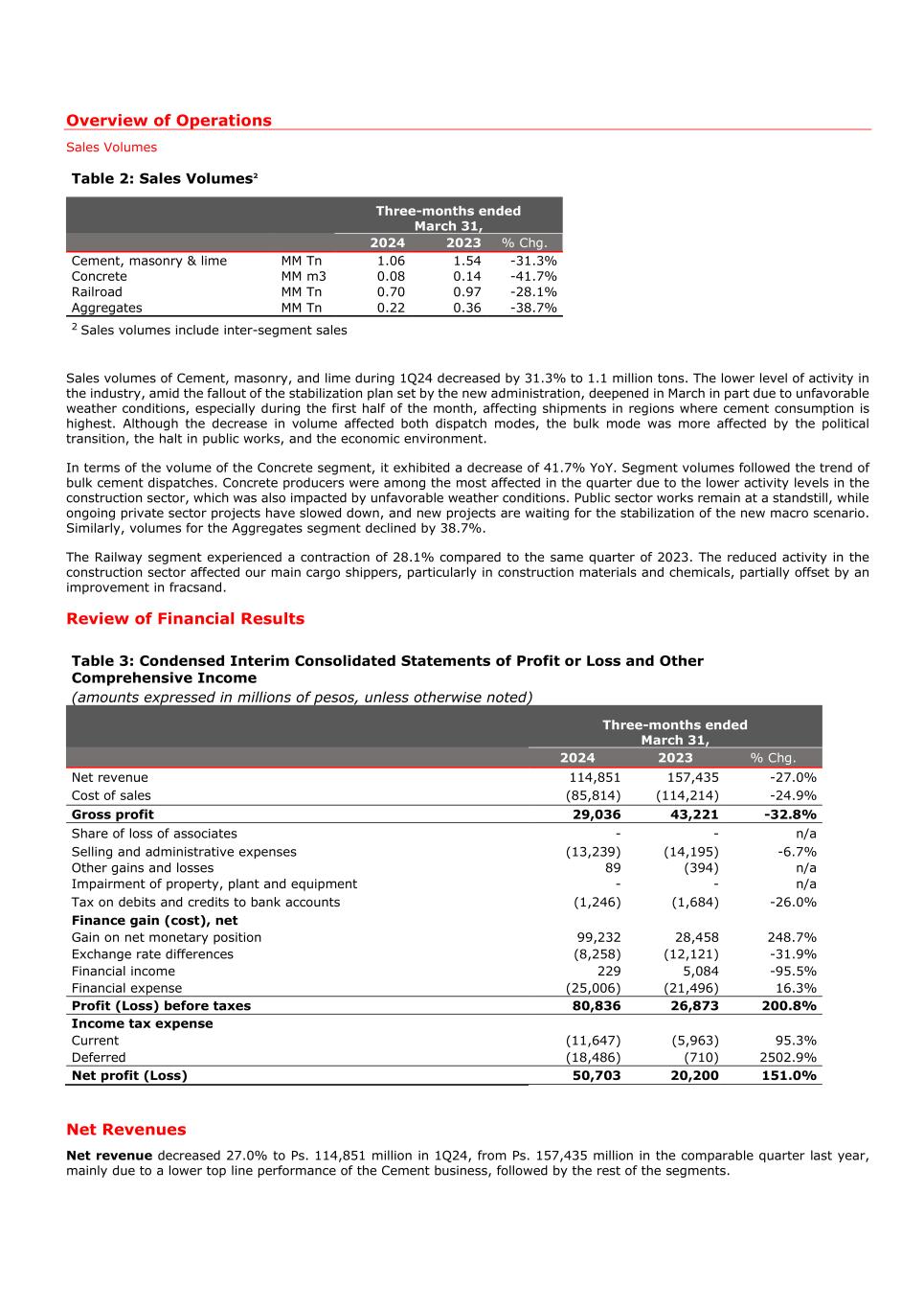 Overview of Operations Sales Volumes Table 2: Sales Volumes2 Three-months ended March 31, 2024 2023 % Chg. Cement, masonry & lime MM Tn 1.06 1.54 -31.3% Concrete MM m3 0.08 0.14 -41.7% Railroad MM Tn 0.70 0.97 -28.1% Aggregates MM Tn 0.22 0.36 -38.7% 2 Sales volumes include inter-segment sales Sales volumes of Cement, masonry, and lime during 1Q24 decreased by 31.3% to 1.1 million tons. The lower level of activity in the industry, amid the fallout of the stabilization plan set by the new administration, deepened in March in part due to unfavorable weather conditions, especially during the first half of the month, affecting shipments in regions where cement consumption is highest. Although the decrease in volume affected both dispatch modes, the bulk mode was more affected by the political transition, the halt in public works, and the economic environment. In terms of the volume of the Concrete segment, it exhibited a decrease of 41.7% YoY. Segment volumes followed the trend of bulk cement dispatches. Concrete producers were among the most affected in the quarter due to the lower activity levels in the construction sector, which was also impacted by unfavorable weather conditions. Public sector works remain at a standstill, while ongoing private sector projects have slowed down, and new projects are waiting for the stabilization of the new macro scenario. Similarly, volumes for the Aggregates segment declined by 38.7%. The Railway segment experienced a contraction of 28.1% compared to the same quarter of 2023. The reduced activity in the construction sector affected our main cargo shippers, particularly in construction materials and chemicals, partially offset by an improvement in fracsand. Review of Financial Results Table 3: Condensed Interim Consolidated Statements of Profit or Loss and Other Comprehensive Income (amounts expressed in millions of pesos, unless otherwise noted) Three-months ended March 31, 2024 2023 % Chg. Net revenue 114,851 157,435 -27.0% Cost of sales (85,814) (114,214) -24.9% Gross profit 29,036 43,221 -32.8% Share of loss of associates - - n/a Selling and administrative expenses (13,239) (14,195) -6.7% Other gains and losses 89 (394) n/a Impairment of property, plant and equipment - - n/a Tax on debits and credits to bank accounts (1,246) (1,684) -26.0% Finance gain (cost), net Gain on net monetary position 99,232 28,458 248.7% Exchange rate differences (8,258) (12,121) -31.9% Financial income 229 5,084 -95.5% Financial expense (25,006) (21,496) 16.3% Profit (Loss) before taxes 80,836 26,873 200.8% Income tax expense Current (11,647) (5,963) 95.3% Deferred (18,486) (710) 2502.9% Net profit (Loss) 50,703 20,200 151.0% Net Revenues Net revenue decreased 27.0% to Ps. 114,851 million in 1Q24, from Ps. 157,435 million in the comparable quarter last year, mainly due to a lower top line performance of the Cement business, followed by the rest of the segments.