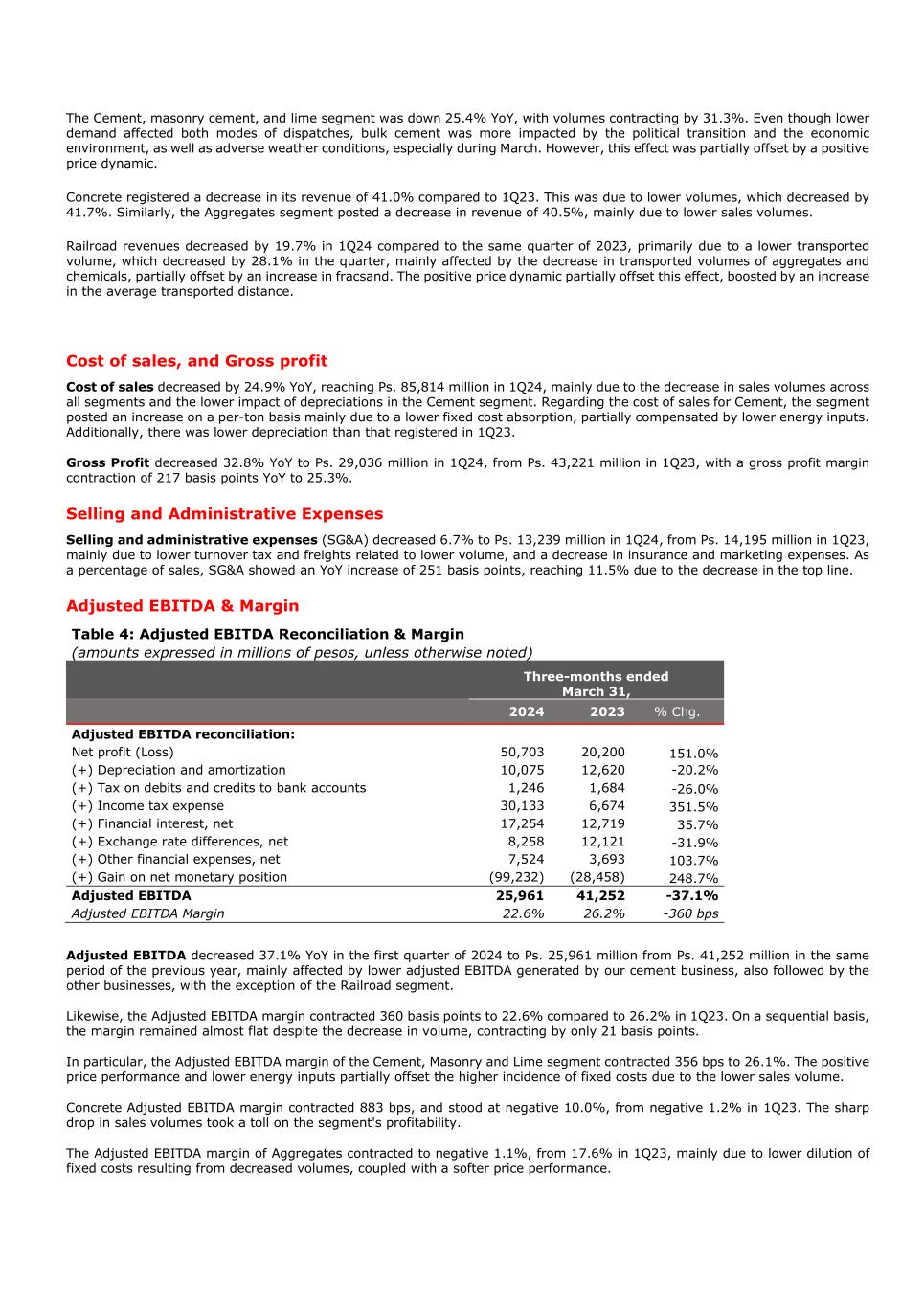 The Cement, masonry cement, and lime segment was down 25.4% YoY, with volumes contracting by 31.3%. Even though lower demand affected both modes of dispatches, bulk cement was more impacted by the political transition and the economic environment, as well as adverse weather conditions, especially during March. However, this effect was partially offset by a positive price dynamic. Concrete registered a decrease in its revenue of 41.0% compared to 1Q23. This was due to lower volumes, which decreased by 41.7%. Similarly, the Aggregates segment posted a decrease in revenue of 40.5%, mainly due to lower sales volumes. Railroad revenues decreased by 19.7% in 1Q24 compared to the same quarter of 2023, primarily due to a lower transported volume, which decreased by 28.1% in the quarter, mainly affected by the decrease in transported volumes of aggregates and chemicals, partially offset by an increase in fracsand. The positive price dynamic partially offset this effect, boosted by an increase in the average transported distance. Cost of sales, and Gross profit Cost of sales decreased by 24.9% YoY, reaching Ps. 85,814 million in 1Q24, mainly due to the decrease in sales volumes across all segments and the lower impact of depreciations in the Cement segment. Regarding the cost of sales for Cement, the segment posted an increase on a per-ton basis mainly due to a lower fixed cost absorption, partially compensated by lower energy inputs. Additionally, there was lower depreciation than that registered in 1Q23. Gross Profit decreased 32.8% YoY to Ps. 29,036 million in 1Q24, from Ps. 43,221 million in 1Q23, with a gross profit margin contraction of 217 basis points YoY to 25.3%. Selling and Administrative Expenses Selling and administrative expenses (SG&A) decreased 6.7% to Ps. 13,239 million in 1Q24, from Ps. 14,195 million in 1Q23, mainly due to lower turnover tax and freights related to lower volume, and a decrease in insurance and marketing expenses. As a percentage of sales, SG&A showed an YoY increase of 251 basis points, reaching 11.5% due to the decrease in the top line. Adjusted EBITDA & Margin Table 4: Adjusted EBITDA Reconciliation & Margin (amounts expressed in millions of pesos, unless otherwise noted) Three-months ended March 31, 2024 2023 % Chg. Adjusted EBITDA reconciliation: Net profit (Loss) 50,703 20,200 151.0% (+) Depreciation and amortization 10,075 12,620 -20.2% (+) Tax on debits and credits to bank accounts 1,246 1,684 -26.0% (+) Income tax expense 30,133 6,674 351.5% (+) Financial interest, net 17,254 12,719 35.7% (+) Exchange rate differences, net 8,258 12,121 -31.9% (+) Other financial expenses, net 7,524 3,693 103.7% (+) Gain on net monetary position (99,232) (28,458) 248.7% Adjusted EBITDA 25,961 41,252 -37.1% Adjusted EBITDA Margin 22.6% 26.2% -360 bps Adjusted EBITDA decreased 37.1% YoY in the first quarter of 2024 to Ps. 25,961 million from Ps. 41,252 million in the same period of the previous year, mainly affected by lower adjusted EBITDA generated by our cement business, also followed by the other businesses, with the exception of the Railroad segment. Likewise, the Adjusted EBITDA margin contracted 360 basis points to 22.6% compared to 26.2% in 1Q23. On a sequential basis, the margin remained almost flat despite the decrease in volume, contracting by only 21 basis points. In particular, the Adjusted EBITDA margin of the Cement, Masonry and Lime segment contracted 356 bps to 26.1%. The positive price performance and lower energy inputs partially offset the higher incidence of fixed costs due to the lower sales volume. Concrete Adjusted EBITDA margin contracted 883 bps, and stood at negative 10.0%, from negative 1.2% in 1Q23. The sharp drop in sales volumes took a toll on the segment's profitability. The Adjusted EBITDA margin of Aggregates contracted to negative 1.1%, from 17.6% in 1Q23, mainly due to lower dilution of fixed costs resulting from decreased volumes, coupled with a softer price performance.
