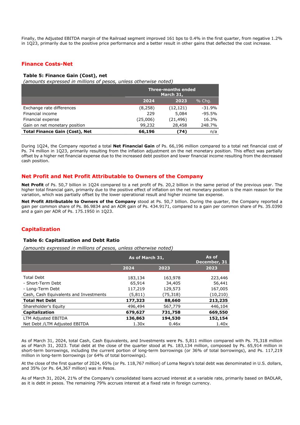 Finally, the Adjusted EBITDA margin of the Railroad segment improved 161 bps to 0.4% in the first quarter, from negative 1.2% in 1Q23, primarily due to the positive price performance and a better result in other gains that deflected the cost increase. Finance Costs-Net Table 5: Finance Gain (Cost), net (amounts expressed in millions of pesos, unless otherwise noted) Three-months ended March 31, 2024 2023 % Chg. Exchange rate differences (8,258) (12,121) -31.9% Financial income 229 5,084 -95.5% Financial expense (25,006) (21,496) 16.3% Gain on net monetary position 99,232 28,458 248.7% Total Finance Gain (Cost), Net 66,196 (74) n/a During 1Q24, the Company reported a total Net Financial Gain of Ps. 66,196 million compared to a total net financial cost of Ps. 74 million in 1Q23, primarily resulting from the inflation adjustment on the net monetary position. This effect was partially offset by a higher net financial expense due to the increased debt position and lower financial income resulting from the decreased cash position. Net Profit and Net Profit Attributable to Owners of the Company Net Profit of Ps. 50,7 billion in 1Q24 compared to a net profit of Ps. 20,2 billion in the same period of the previous year. The higher total financial gain, primarily due to the positive effect of inflation on the net monetary position is the main reason for the variation, which was partially offset by the lower operational result and higher income tax expense. Net Profit Attributable to Owners of the Company stood at Ps. 50,7 billion. During the quarter, the Company reported a gain per common share of Ps. 86.9834 and an ADR gain of Ps. 434.9171, compared to a gain per common share of Ps. 35.0390 and a gain per ADR of Ps. 175.1950 in 1Q23. Capitalization Table 6: Capitalization and Debt Ratio (amounts expressed in millions of pesos, unless otherwise noted) As of March 31, As of December, 31 2024 2023 2023 Total Debt 183,134 163,978 223,446 - Short-Term Debt 65,914 34,405 56,441 - Long-Term Debt 117,219 129,573 167,005 Cash, Cash Equivalents and Investments (5,811) (75,318) (10,210) Total Net Debt 177,323 88,660 213,235 Shareholder's Equity 496,494 567,779 446,104 Capitalization 679,627 731,758 669,550 LTM Adjusted EBITDA 136,863 194,530 152,154 Net Debt /LTM Adjusted EBITDA 1.30x 0.46x 1.40x As of March 31, 2024, total Cash, Cash Equivalents, and Investments were Ps. 5,811 million compared with Ps. 75,318 million as of March 31, 2023. Total debt at the close of the quarter stood at Ps. 183,134 million, composed by Ps. 65,914 million in short-term borrowings, including the current portion of long-term borrowings (or 36% of total borrowings), and Ps. 117,219 million in long-term borrowings (or 64% of total borrowings). At the close of the first quarter of 2024, 65% (or Ps. 118,767 million) of Loma Negra’s total debt was denominated in U.S. dollars, and 35% (or Ps. 64,367 million) was in Pesos. As of March 31, 2024, 21% of the Company's consolidated loans accrued interest at a variable rate, primarily based on BADLAR, as it is debt in pesos. The remaining 79% accrues interest at a fixed rate in foreign currency.