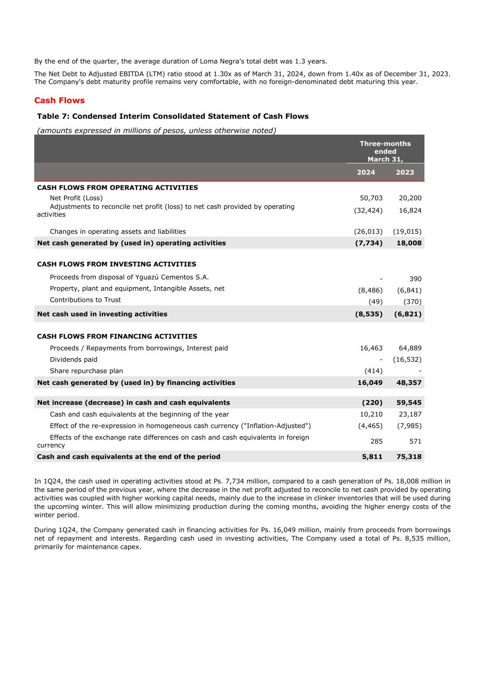 By the end of the quarter, the average duration of Loma Negra’s total debt was 1.3 years. The Net Debt to Adjusted EBITDA (LTM) ratio stood at 1.30x as of March 31, 2024, down from 1.40x as of December 31, 2023. The Company's debt maturity profile remains very comfortable, with no foreign-denominated debt maturing this year. Cash Flows Table 7: Condensed Interim Consolidated Statement of Cash Flows (amounts expressed in millions of pesos, unless otherwise noted) Three-months ended March 31, 2024 2023 CASH FLOWS FROM OPERATING ACTIVITIES Net Profit (Loss) 50,703 20,200 Adjustments to reconcile net profit (loss) to net cash provided by operating activities (32,424) 16,824 Changes in operating assets and liabilities (26,013) (19,015) Net cash generated by (used in) operating activities (7,734) 18,008 CASH FLOWS FROM INVESTING ACTIVITIES Proceeds from disposal of Yguazú Cementos S.A. - 390 Property, plant and equipment, Intangible Assets, net (8,486) (6,841) Contributions to Trust (49) (370) Net cash used in investing activities (8,535) (6,821) CASH FLOWS FROM FINANCING ACTIVITIES Proceeds / Repayments from borrowings, Interest paid 16,463 64,889 Dividends paid - (16,532) Share repurchase plan (414) - Net cash generated by (used in) by financing activities 16,049 48,357 Net increase (decrease) in cash and cash equivalents (220) 59,545 Cash and cash equivalents at the beginning of the year 10,210 23,187 Effect of the re-expression in homogeneous cash currency ("Inflation-Adjusted") (4,465) (7,985) Effects of the exchange rate differences on cash and cash equivalents in foreign currency 285 571 Cash and cash equivalents at the end of the period 5,811 75,318 In 1Q24, the cash used in operating activities stood at Ps. 7,734 million, compared to a cash generation of Ps. 18,008 million in the same period of the previous year, where the decrease in the net profit adjusted to reconcile to net cash provided by operating activities was coupled with higher working capital needs, mainly due to the increase in clinker inventories that will be used during the upcoming winter. This will allow minimizing production during the coming months, avoiding the higher energy costs of the winter period. During 1Q24, the Company generated cash in financing activities for Ps. 16,049 million, mainly from proceeds from borrowings net of repayment and interests. Regarding cash used in investing activities, The Company used a total of Ps. 8,535 million, primarily for maintenance capex.
