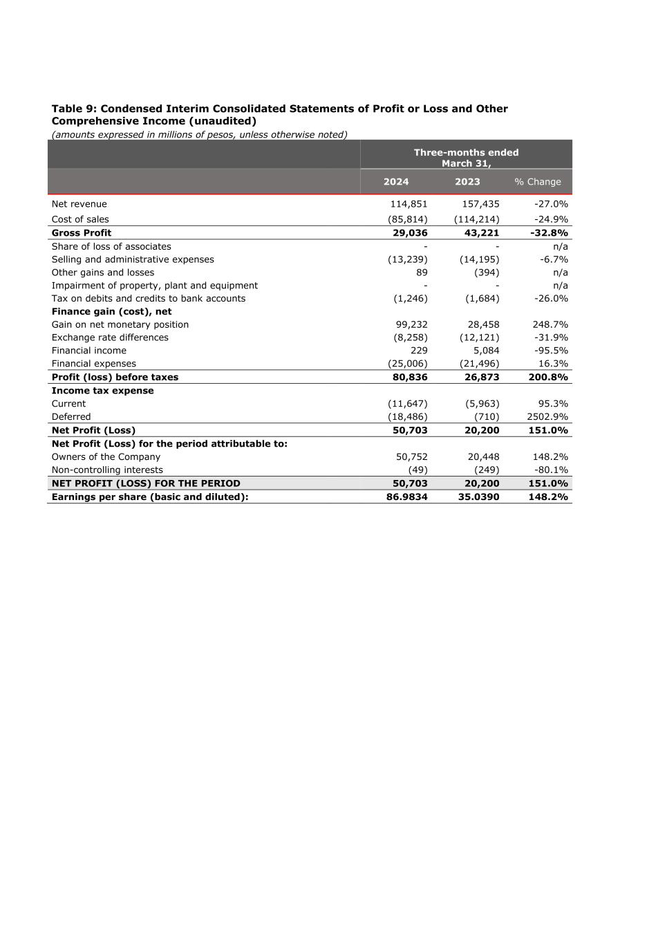 Table 9: Condensed Interim Consolidated Statements of Profit or Loss and Other Comprehensive Income (unaudited) (amounts expressed in millions of pesos, unless otherwise noted) Three-months ended March 31, 2024 2023 % Change Net revenue 114,851 157,435 -27.0% Cost of sales (85,814) (114,214) -24.9% Gross Profit 29,036 43,221 -32.8% Share of loss of associates - - n/a Selling and administrative expenses (13,239) (14,195) -6.7% Other gains and losses 89 (394) n/a Impairment of property, plant and equipment - - n/a Tax on debits and credits to bank accounts (1,246) (1,684) -26.0% Finance gain (cost), net Gain on net monetary position 99,232 28,458 248.7% Exchange rate differences (8,258) (12,121) -31.9% Financial income 229 5,084 -95.5% Financial expenses (25,006) (21,496) 16.3% Profit (loss) before taxes 80,836 26,873 200.8% Income tax expense Current (11,647) (5,963) 95.3% Deferred (18,486) (710) 2502.9% Net Profit (Loss) 50,703 20,200 151.0% Net Profit (Loss) for the period attributable to: Owners of the Company 50,752 20,448 148.2% Non-controlling interests (49) (249) -80.1% NET PROFIT (LOSS) FOR THE PERIOD 50,703 20,200 151.0% Earnings per share (basic and diluted): 86.9834 35.0390 148.2%