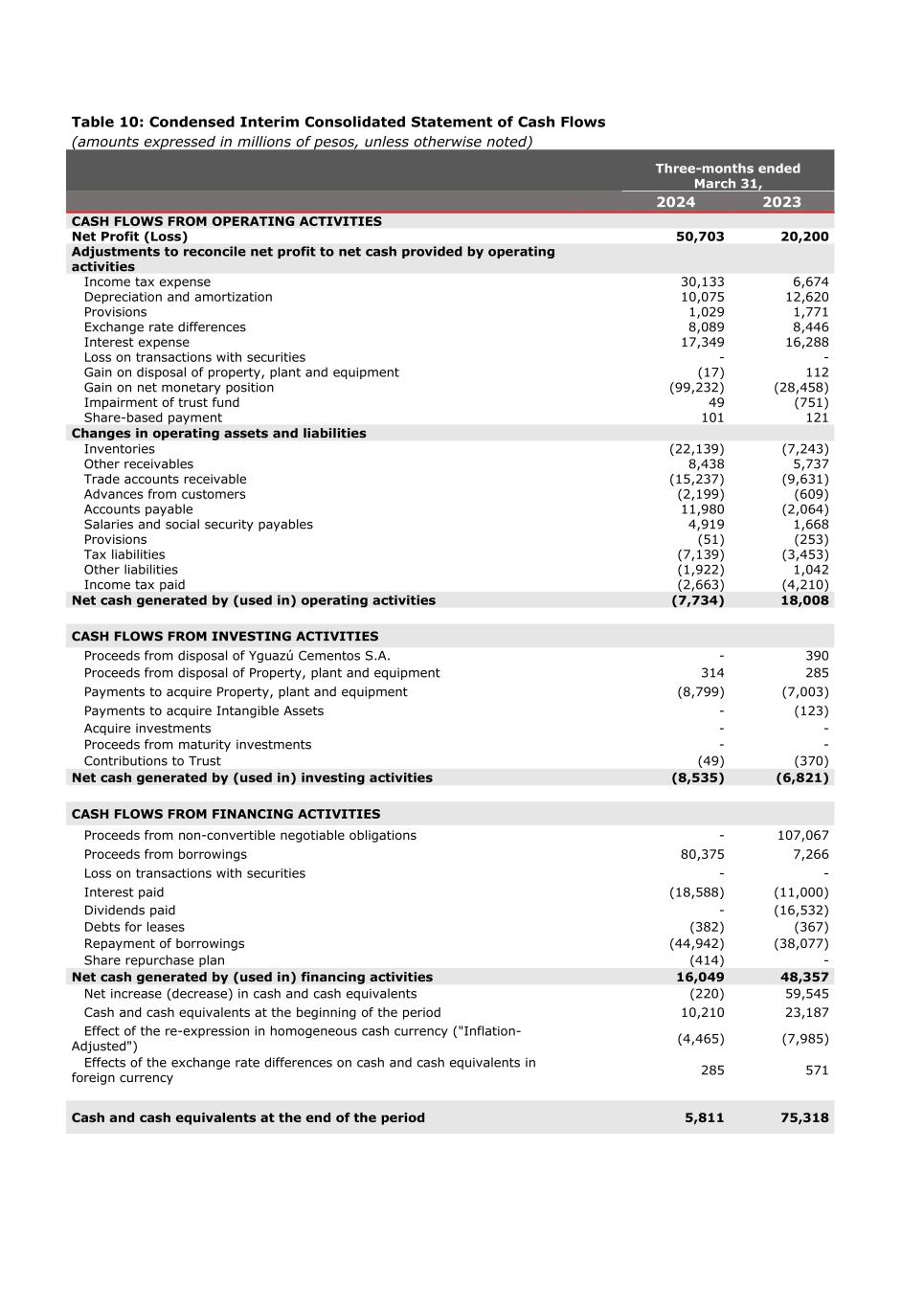 Table 10: Condensed Interim Consolidated Statement of Cash Flows (amounts expressed in millions of pesos, unless otherwise noted) Three-months ended March 31, 2024 2023 CASH FLOWS FROM OPERATING ACTIVITIES Net Profit (Loss) 50,703 20,200 Adjustments to reconcile net profit to net cash provided by operating activities Income tax expense 30,133 6,674 Depreciation and amortization 10,075 12,620 Provisions 1,029 1,771 Exchange rate differences 8,089 8,446 Interest expense 17,349 16,288 Loss on transactions with securities - - Gain on disposal of property, plant and equipment (17) 112 Gain on net monetary position (99,232) (28,458) Impairment of trust fund 49 (751) Share-based payment 101 121 Changes in operating assets and liabilities Inventories (22,139) (7,243) Other receivables 8,438 5,737 Trade accounts receivable (15,237) (9,631) Advances from customers (2,199) (609) Accounts payable 11,980 (2,064) Salaries and social security payables 4,919 1,668 Provisions (51) (253) Tax liabilities (7,139) (3,453) Other liabilities (1,922) 1,042 Income tax paid (2,663) (4,210) Net cash generated by (used in) operating activities (7,734) 18,008 CASH FLOWS FROM INVESTING ACTIVITIES Proceeds from disposal of Yguazú Cementos S.A. - 390 Proceeds from disposal of Property, plant and equipment 314 285 Payments to acquire Property, plant and equipment (8,799) (7,003) Payments to acquire Intangible Assets - (123) Acquire investments - - Proceeds from maturity investments - - Contributions to Trust (49) (370) Net cash generated by (used in) investing activities (8,535) (6,821) CASH FLOWS FROM FINANCING ACTIVITIES Proceeds from non-convertible negotiable obligations - 107,067 Proceeds from borrowings 80,375 7,266 Loss on transactions with securities - - Interest paid (18,588) (11,000) Dividends paid - (16,532) Debts for leases (382) (367) Repayment of borrowings (44,942) (38,077) Share repurchase plan (414) - Net cash generated by (used in) financing activities 16,049 48,357 Net increase (decrease) in cash and cash equivalents (220) 59,545 Cash and cash equivalents at the beginning of the period 10,210 23,187 Effect of the re-expression in homogeneous cash currency ("Inflation- Adjusted") (4,465) (7,985) Effects of the exchange rate differences on cash and cash equivalents in foreign currency 285 571 Cash and cash equivalents at the end of the period 5,811 75,318