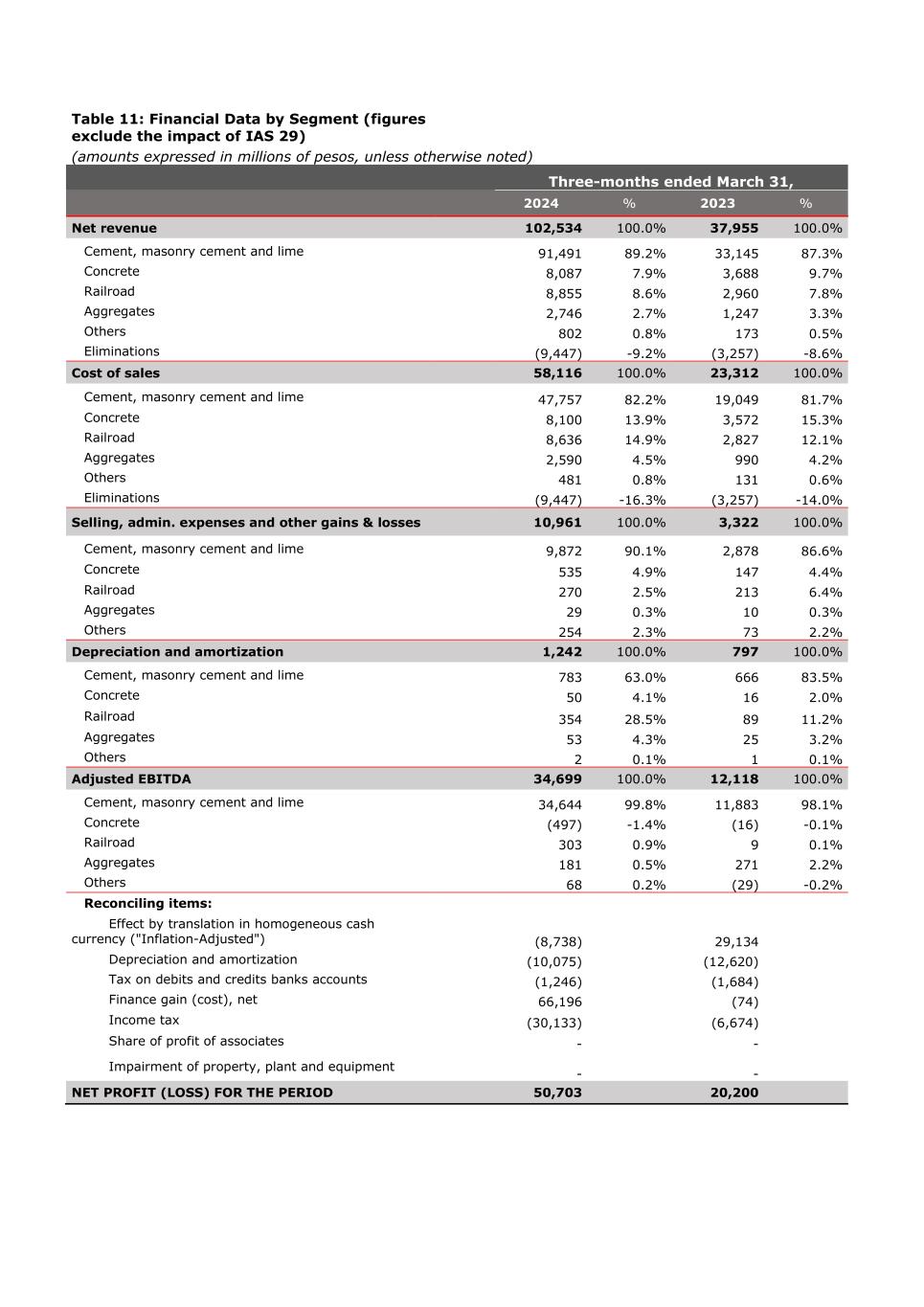 Table 11: Financial Data by Segment (figures exclude the impact of IAS 29) (amounts expressed in millions of pesos, unless otherwise noted) Three-months ended March 31, 2024 % 2023 % Net revenue 102,534 100.0% 37,955 100.0% Cement, masonry cement and lime 91,491 89.2% 33,145 87.3% Concrete 8,087 7.9% 3,688 9.7% Railroad 8,855 8.6% 2,960 7.8% Aggregates 2,746 2.7% 1,247 3.3% Others 802 0.8% 173 0.5% Eliminations (9,447) -9.2% (3,257) -8.6% Cost of sales 58,116 100.0% 23,312 100.0% Cement, masonry cement and lime 47,757 82.2% 19,049 81.7% Concrete 8,100 13.9% 3,572 15.3% Railroad 8,636 14.9% 2,827 12.1% Aggregates 2,590 4.5% 990 4.2% Others 481 0.8% 131 0.6% Eliminations (9,447) -16.3% (3,257) -14.0% Selling, admin. expenses and other gains & losses 10,961 100.0% 3,322 100.0% Cement, masonry cement and lime 9,872 90.1% 2,878 86.6% Concrete 535 4.9% 147 4.4% Railroad 270 2.5% 213 6.4% Aggregates 29 0.3% 10 0.3% Others 254 2.3% 73 2.2% Depreciation and amortization 1,242 100.0% 797 100.0% Cement, masonry cement and lime 783 63.0% 666 83.5% Concrete 50 4.1% 16 2.0% Railroad 354 28.5% 89 11.2% Aggregates 53 4.3% 25 3.2% Others 2 0.1% 1 0.1% Adjusted EBITDA 34,699 100.0% 12,118 100.0% Cement, masonry cement and lime 34,644 99.8% 11,883 98.1% Concrete (497) -1.4% (16) -0.1% Railroad 303 0.9% 9 0.1% Aggregates 181 0.5% 271 2.2% Others 68 0.2% (29) -0.2% Reconciling items: Effect by translation in homogeneous cash currency ("Inflation-Adjusted") (8,738) 29,134 Depreciation and amortization (10,075) (12,620) Tax on debits and credits banks accounts (1,246) (1,684) Finance gain (cost), net 66,196 (74) Income tax (30,133) (6,674) Share of profit of associates - - Impairment of property, plant and equipment - - NET PROFIT (LOSS) FOR THE PERIOD 50,703 20,200