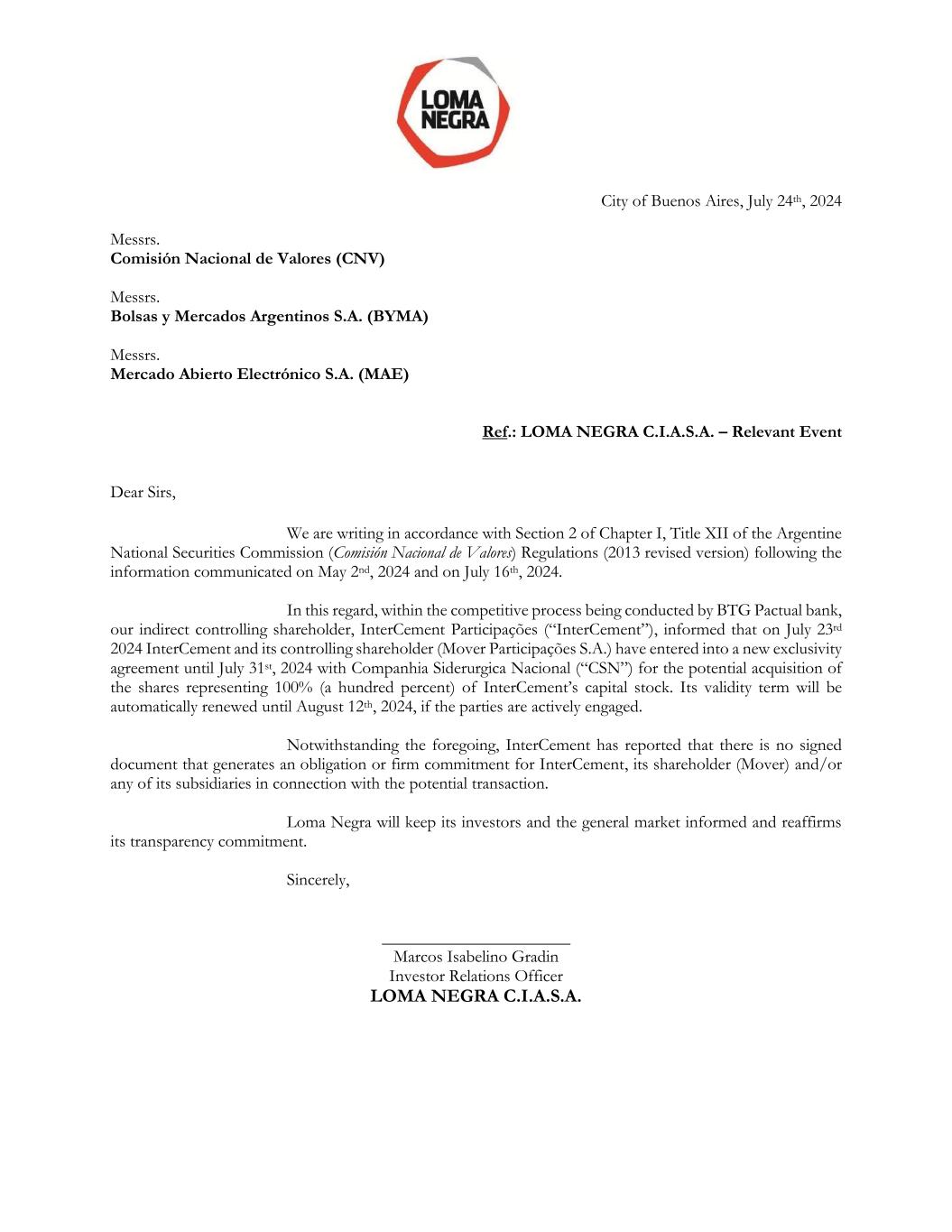 City of Buenos Aires, July 24th, 2024 Messrs. Comisión Nacional de Valores (CNV) Messrs. Bolsas y Mercados Argentinos S.A. (BYMA) Messrs. Mercado Abierto Electrónico S.A. (MAE) Ref.: LOMA NEGRA C.I.A.S.A. – Relevant Event Dear Sirs, We are writing in accordance with Section 2 of Chapter I, Title XII of the Argentine National Securities Commission (Comisión Nacional de Valores) Regulations (2013 revised version) following the information communicated on May 2nd, 2024 and on July 16th, 2024. In this regard, within the competitive process being conducted by BTG Pactual bank, our indirect controlling shareholder, InterCement Participações (“InterCement”), informed that on July 23rd 2024 InterCement and its controlling shareholder (Mover Participações S.A.) have entered into a new exclusivity agreement until July 31st, 2024 with Companhia Siderurgica Nacional (“CSN”) for the potential acquisition of the shares representing 100% (a hundred percent) of InterCement’s capital stock. Its validity term will be automatically renewed until August 12th, 2024, if the parties are actively engaged. Notwithstanding the foregoing, InterCement has reported that there is no signed document that generates an obligation or firm commitment for InterCement, its shareholder (Mover) and/or any of its subsidiaries in connection with the potential transaction. Loma Negra will keep its investors and the general market informed and reaffirms its transparency commitment. Sincerely, ______________________ Marcos Isabelino Gradin Investor Relations Officer LOMA NEGRA C.I.A.S.A.
