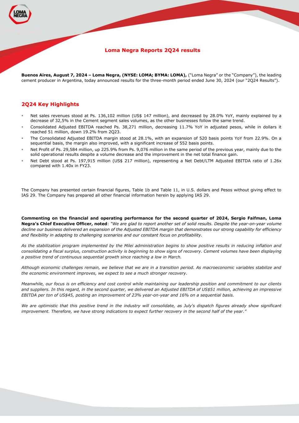 Loma Negra Reports 2Q24 results Buenos Aires, August 7, 2024 – Loma Negra, (NYSE: LOMA; BYMA: LOMA), (“Loma Negra” or the “Company”), the leading cement producer in Argentina, today announced results for the three-month period ended June 30, 2024 (our “2Q24 Results”). 2Q24 Key Highlights ▪ Net sales revenues stood at Ps. 136,102 million (US$ 147 million), and decreased by 28.0% YoY, mainly explained by a decrease of 32,5% in the Cement segment sales volumes, as the other businesses follow the same trend. ▪ Consolidated Adjusted EBITDA reached Ps. 38,271 million, decreasing 11.7% YoY in adjusted pesos, while in dollars it reached 51 million, down 19.2% from 2Q23. ▪ The Consolidated Adjusted EBITDA margin stood at 28.1%, with an expansion of 520 basis points YoY from 22.9%. On a sequential basis, the margin also improved, with a significant increase of 552 basis points. ▪ Net Profit of Ps. 29,584 million, up 225.9% from Ps. 9,076 million in the same period of the previous year, mainly due to the solid operational results despite a volume decrease and the improvement in the net total finance gain. ▪ Net Debt stood at Ps. 197,915 million (US$ 217 million), representing a Net Debt/LTM Adjusted EBITDA ratio of 1.26x compared with 1.40x in FY23. The Company has presented certain financial figures, Table 1b and Table 11, in U.S. dollars and Pesos without giving effect to IAS 29. The Company has prepared all other financial information herein by applying IAS 29. Commenting on the financial and operating performance for the second quarter of 2024, Sergio Faifman, Loma Negra’s Chief Executive Officer, noted: “We are glad to report another set of solid results. Despite the year-on-year volume decline our business delivered an expansion of the Adjusted EBITDA margin that demonstrates our strong capability for efficiency and flexibility in adapting to challenging scenarios and our constant focus on profitability. As the stabilization program implemented by the Milei administration begins to show positive results in reducing inflation and consolidating a fiscal surplus, construction activity is beginning to show signs of recovery. Cement volumes have been displaying a positive trend of continuous sequential growth since reaching a low in March. Although economic challenges remain, we believe that we are in a transition period. As macroeconomic variables stabilize and the economic environment improves, we expect to see a much stronger recovery. Meanwhile, our focus is on efficiency and cost control while maintaining our leadership position and commitment to our clients and suppliers. In this regard, in the second quarter, we delivered an Adjusted EBITDA of US$51 million, achieving an impressive EBITDA per ton of US$45, posting an improvement of 23% year-on-year and 16% on a sequential basis. We are optimistic that this positive trend in the industry will consolidate, as July's dispatch figures already show significant improvement. Therefore, we have strong indications to expect further recovery in the second half of the year.”