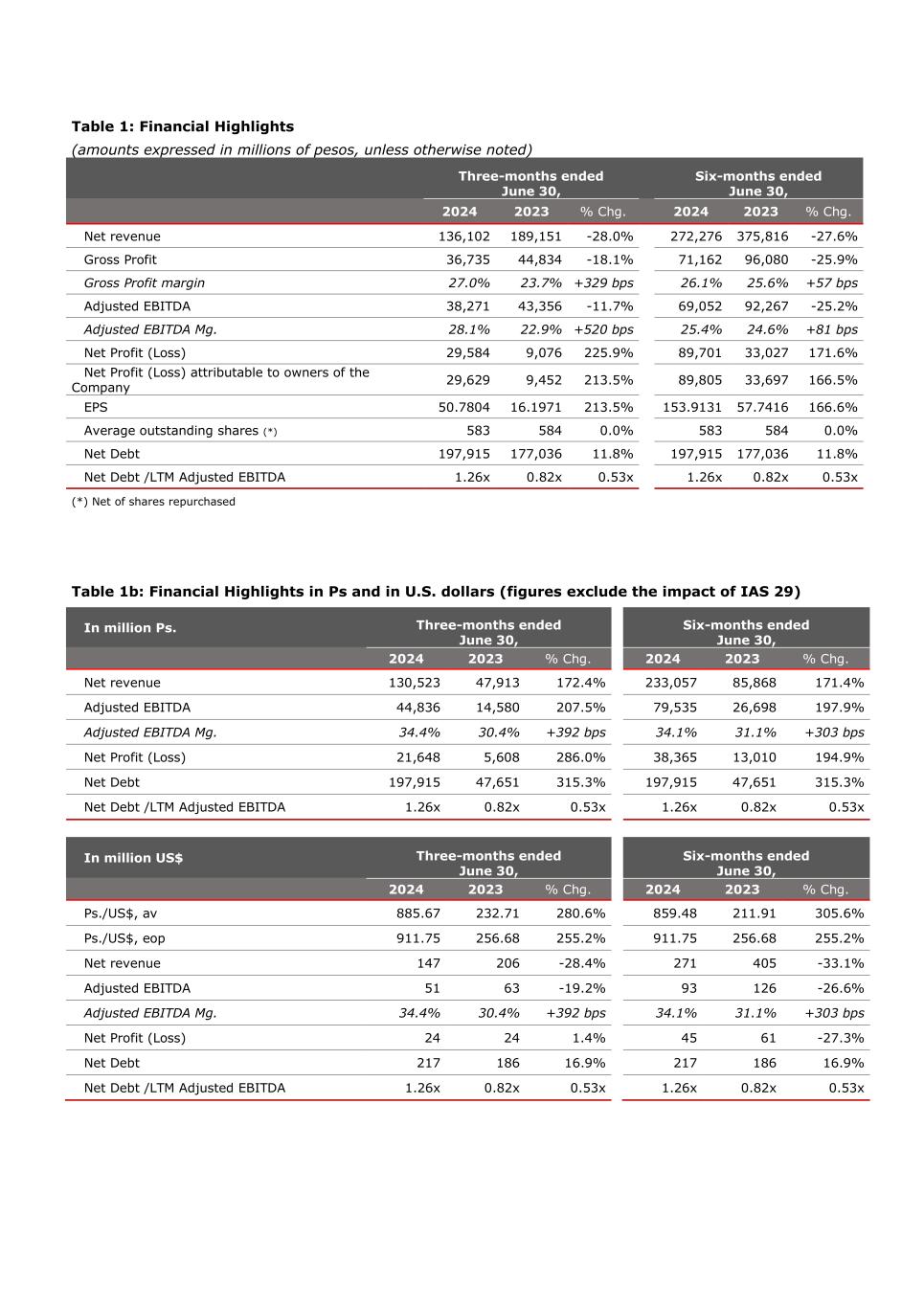 Table 1: Financial Highlights (amounts expressed in millions of pesos, unless otherwise noted) Three-months ended June 30, Six-months ended June 30, 2024 2023 % Chg. 2024 2023 % Chg. Net revenue 136,102 189,151 -28.0% 272,276 375,816 -27.6% Gross Profit 36,735 44,834 -18.1% 71,162 96,080 -25.9% Gross Profit margin 27.0% 23.7% +329 bps 26.1% 25.6% +57 bps Adjusted EBITDA 38,271 43,356 -11.7% 69,052 92,267 -25.2% Adjusted EBITDA Mg. 28.1% 22.9% +520 bps 25.4% 24.6% +81 bps Net Profit (Loss) 29,584 9,076 225.9% 89,701 33,027 171.6% Net Profit (Loss) attributable to owners of the Company 29,629 9,452 213.5% 89,805 33,697 166.5% EPS 50.7804 16.1971 213.5% 153.9131 57.7416 166.6% Average outstanding shares (*) 583 584 0.0% 583 584 0.0% Net Debt 197,915 177,036 11.8% 197,915 177,036 11.8% Net Debt /LTM Adjusted EBITDA 1.26x 0.82x 0.53x 1.26x 0.82x 0.53x (*) Net of shares repurchased Table 1b: Financial Highlights in Ps and in U.S. dollars (figures exclude the impact of IAS 29) In million Ps. Three-months ended June 30, Six-months ended June 30, 2024 2023 % Chg. 2024 2023 % Chg. Net revenue 130,523 47,913 172.4% 233,057 85,868 171.4% Adjusted EBITDA 44,836 14,580 207.5% 79,535 26,698 197.9% Adjusted EBITDA Mg. 34.4% 30.4% +392 bps 34.1% 31.1% +303 bps Net Profit (Loss) 21,648 5,608 286.0% 38,365 13,010 194.9% Net Debt 197,915 47,651 315.3% 197,915 47,651 315.3% Net Debt /LTM Adjusted EBITDA 1.26x 0.82x 0.53x 1.26x 0.82x 0.53x In million US$ Three-months ended June 30, Six-months ended June 30, 2024 2023 % Chg. 2024 2023 % Chg. Ps./US$, av 885.67 232.71 280.6% 859.48 211.91 305.6% Ps./US$, eop 911.75 256.68 255.2% 911.75 256.68 255.2% Net revenue 147 206 -28.4% 271 405 -33.1% Adjusted EBITDA 51 63 -19.2% 93 126 -26.6% Adjusted EBITDA Mg. 34.4% 30.4% +392 bps 34.1% 31.1% +303 bps Net Profit (Loss) 24 24 1.4% 45 61 -27.3% Net Debt 217 186 16.9% 217 186 16.9% Net Debt /LTM Adjusted EBITDA 1.26x 0.82x 0.53x 1.26x 0.82x 0.53x