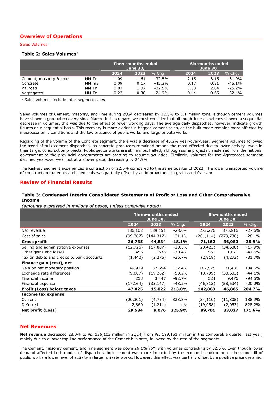 Overview of Operations Sales Volumes Table 2: Sales Volumes2 Three-months ended June 30, Six-months ended June 30, 2024 2023 % Chg. 2024 2023 % Chg. Cement, masonry & lime MM Tn 1.09 1.61 -32.5% 2.15 3.15 -31.9% Concrete MM m3 0.09 0.17 -45.2% 0.17 0.31 -45.1% Railroad MM Tn 0.83 1.07 -22.5% 1.53 2.04 -25.2% Aggregates MM Tn 0.22 0.30 -24.9% 0.44 0.65 -32.4% 2 Sales volumes include inter-segment sales Sales volumes of Cement, masonry, and lime during 2Q24 decreased by 32.5% to 1.1 million tons, although cement volumes have shown a gradual recovery since March. In this regard, we must consider that although June dispatches showed a sequential decrease in volumes, this was due to the effect of fewer working days. The average daily dispatches, however, indicate growth figures on a sequential basis. This recovery is more evident in bagged cement sales, as the bulk mode remains more affected by macroeconomic conditions and the low presence of public works and large private works. Regarding of the volume of the Concrete segment, there was a decrease of 45.2% year-over-year. Segment volumes followed the trend of bulk cement dispatches, as concrete producers remained among the most affected due to lower activity levels in their target construction projects. Public sector works are still almost halted, although some projects transferred from the national government to the provincial governments are starting to resume activities. Similarly, volumes for the Aggregates segment declined year-over-year but at a slower pace, decreasing by 24.9% The Railway segment experienced a contraction of 22.5% compared to the same quarter of 2023. The lower transported volume of construction materials and chemicals was partially offset by an improvement in grains and fracsand. Review of Financial Results Table 3: Condensed Interim Consolidated Statements of Profit or Loss and Other Comprehensive Income (amounts expressed in millions of pesos, unless otherwise noted) Three-months ended June 30, Six-months ended June 30, 2024 2023 % Chg. 2024 2023 % Chg. Net revenue 136,102 189,151 -28.0% 272,276 375,816 -27.6% Cost of sales (99,367) (144,317) -31.1% (201,114) (279,736) -28.1% Gross profit 36,735 44,834 -18.1% 71,162 96,080 -25.9% Selling and administrative expenses (12,726) (17,807) -28.5% (28,423) (34,638) -17.9% Other gains and losses 455 1,538 -70.4% 561 1,071 -47.6% Tax on debits and credits to bank accounts (1,440) (2,276) -36.7% (2,918) (4,272) -31.7% Finance gain (cost), net Gain on net monetary position 49,919 37,694 32.4% 167,575 71,436 134.6% Exchange rate differences (9,007) (19,262) -53.2% (18,799) (33,633) -44.1% Financial income 253 3,447 -92.7% 524 9,476 -94.5% Financial expense (17,164) (33,147) -48.2% (46,813) (58,634) -20.2% Profit (Loss) before taxes 47,025 15,022 213.0% 142,869 46,885 204.7% Income tax expense Current (20,301) (4,734) 328.8% (34,110) (11,805) 188.9% Deferred 2,860 (1,211) n/a (19,058) (2,053) 828.2% Net profit (Loss) 29,584 9,076 225.9% 89,701 33,027 171.6% Net Revenues Net revenue decreased 28.0% to Ps. 136,102 million in 2Q24, from Ps. 189,151 million in the comparable quarter last year, mainly due to a lower top line performance of the Cement business, followed by the rest of the segments. The Cement, masonry cement, and lime segment was down 26.1% YoY, with volumes contracting by 32.5%. Even though lower demand affected both modes of dispatches, bulk cement was more impacted by the economic environment, the standstill of public works a lower level of activity in larger private works. However, this effect was partially offset by a positive price dynamic.