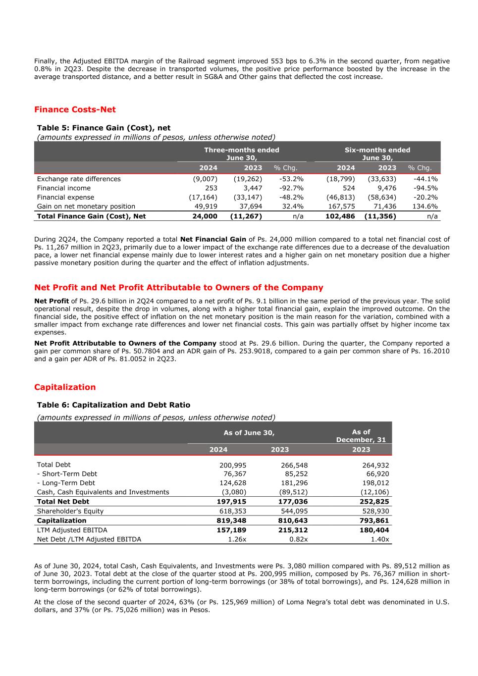 Finally, the Adjusted EBITDA margin of the Railroad segment improved 553 bps to 6.3% in the second quarter, from negative 0.8% in 2Q23. Despite the decrease in transported volumes, the positive price performance boosted by the increase in the average transported distance, and a better result in SG&A and Other gains that deflected the cost increase. Finance Costs-Net Table 5: Finance Gain (Cost), net (amounts expressed in millions of pesos, unless otherwise noted) Three-months ended June 30, Six-months ended June 30, 2024 2023 % Chg. 2024 2023 % Chg. Exchange rate differences (9,007) (19,262) -53.2% (18,799) (33,633) -44.1% Financial income 253 3,447 -92.7% 524 9,476 -94.5% Financial expense (17,164) (33,147) -48.2% (46,813) (58,634) -20.2% Gain on net monetary position 49,919 37,694 32.4% 167,575 71,436 134.6% Total Finance Gain (Cost), Net 24,000 (11,267) n/a 102,486 (11,356) n/a During 2Q24, the Company reported a total Net Financial Gain of Ps. 24,000 million compared to a total net financial cost of Ps. 11,267 million in 2Q23, primarily due to a lower impact of the exchange rate differences due to a decrease of the devaluation pace, a lower net financial expense mainly due to lower interest rates and a higher gain on net monetary position due a higher passive monetary position during the quarter and the effect of inflation adjustments. Net Profit and Net Profit Attributable to Owners of the Company Net Profit of Ps. 29.6 billion in 2Q24 compared to a net profit of Ps. 9.1 billion in the same period of the previous year. The solid operational result, despite the drop in volumes, along with a higher total financial gain, explain the improved outcome. On the financial side, the positive effect of inflation on the net monetary position is the main reason for the variation, combined with a smaller impact from exchange rate differences and lower net financial costs. This gain was partially offset by higher income tax expenses. Net Profit Attributable to Owners of the Company stood at Ps. 29.6 billion. During the quarter, the Company reported a gain per common share of Ps. 50.7804 and an ADR gain of Ps. 253.9018, compared to a gain per common share of Ps. 16.2010 and a gain per ADR of Ps. 81.0052 in 2Q23. Capitalization Table 6: Capitalization and Debt Ratio (amounts expressed in millions of pesos, unless otherwise noted) As of June 30, As of December, 31 2024 2023 2023 Total Debt 200,995 266,548 264,932 - Short-Term Debt 76,367 85,252 66,920 - Long-Term Debt 124,628 181,296 198,012 Cash, Cash Equivalents and Investments (3,080) (89,512) (12,106) Total Net Debt 197,915 177,036 252,825 Shareholder's Equity 618,353 544,095 528,930 Capitalization 819,348 810,643 793,861 LTM Adjusted EBITDA 157,189 215,312 180,404 Net Debt /LTM Adjusted EBITDA 1.26x 0.82x 1.40x As of June 30, 2024, total Cash, Cash Equivalents, and Investments were Ps. 3,080 million compared with Ps. 89,512 million as of June 30, 2023. Total debt at the close of the quarter stood at Ps. 200,995 million, composed by Ps. 76,367 million in short- term borrowings, including the current portion of long-term borrowings (or 38% of total borrowings), and Ps. 124,628 million in long-term borrowings (or 62% of total borrowings). At the close of the second quarter of 2024, 63% (or Ps. 125,969 million) of Loma Negra’s total debt was denominated in U.S. dollars, and 37% (or Ps. 75,026 million) was in Pesos.