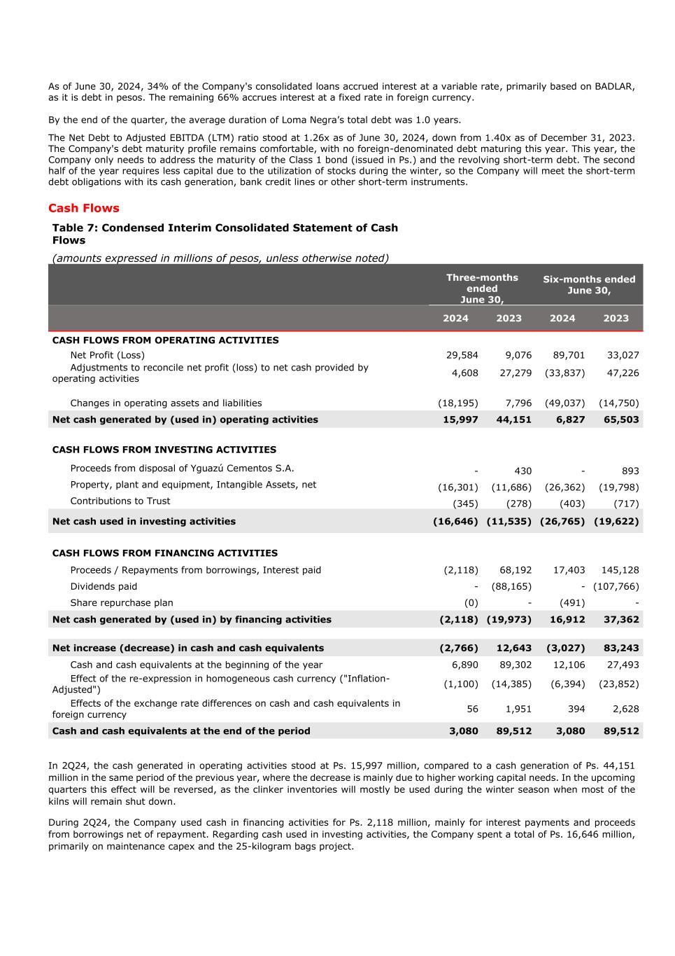 As of June 30, 2024, 34% of the Company's consolidated loans accrued interest at a variable rate, primarily based on BADLAR, as it is debt in pesos. The remaining 66% accrues interest at a fixed rate in foreign currency. By the end of the quarter, the average duration of Loma Negra’s total debt was 1.0 years. The Net Debt to Adjusted EBITDA (LTM) ratio stood at 1.26x as of June 30, 2024, down from 1.40x as of December 31, 2023. The Company's debt maturity profile remains comfortable, with no foreign-denominated debt maturing this year. This year, the Company only needs to address the maturity of the Class 1 bond (issued in Ps.) and the revolving short-term debt. The second half of the year requires less capital due to the utilization of stocks during the winter, so the Company will meet the short-term debt obligations with its cash generation, bank credit lines or other short-term instruments. Cash Flows Table 7: Condensed Interim Consolidated Statement of Cash Flows (amounts expressed in millions of pesos, unless otherwise noted) Three-months ended June 30, Six-months ended June 30, 2024 2023 2024 2023 CASH FLOWS FROM OPERATING ACTIVITIES Net Profit (Loss) 29,584 9,076 89,701 33,027 Adjustments to reconcile net profit (loss) to net cash provided by operating activities 4,608 27,279 (33,837) 47,226 Changes in operating assets and liabilities (18,195) 7,796 (49,037) (14,750) Net cash generated by (used in) operating activities 15,997 44,151 6,827 65,503 CASH FLOWS FROM INVESTING ACTIVITIES Proceeds from disposal of Yguazú Cementos S.A. - 430 - 893 Property, plant and equipment, Intangible Assets, net (16,301) (11,686) (26,362) (19,798) Contributions to Trust (345) (278) (403) (717) Net cash used in investing activities (16,646) (11,535) (26,765) (19,622) CASH FLOWS FROM FINANCING ACTIVITIES Proceeds / Repayments from borrowings, Interest paid (2,118) 68,192 17,403 145,128 Dividends paid - (88,165) - (107,766) Share repurchase plan (0) - (491) - Net cash generated by (used in) by financing activities (2,118) (19,973) 16,912 37,362 Net increase (decrease) in cash and cash equivalents (2,766) 12,643 (3,027) 83,243 Cash and cash equivalents at the beginning of the year 6,890 89,302 12,106 27,493 Effect of the re-expression in homogeneous cash currency ("Inflation- Adjusted") (1,100) (14,385) (6,394) (23,852) Effects of the exchange rate differences on cash and cash equivalents in foreign currency 56 1,951 394 2,628 Cash and cash equivalents at the end of the period 3,080 89,512 3,080 89,512 In 2Q24, the cash generated in operating activities stood at Ps. 15,997 million, compared to a cash generation of Ps. 44,151 million in the same period of the previous year, where the decrease is mainly due to higher working capital needs. In the upcoming quarters this effect will be reversed, as the clinker inventories will mostly be used during the winter season when most of the kilns will remain shut down. During 2Q24, the Company used cash in financing activities for Ps. 2,118 million, mainly for interest payments and proceeds from borrowings net of repayment. Regarding cash used in investing activities, the Company spent a total of Ps. 16,646 million, primarily on maintenance capex and the 25-kilogram bags project.