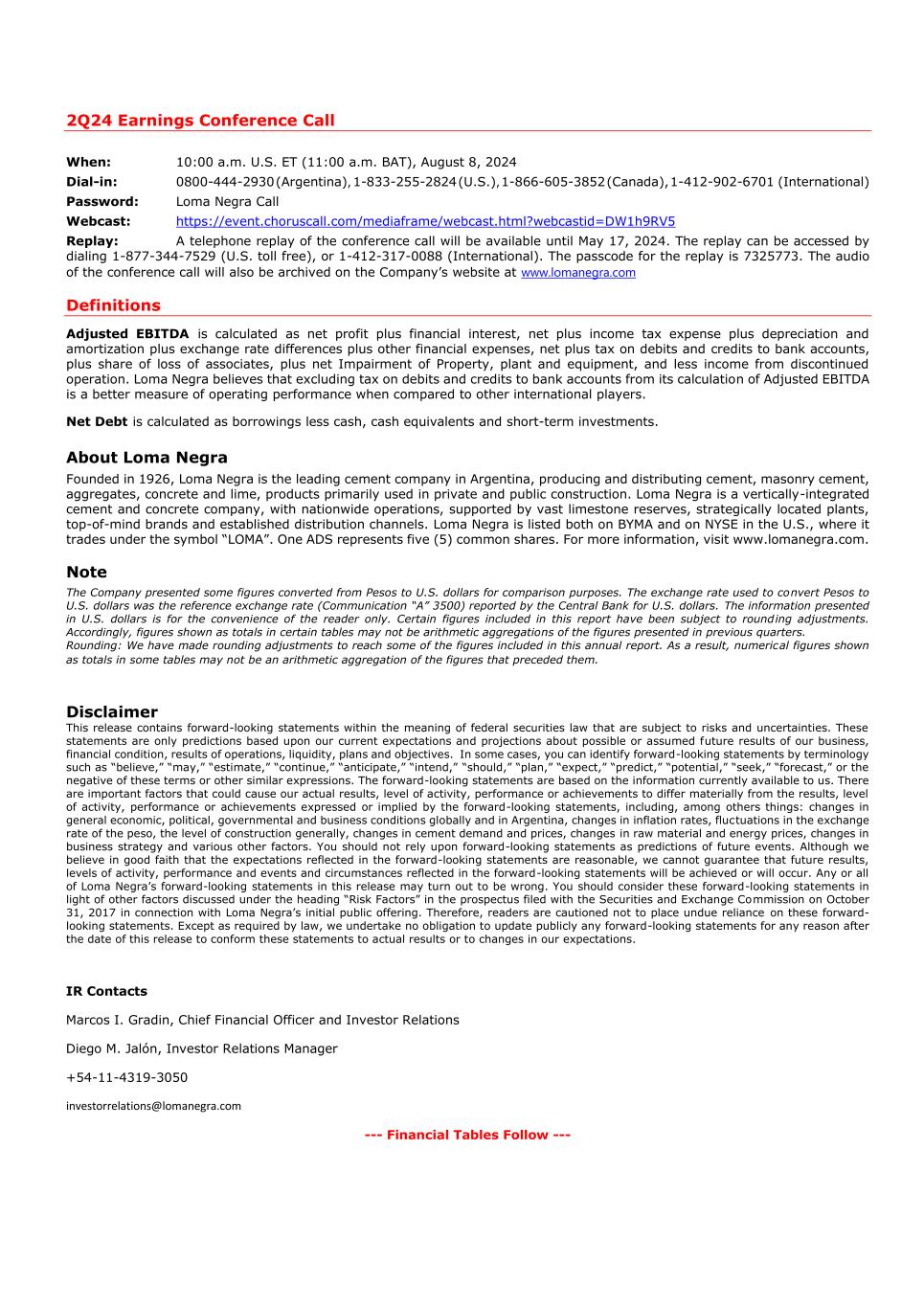 2Q24 Earnings Conference Call When: 10:00 a.m. U.S. ET (11:00 a.m. BAT), August 8, 2024 Dial-in: 0800-444-2930 (Argentina), 1-833-255-2824 (U.S.), 1-866-605-3852 (Canada), 1-412-902-6701 (International) Password: Loma Negra Call Webcast: https://event.choruscall.com/mediaframe/webcast.html?webcastid=DW1h9RV5 Replay: A telephone replay of the conference call will be available until May 17, 2024. The replay can be accessed by dialing 1-877-344-7529 (U.S. toll free), or 1-412-317-0088 (International). The passcode for the replay is 7325773. The audio of the conference call will also be archived on the Company’s website at www.lomanegra.com Definitions Adjusted EBITDA is calculated as net profit plus financial interest, net plus income tax expense plus depreciation and amortization plus exchange rate differences plus other financial expenses, net plus tax on debits and credits to bank accounts, plus share of loss of associates, plus net Impairment of Property, plant and equipment, and less income from discontinued operation. Loma Negra believes that excluding tax on debits and credits to bank accounts from its calculation of Adjusted EBITDA is a better measure of operating performance when compared to other international players. Net Debt is calculated as borrowings less cash, cash equivalents and short-term investments. About Loma Negra Founded in 1926, Loma Negra is the leading cement company in Argentina, producing and distributing cement, masonry cement, aggregates, concrete and lime, products primarily used in private and public construction. Loma Negra is a vertically-integrated cement and concrete company, with nationwide operations, supported by vast limestone reserves, strategically located plants, top-of-mind brands and established distribution channels. Loma Negra is listed both on BYMA and on NYSE in the U.S., where it trades under the symbol “LOMA”. One ADS represents five (5) common shares. For more information, visit www.lomanegra.com. Note The Company presented some figures converted from Pesos to U.S. dollars for comparison purposes. The exchange rate used to convert Pesos to U.S. dollars was the reference exchange rate (Communication “A” 3500) reported by the Central Bank for U.S. dollars. The information presented in U.S. dollars is for the convenience of the reader only. Certain figures included in this report have been subject to rounding adjustments. Accordingly, figures shown as totals in certain tables may not be arithmetic aggregations of the figures presented in previous quarters. Rounding: We have made rounding adjustments to reach some of the figures included in this annual report. As a result, numerical figures shown as totals in some tables may not be an arithmetic aggregation of the figures that preceded them. Disclaimer This release contains forward-looking statements within the meaning of federal securities law that are subject to risks and uncertainties. These statements are only predictions based upon our current expectations and projections about possible or assumed future results of our business, financial condition, results of operations, liquidity, plans and objectives. In some cases, you can identify forward-looking statements by terminology such as “believe,” “may,” “estimate,” “continue,” “anticipate,” “intend,” “should,” “plan,” “expect,” “predict,” “potential,” “seek,” “forecast,” or the negative of these terms or other similar expressions. The forward-looking statements are based on the information currently available to us. There are important factors that could cause our actual results, level of activity, performance or achievements to differ materially from the results, level of activity, performance or achievements expressed or implied by the forward-looking statements, including, among others things: changes in general economic, political, governmental and business conditions globally and in Argentina, changes in inflation rates, fluctuations in the exchange rate of the peso, the level of construction generally, changes in cement demand and prices, changes in raw material and energy prices, changes in business strategy and various other factors. You should not rely upon forward-looking statements as predictions of future events. Although we believe in good faith that the expectations reflected in the forward-looking statements are reasonable, we cannot guarantee that future results, levels of activity, performance and events and circumstances reflected in the forward-looking statements will be achieved or will occur. Any or all of Loma Negra’s forward-looking statements in this release may turn out to be wrong. You should consider these forward-looking statements in light of other factors discussed under the heading “Risk Factors” in the prospectus filed with the Securities and Exchange Commission on October 31, 2017 in connection with Loma Negra’s initial public offering. Therefore, readers are cautioned not to place undue reliance on these forward- looking statements. Except as required by law, we undertake no obligation to update publicly any forward-looking statements for any reason after the date of this release to conform these statements to actual results or to changes in our expectations. IR Contacts Marcos I. Gradin, Chief Financial Officer and Investor Relations Diego M. Jalón, Investor Relations Manager +54-11-4319-3050 investorrelations@lomanegra.com --- Financial Tables Follow ---