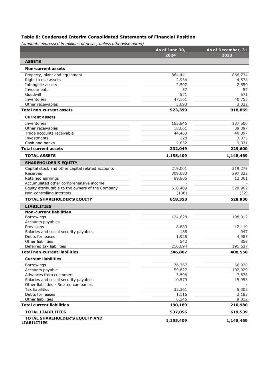 Table 8: Condensed Interim Consolidated Statements of Financial Position (amounts expressed in millions of pesos, unless otherwise noted) As of June 30, As of December, 31 2024 2023 ASSETS Non-current assets Property, plant and equipment 864,441 866,734 Right to use assets 2,934 4,578 Intangible assets 2,502 2,850 Investments 57 57 Goodwill 571 571 Inventories 47,161 40,755 Other receivables 5,693 3,322 Total non-current assets 923,359 918,869 Current assets Inventories 165,845 137,500 Other receivables 18,661 39,097 Trade accounts receivable 44,463 40,897 Investments 228 3,075 Cash and banks 2,852 9,031 Total current assets 232,049 229,600 TOTAL ASSETS 1,155,409 1,148,469 SHAREHOLDER'S EQUITY Capital stock and other capital related accounts 219,001 219,279 Reserves 309,683 297,322 Retained earnings 89,805 12,361 Accumulated other comprehensive income - - Equity attributable to the owners of the Company 618,489 528,962 Non-controlling interests (136) (32) TOTAL SHAREHOLDER'S EQUITY 618,353 528,930 LIABILITIES Non-current liabilities Borrowings 124,628 198,012 Accounts payables - - Provisions 8,889 12,119 Salaries and social security payables 188 947 Debts for leases 1,925 4,985 Other liabilities 542 859 Deferred tax liabilities 210,694 191,637 Total non-current liabilities 346,867 408,558 Current liabilities Borrowings 76,367 66,920 Accounts payable 59,827 102,929 Advances from customers 3,596 7,878 Salaries and social security payables 10,579 15,953 Other liabilities - Related companies - - Tax liabilities 32,361 5,305 Debts for leases 1,116 2,183 Other liabilities 6,345 9,812 Total current liabilities 190,189 210,980 TOTAL LIABILITIES 537,056 619,539 TOTAL SHAREHOLDER'S EQUITY AND LIABILITIES 1,155,409 1,148,469