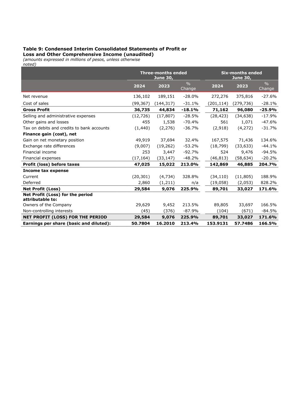 Table 9: Condensed Interim Consolidated Statements of Profit or Loss and Other Comprehensive Income (unaudited) (amounts expressed in millions of pesos, unless otherwise noted) Three-months ended June 30, Six-months ended June 30, 2024 2023 % Change 2024 2023 % Change Net revenue 136,102 189,151 -28.0% 272,276 375,816 -27.6% Cost of sales (99,367) (144,317) -31.1% (201,114) (279,736) -28.1% Gross Profit 36,735 44,834 -18.1% 71,162 96,080 -25.9% Selling and administrative expenses (12,726) (17,807) -28.5% (28,423) (34,638) -17.9% Other gains and losses 455 1,538 -70.4% 561 1,071 -47.6% Tax on debits and credits to bank accounts (1,440) (2,276) -36.7% (2,918) (4,272) -31.7% Finance gain (cost), net Gain on net monetary position 49,919 37,694 32.4% 167,575 71,436 134.6% Exchange rate differences (9,007) (19,262) -53.2% (18,799) (33,633) -44.1% Financial income 253 3,447 -92.7% 524 9,476 -94.5% Financial expenses (17,164) (33,147) -48.2% (46,813) (58,634) -20.2% Profit (loss) before taxes 47,025 15,022 213.0% 142,869 46,885 204.7% Income tax expense Current (20,301) (4,734) 328.8% (34,110) (11,805) 188.9% Deferred 2,860 (1,211) n/a (19,058) (2,053) 828.2% Net Profit (Loss) 29,584 9,076 225.9% 89,701 33,027 171.6% Net Profit (Loss) for the period attributable to: Owners of the Company 29,629 9,452 213.5% 89,805 33,697 166.5% Non-controlling interests (45) (376) -87.9% (104) (671) -84.5% NET PROFIT (LOSS) FOR THE PERIOD 29,584 9,076 225.9% 89,701 33,027 171.6% Earnings per share (basic and diluted): 50.7804 16.2010 213.4% 153.9131 57.7486 166.5%