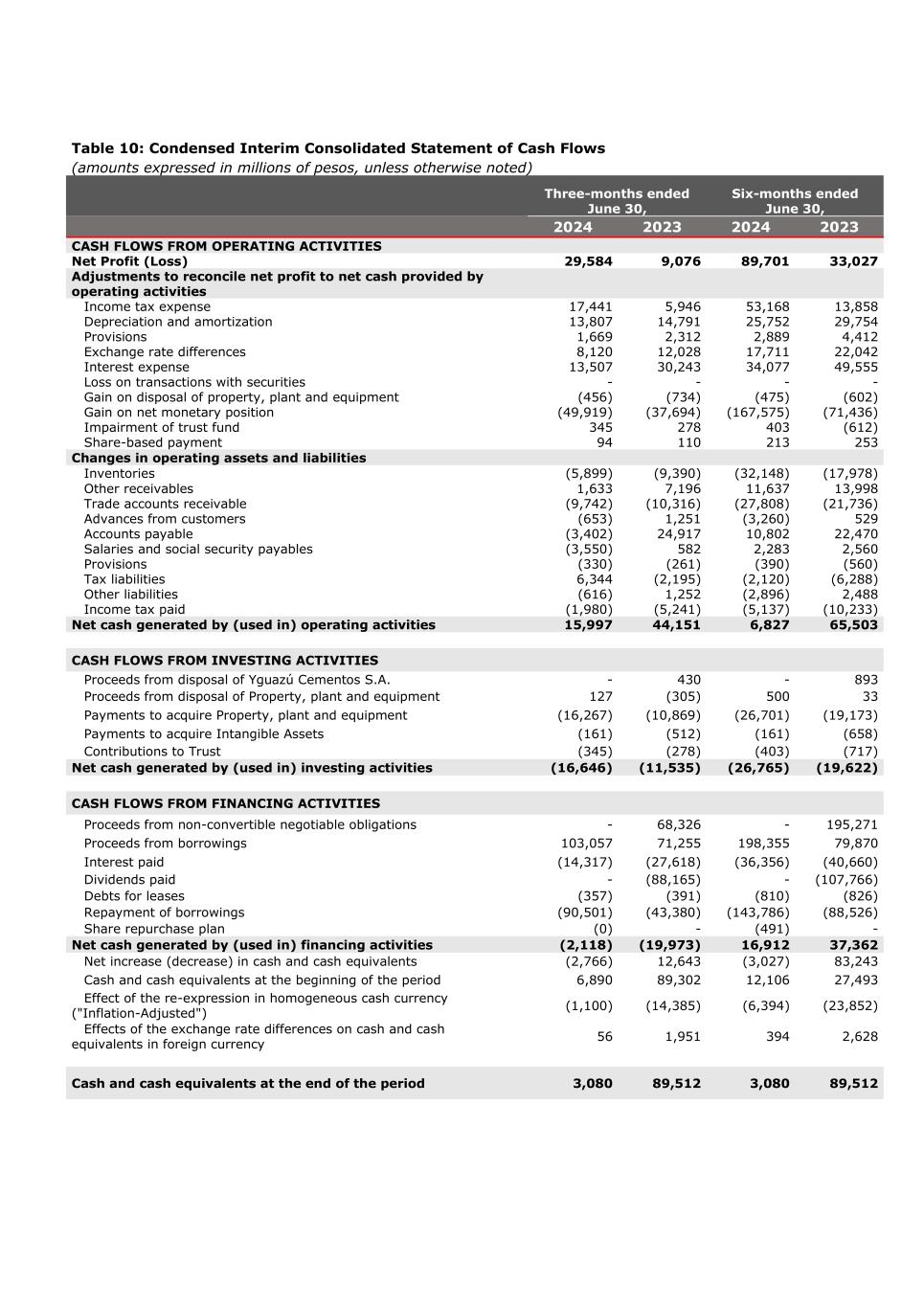 Table 10: Condensed Interim Consolidated Statement of Cash Flows (amounts expressed in millions of pesos, unless otherwise noted) Three-months ended June 30, Six-months ended June 30, 2024 2023 2024 2023 CASH FLOWS FROM OPERATING ACTIVITIES Net Profit (Loss) 29,584 9,076 89,701 33,027 Adjustments to reconcile net profit to net cash provided by operating activities Income tax expense 17,441 5,946 53,168 13,858 Depreciation and amortization 13,807 14,791 25,752 29,754 Provisions 1,669 2,312 2,889 4,412 Exchange rate differences 8,120 12,028 17,711 22,042 Interest expense 13,507 30,243 34,077 49,555 Loss on transactions with securities - - - - Gain on disposal of property, plant and equipment (456) (734) (475) (602) Gain on net monetary position (49,919) (37,694) (167,575) (71,436) Impairment of trust fund 345 278 403 (612) Share-based payment 94 110 213 253 Changes in operating assets and liabilities Inventories (5,899) (9,390) (32,148) (17,978) Other receivables 1,633 7,196 11,637 13,998 Trade accounts receivable (9,742) (10,316) (27,808) (21,736) Advances from customers (653) 1,251 (3,260) 529 Accounts payable (3,402) 24,917 10,802 22,470 Salaries and social security payables (3,550) 582 2,283 2,560 Provisions (330) (261) (390) (560) Tax liabilities 6,344 (2,195) (2,120) (6,288) Other liabilities (616) 1,252 (2,896) 2,488 Income tax paid (1,980) (5,241) (5,137) (10,233) Net cash generated by (used in) operating activities 15,997 44,151 6,827 65,503 CASH FLOWS FROM INVESTING ACTIVITIES Proceeds from disposal of Yguazú Cementos S.A. - 430 - 893 Proceeds from disposal of Property, plant and equipment 127 (305) 500 33 Payments to acquire Property, plant and equipment (16,267) (10,869) (26,701) (19,173) Payments to acquire Intangible Assets (161) (512) (161) (658) Contributions to Trust (345) (278) (403) (717) Net cash generated by (used in) investing activities (16,646) (11,535) (26,765) (19,622) CASH FLOWS FROM FINANCING ACTIVITIES Proceeds from non-convertible negotiable obligations - 68,326 - 195,271 Proceeds from borrowings 103,057 71,255 198,355 79,870 Interest paid (14,317) (27,618) (36,356) (40,660) Dividends paid - (88,165) - (107,766) Debts for leases (357) (391) (810) (826) Repayment of borrowings (90,501) (43,380) (143,786) (88,526) Share repurchase plan (0) - (491) - Net cash generated by (used in) financing activities (2,118) (19,973) 16,912 37,362 Net increase (decrease) in cash and cash equivalents (2,766) 12,643 (3,027) 83,243 Cash and cash equivalents at the beginning of the period 6,890 89,302 12,106 27,493 Effect of the re-expression in homogeneous cash currency ("Inflation-Adjusted") (1,100) (14,385) (6,394) (23,852) Effects of the exchange rate differences on cash and cash equivalents in foreign currency 56 1,951 394 2,628 Cash and cash equivalents at the end of the period 3,080 89,512 3,080 89,512